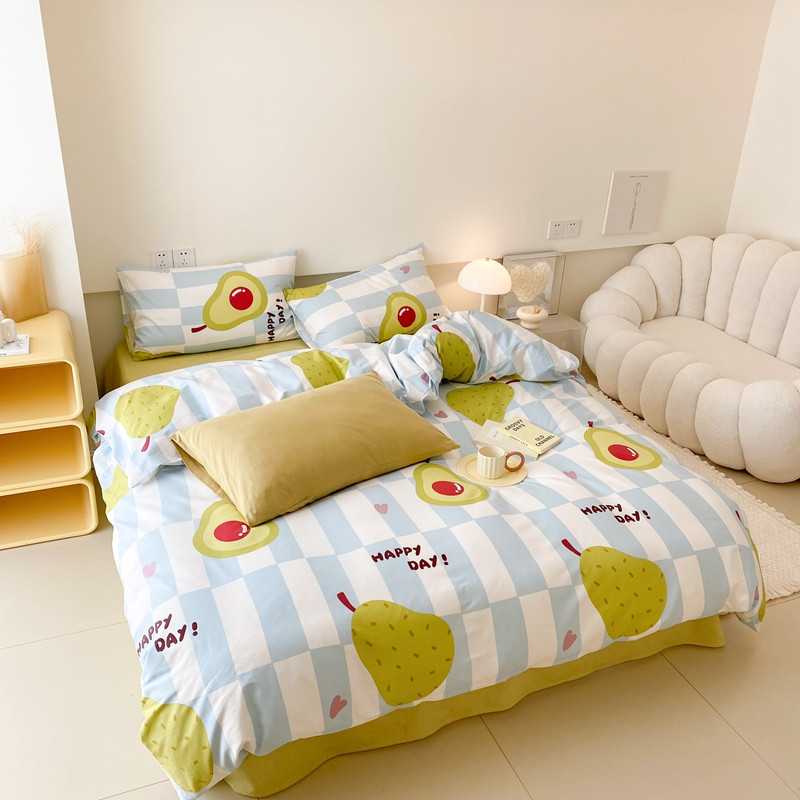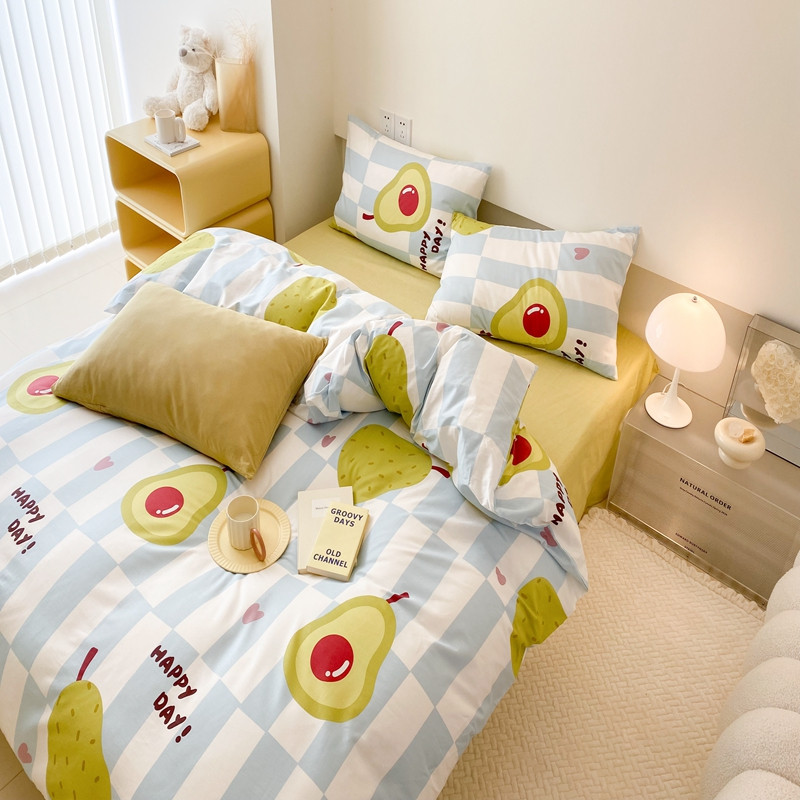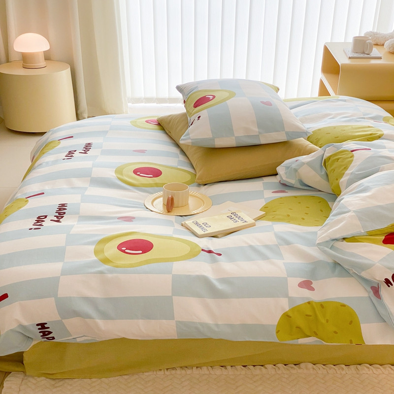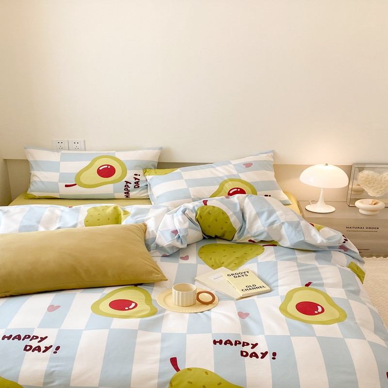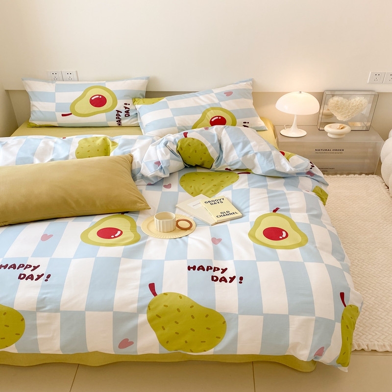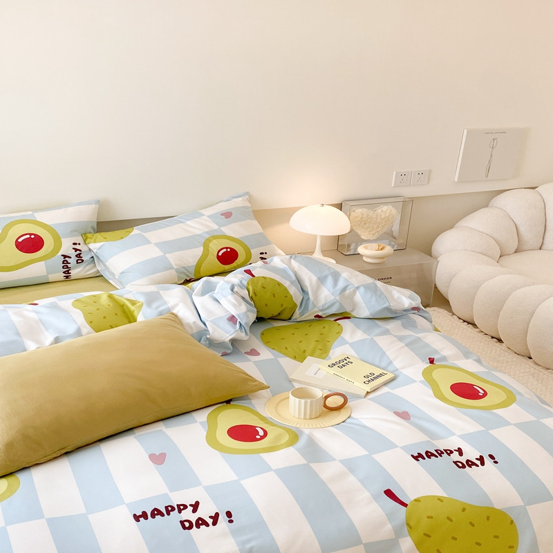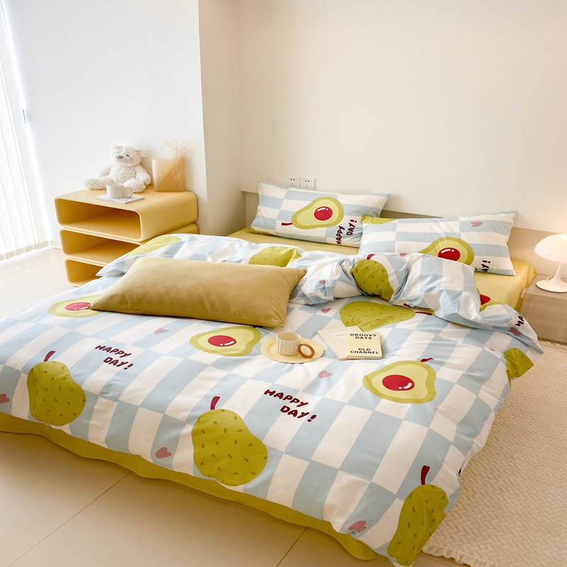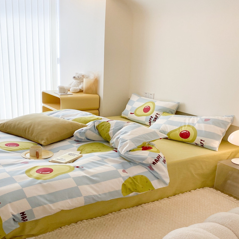 昔可 2022新款全棉四件套影棚图2 蓝棋盘绿果