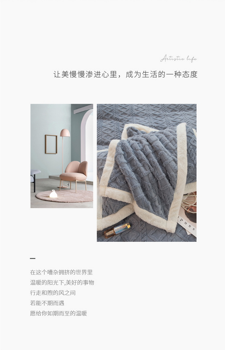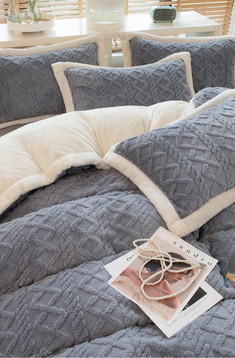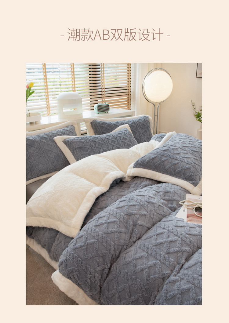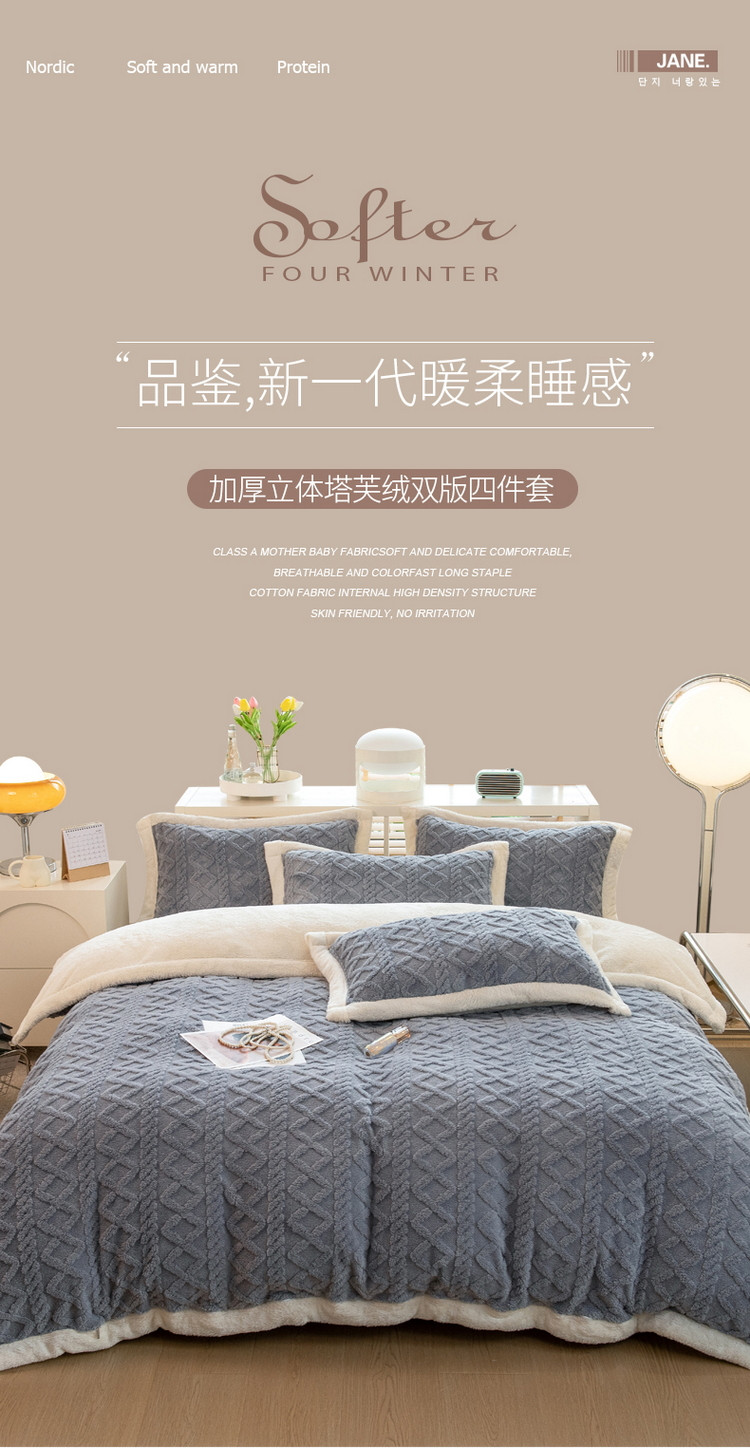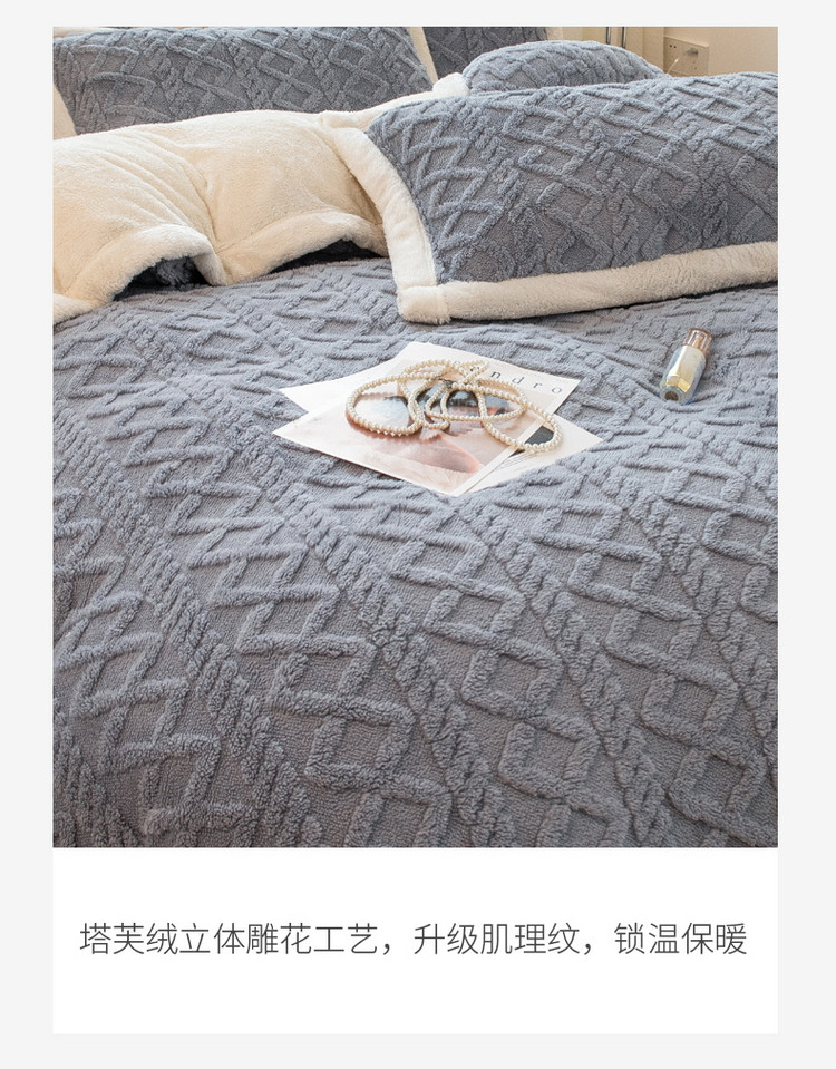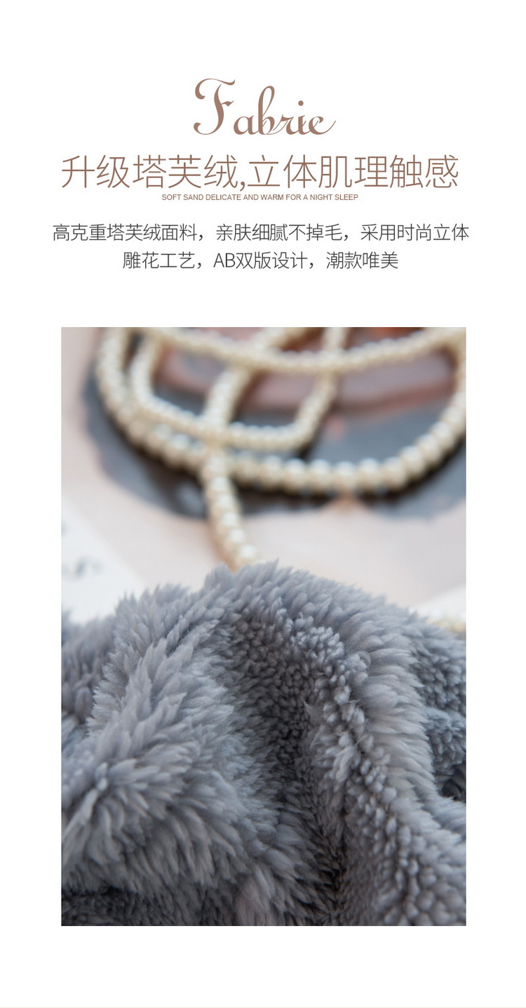 商品名称:丝羽坊 直播爆款220克塔芙绒提花四件套剪花雕花牛奶绒 蓝灰