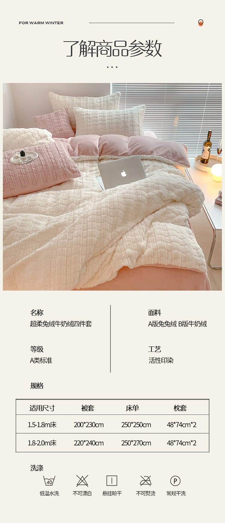 商品名称:满座直播爆款高端9斤320克A类獭兔毛绒立体剪花纯色牛奶绒四件套白加咖