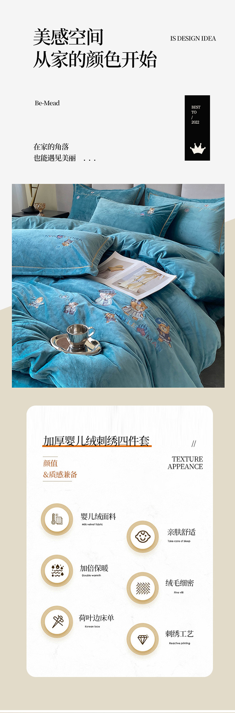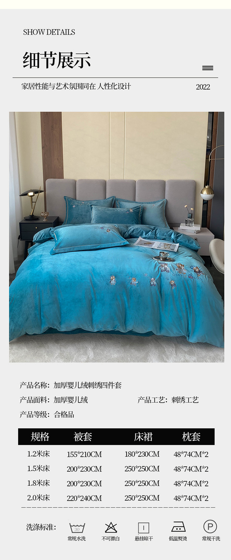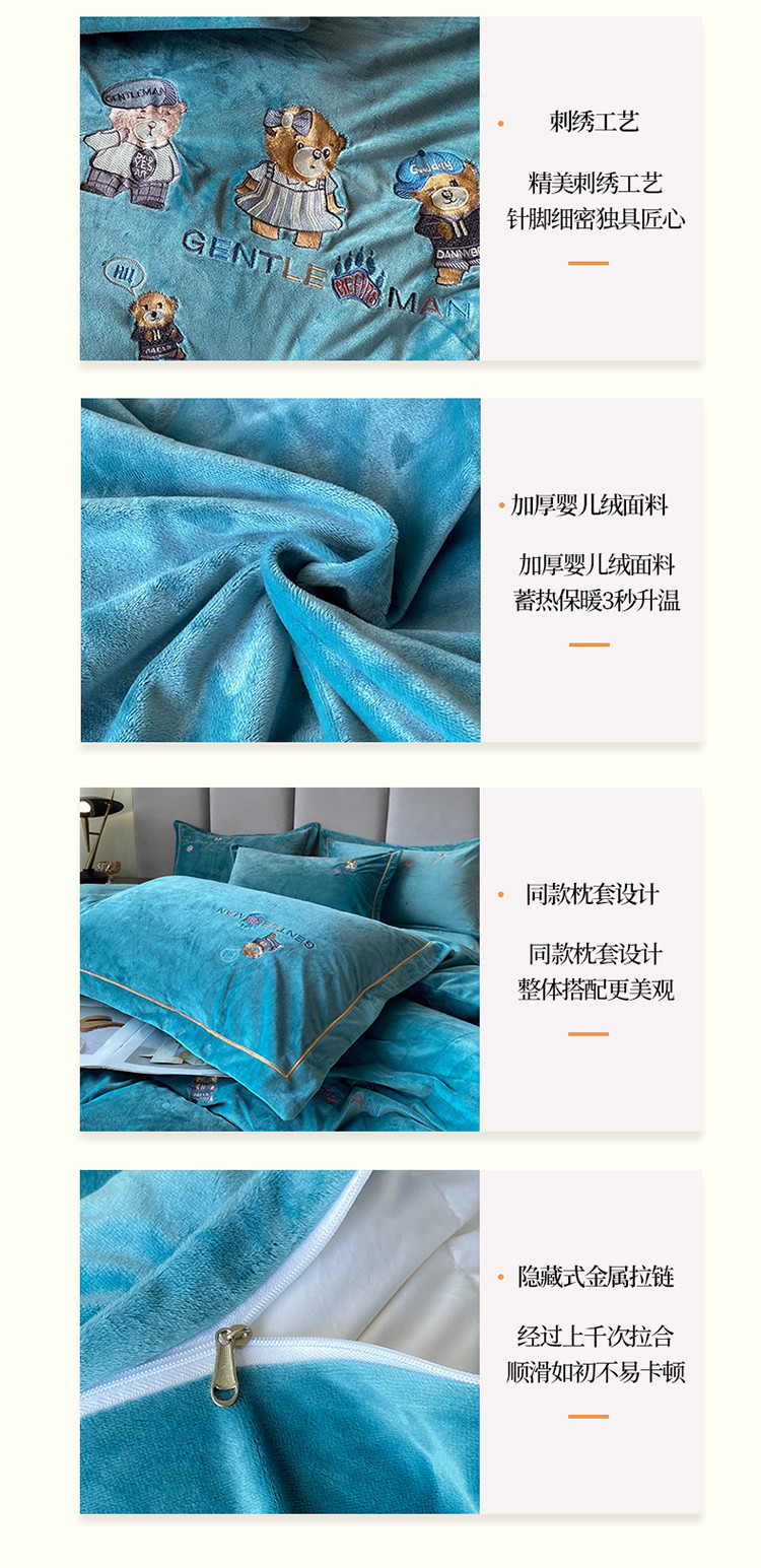 云锦 2022秋冬新品加厚婴儿绒刺绣四件套 可爱熊-宝石蓝
