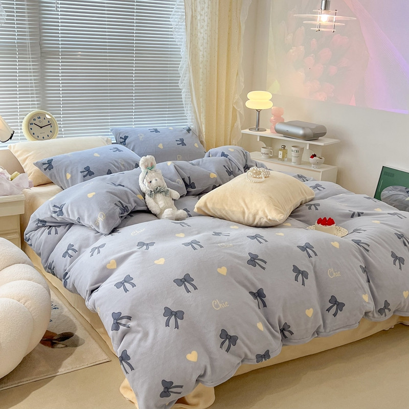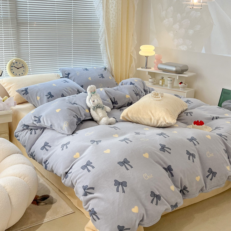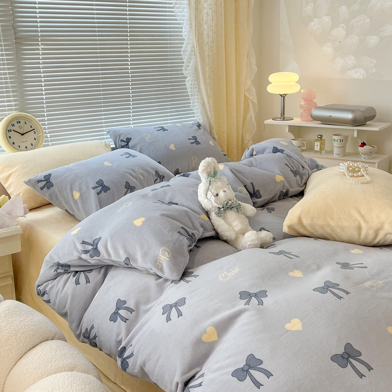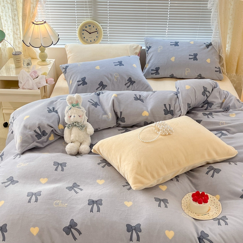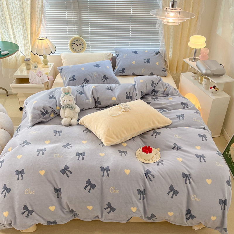 昔可 2022新款牛奶绒少女小清新系列四件套 爱心蝴蝶结