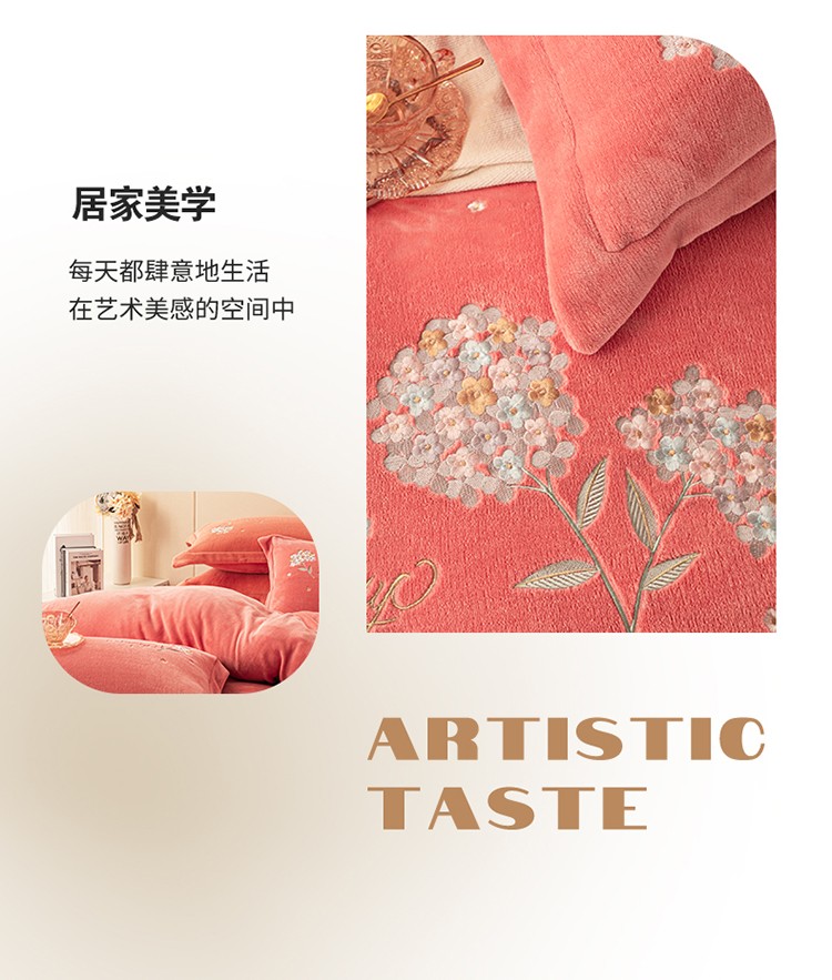 商品名称:名品优仓 2022新款刺绣牛奶绒200克四件套-绣花球 粉玉