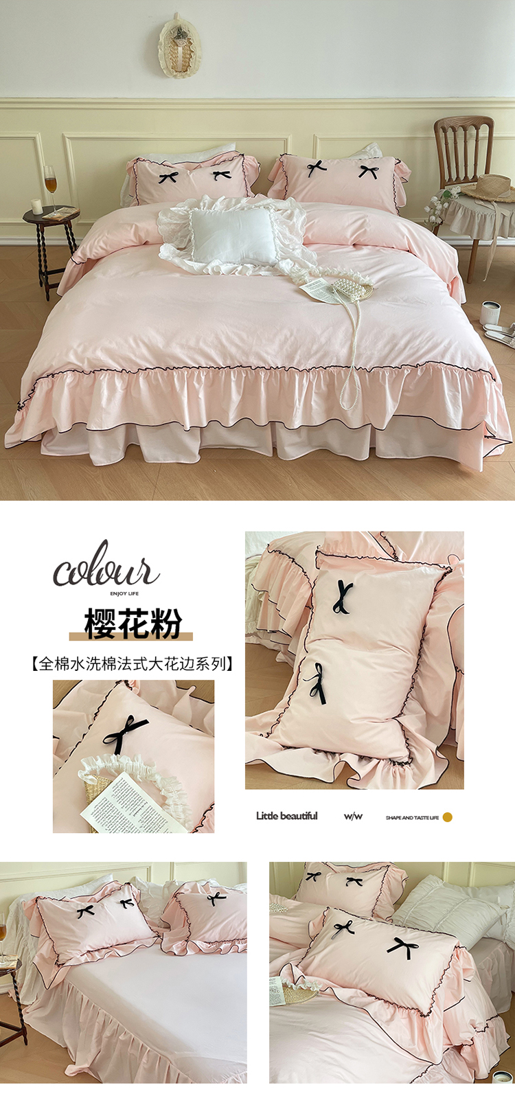 商品名称:嗨购 2023新款40S全棉水洗棉法式大花边四件套(场景一) 樱花粉
