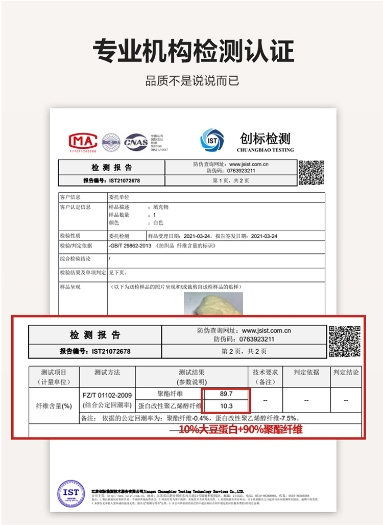 填充纤维种类: 大豆蛋白改性聚酯纤维