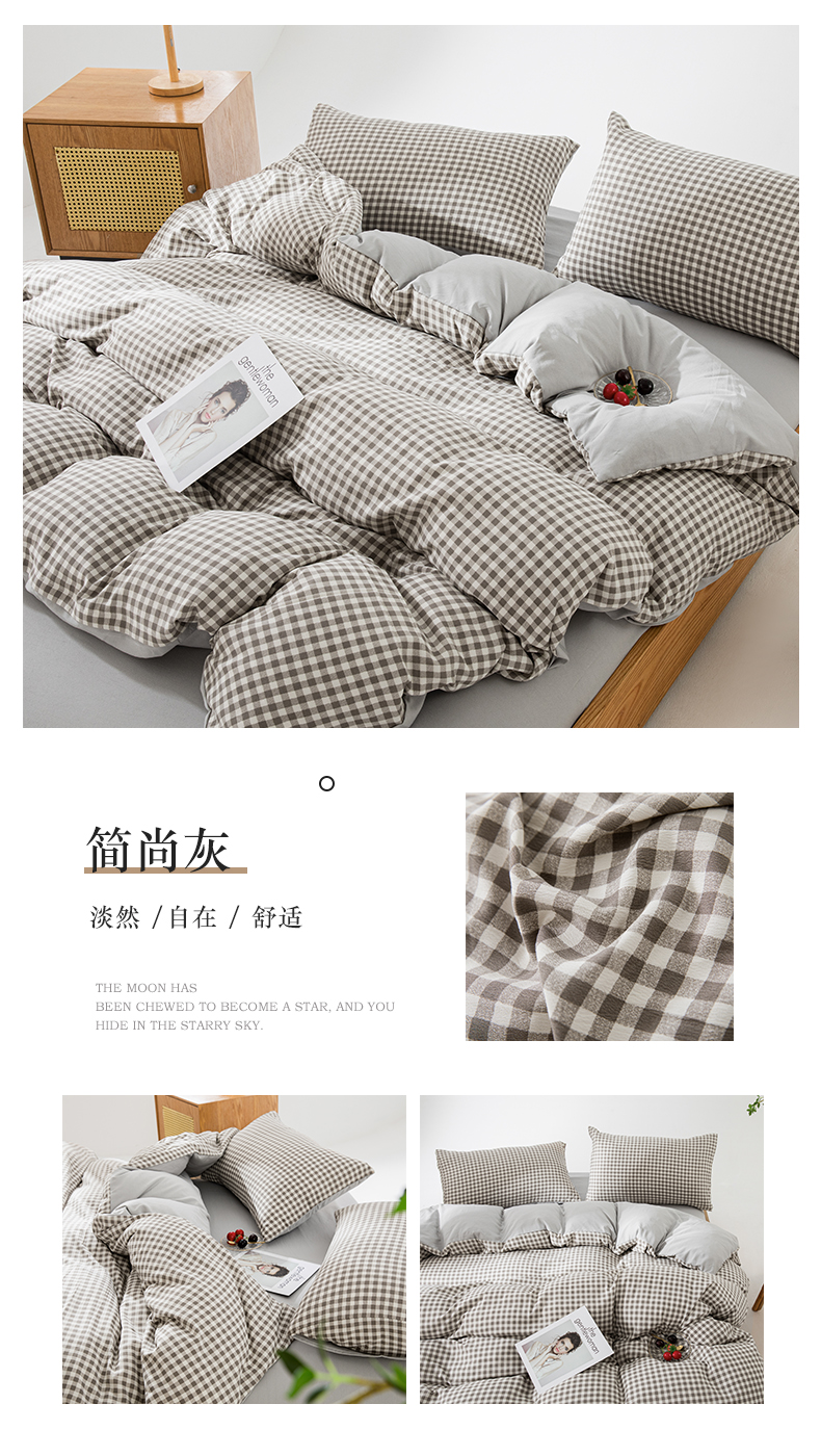 当前位置: 91家纺网 > 商品网购 > 床品套件 > 四件套 > 水洗棉四件套 > 宏源家纺 2023年4月新款水洗棉麻简约格子四件套 简尚灰