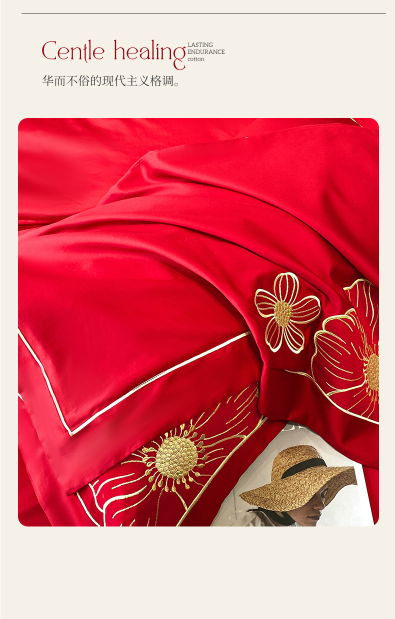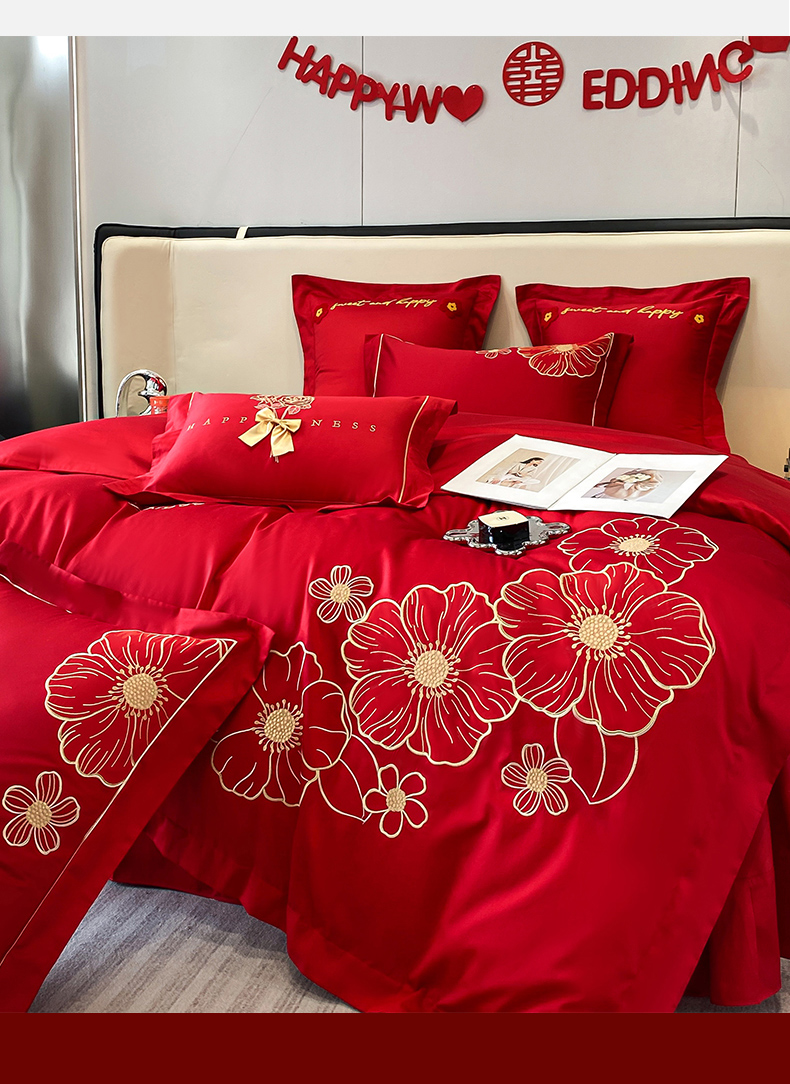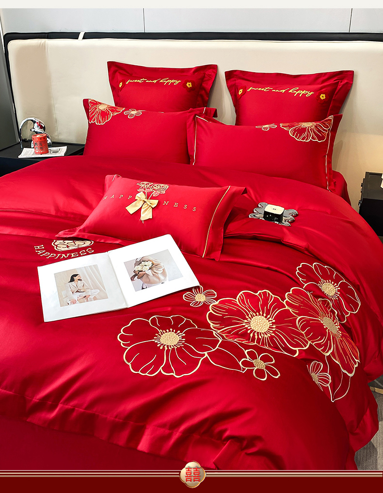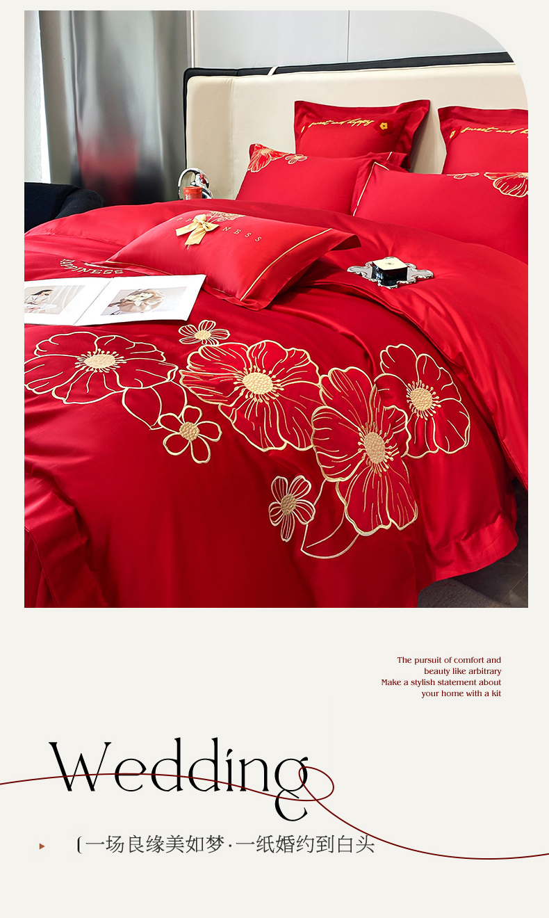 798家纺 2023新款60支全棉贡缎绣花婚庆四件套 花开富贵