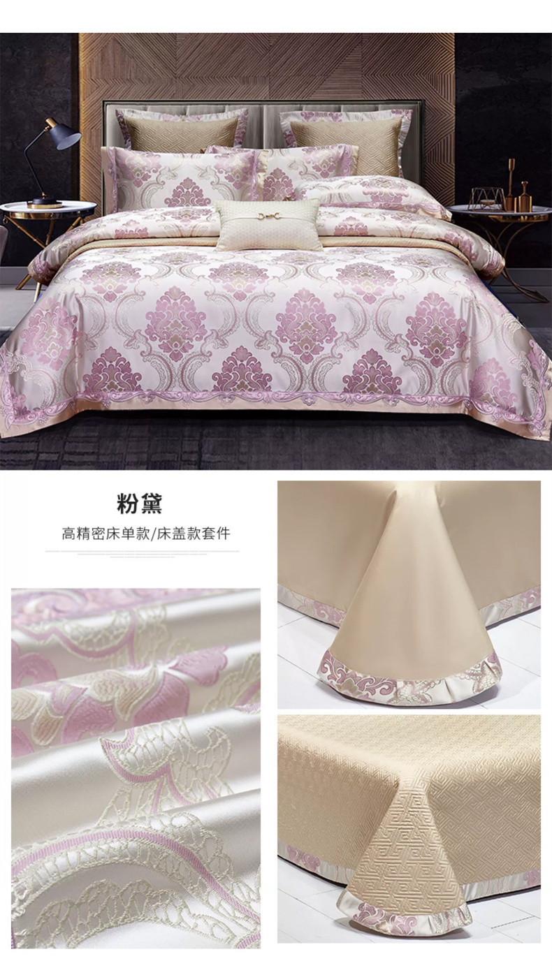 当前位置: 91家纺网 > 商品网购 > 床品套件 > 四件套 > 提花四件套 > 嘉恋 2023新款欧式高精密绣边锦缎提花四六件套 粉黛