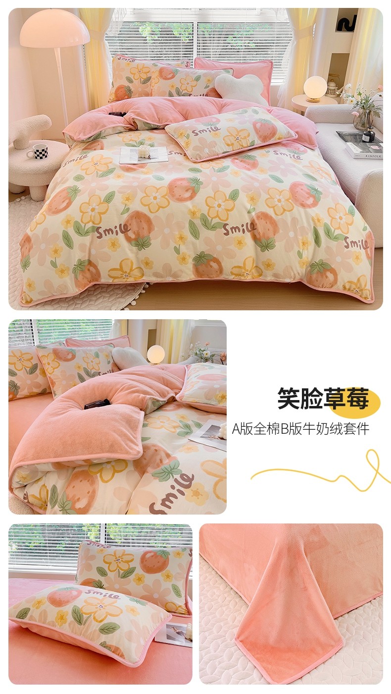 琪琪阁 2023新款A棉B绒棉加绒牛奶绒四件套单被套 笑脸草莓,笑脸草莓