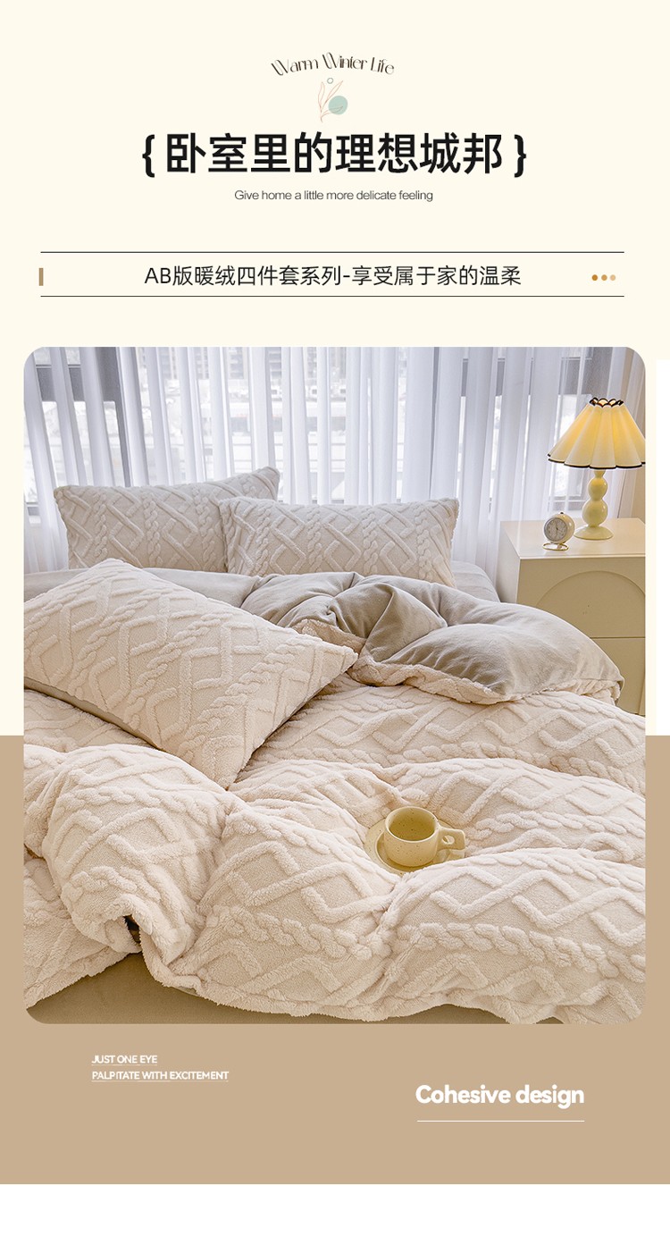 欧冠 2023秋冬加厚塔芙绒简约款牛奶绒四件套 奶白灰