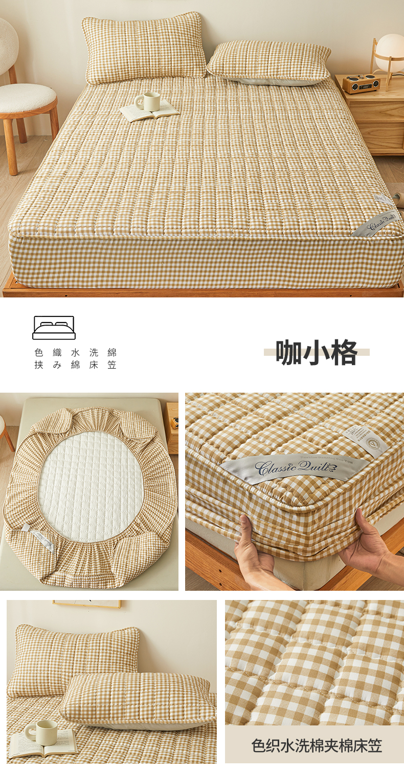 (总)2023新款直播爆款水洗棉夹棉床笠三件套,咖小格,粉大格,粉小格,绿小格,蓝大格,蓝小格