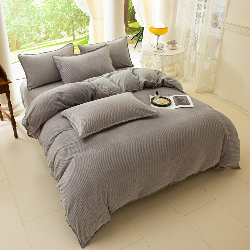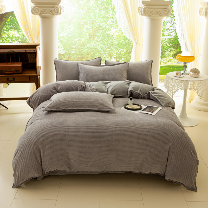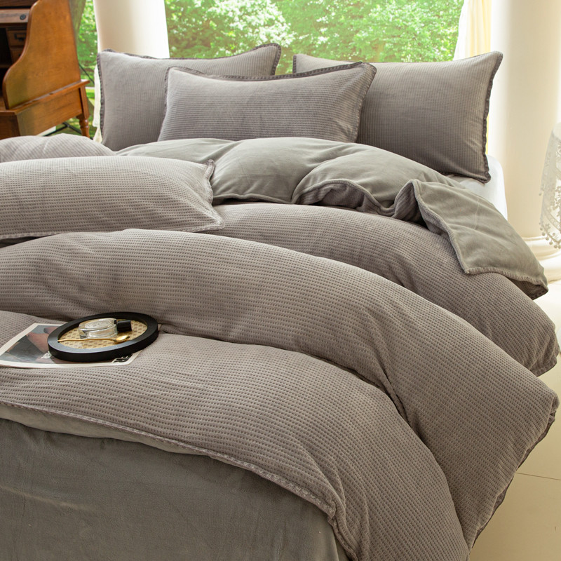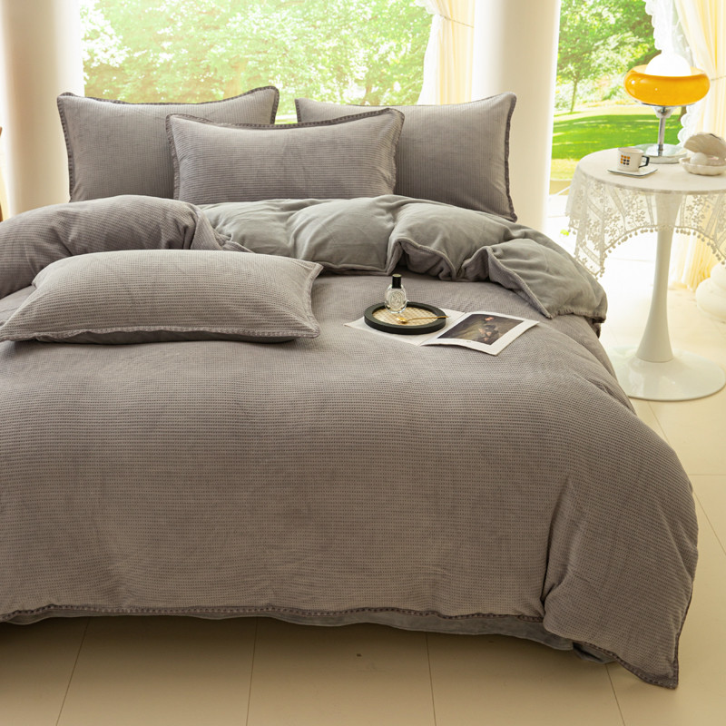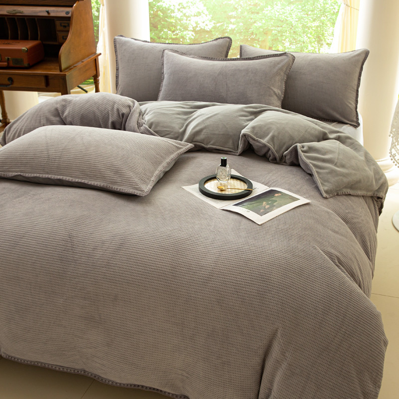 商品名称:邦妮 2024新款华夫格牛奶绒贝壳边四件套 华夫格-高级灰