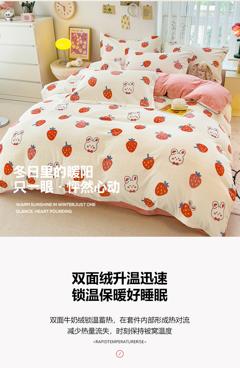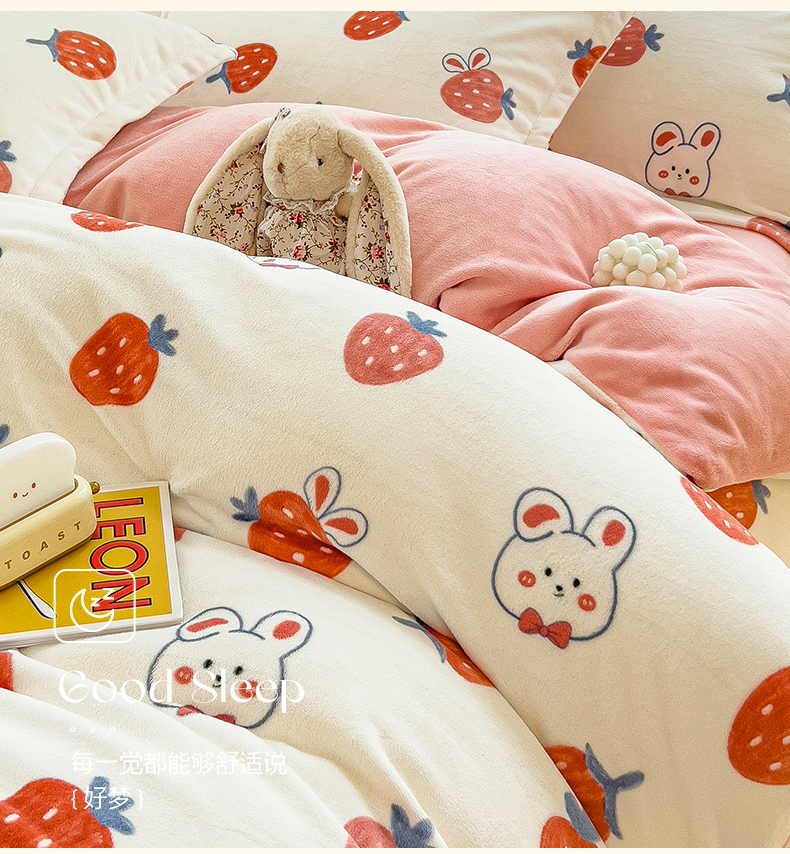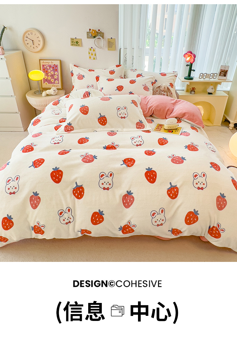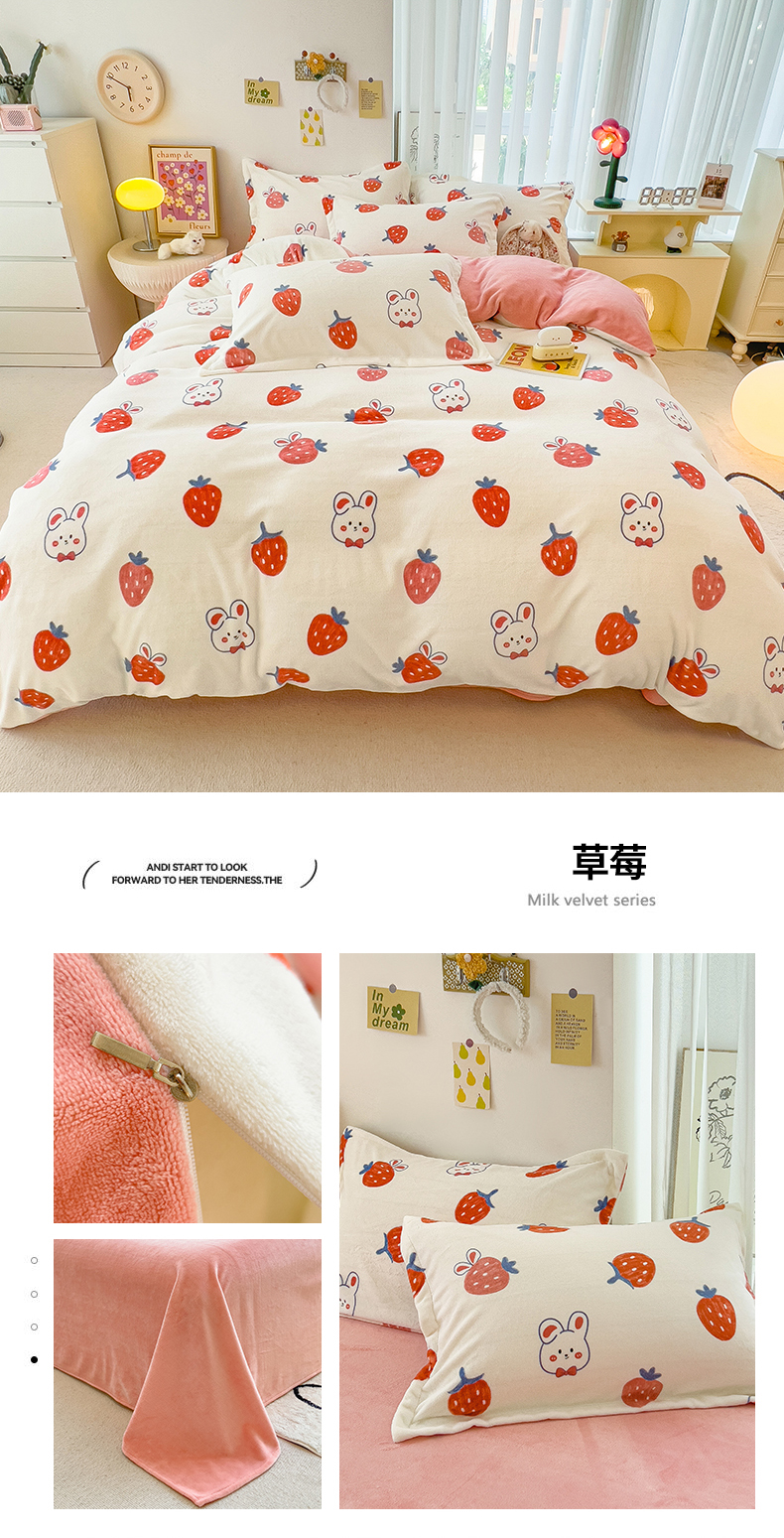 商品名称:全季家居2023新款小清新A类高克重加厚印花牛奶绒四件套 草莓