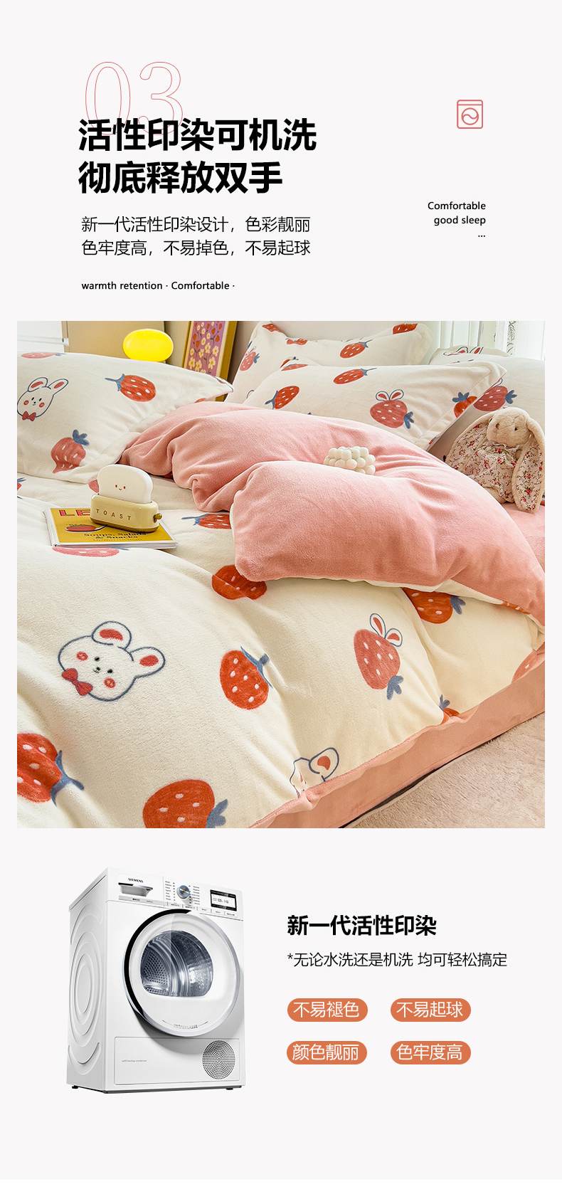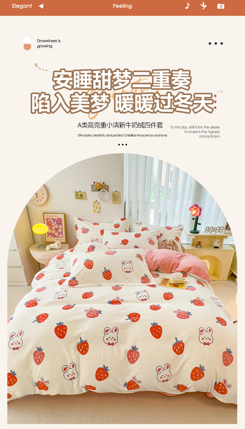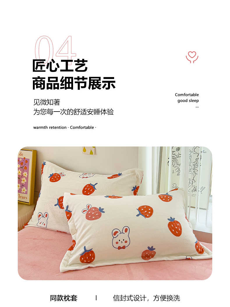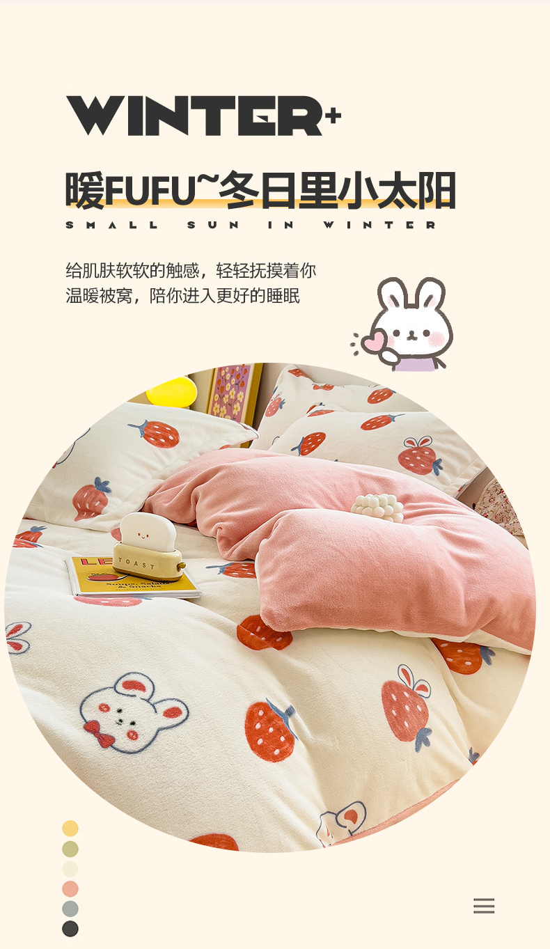 商品名称:全季家居2023新款小清新A类高克重加厚印花牛奶绒四件套 草莓