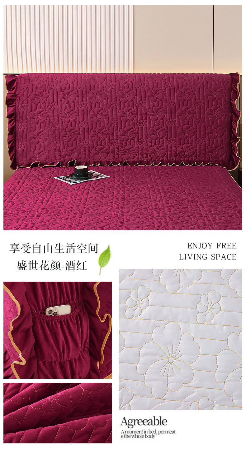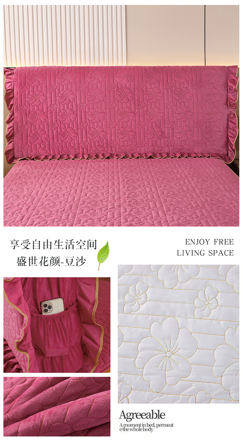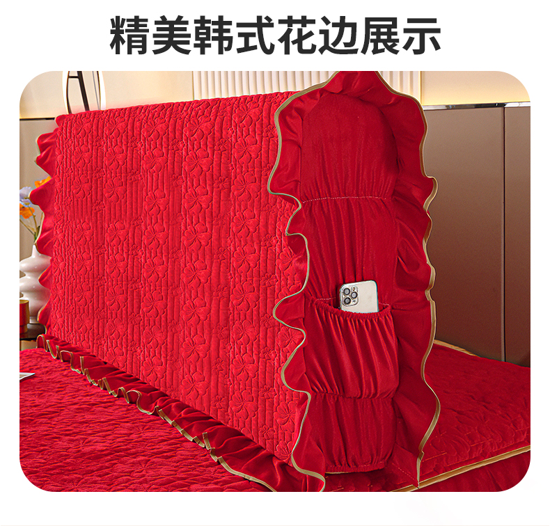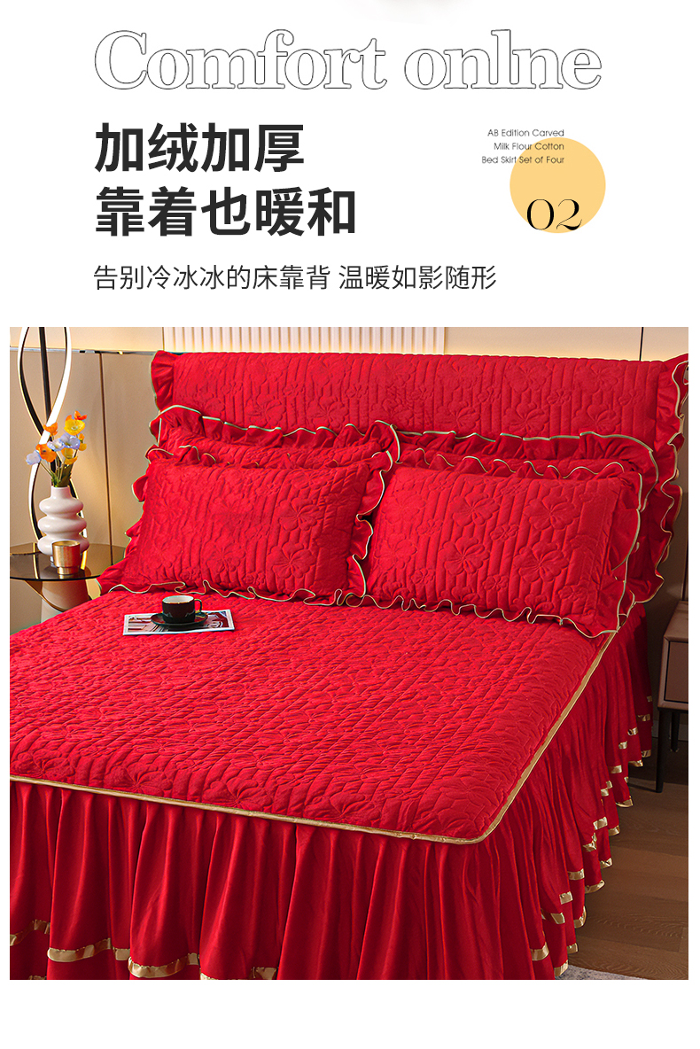 (总)屹成家纺2025新款水晶绒夹棉绗缝蕾丝床裙三件套(塞纳河畔)床裙单件起售价不低于105元,大红,豆沙,翡翠绿,粉玉,橄榄绿,蔚蓝,银灰