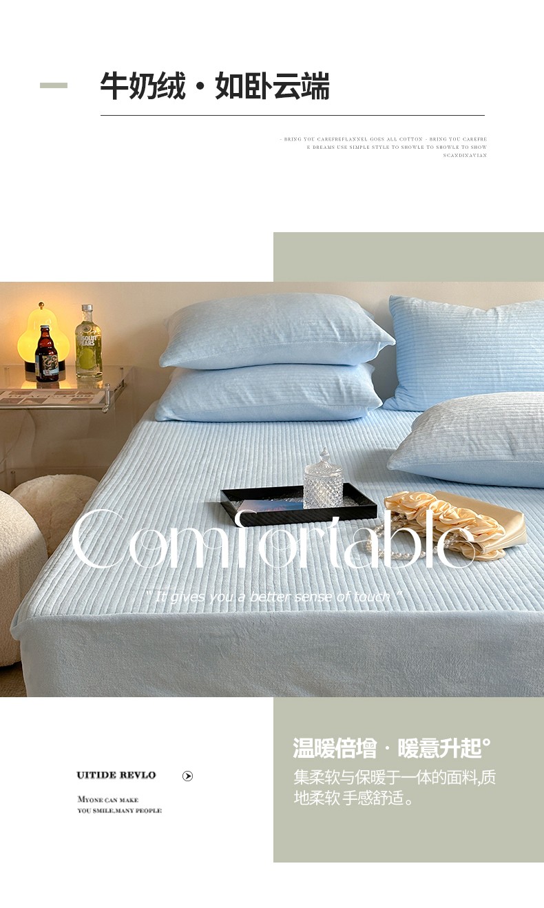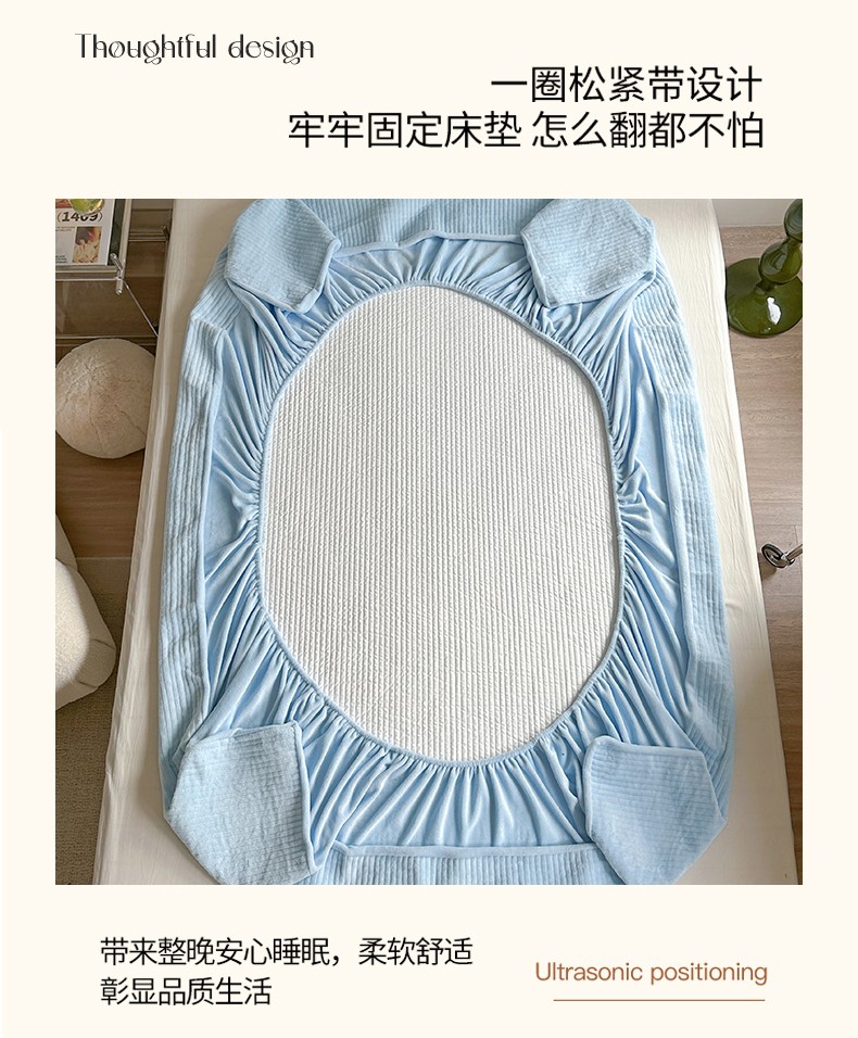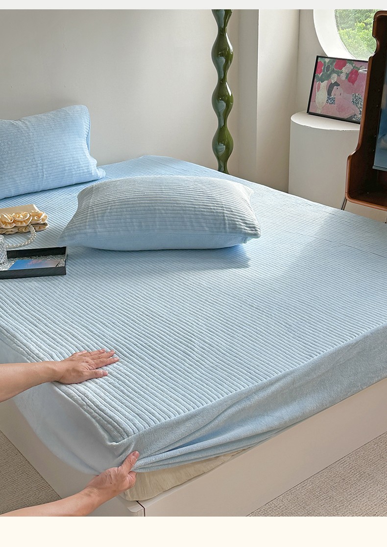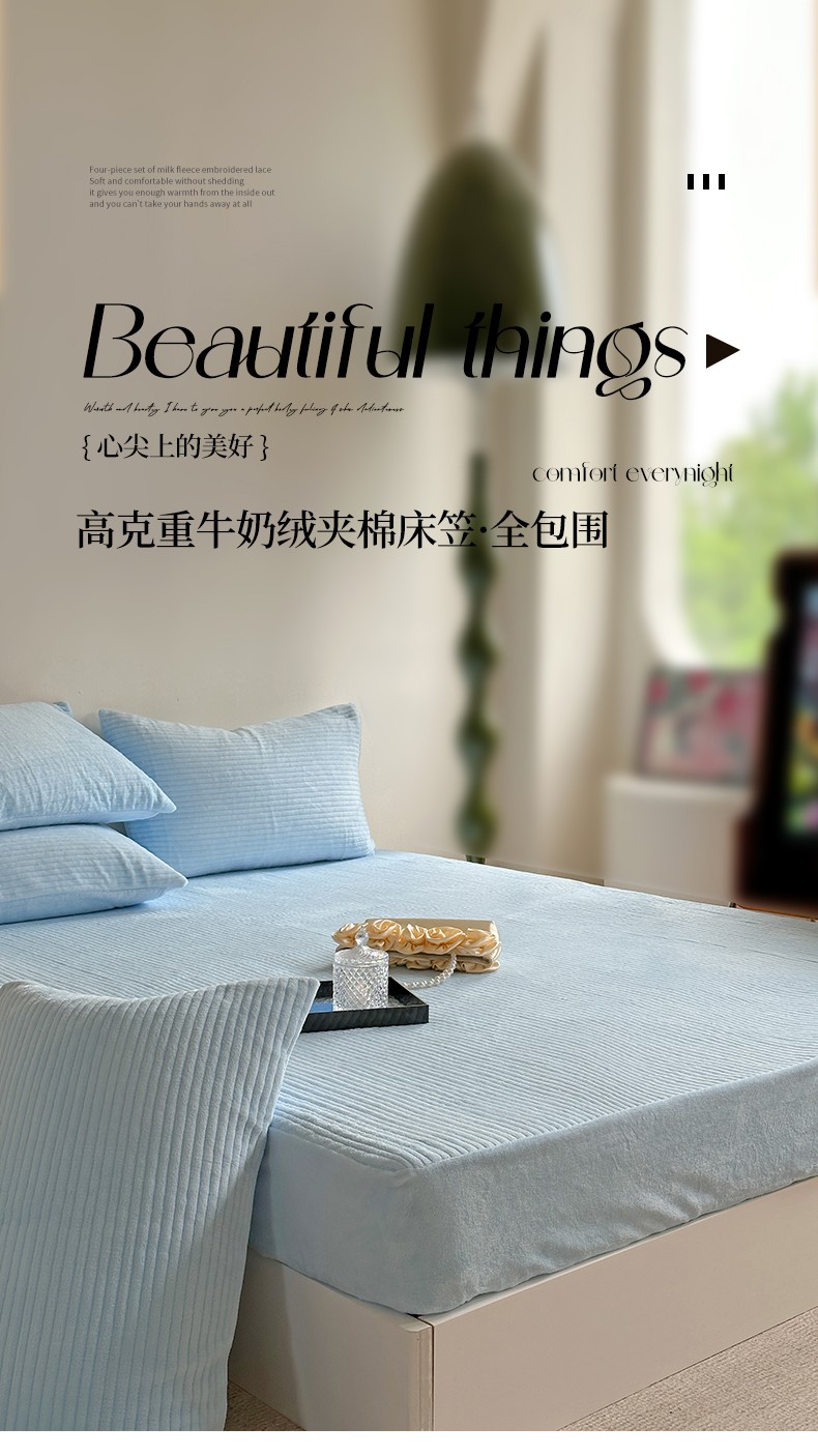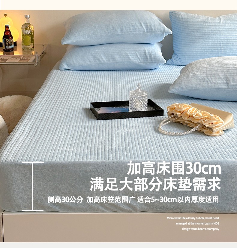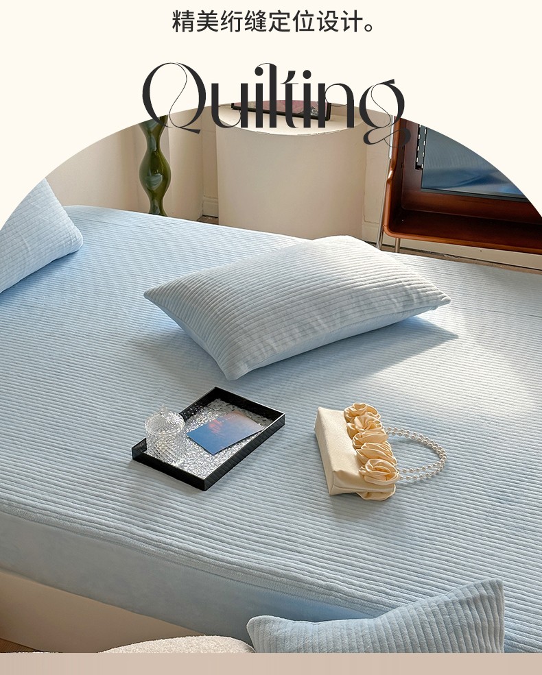 商品名称:漫调 2023新款直条绗缝牛奶绒纯色夹棉床笠 海盐蓝