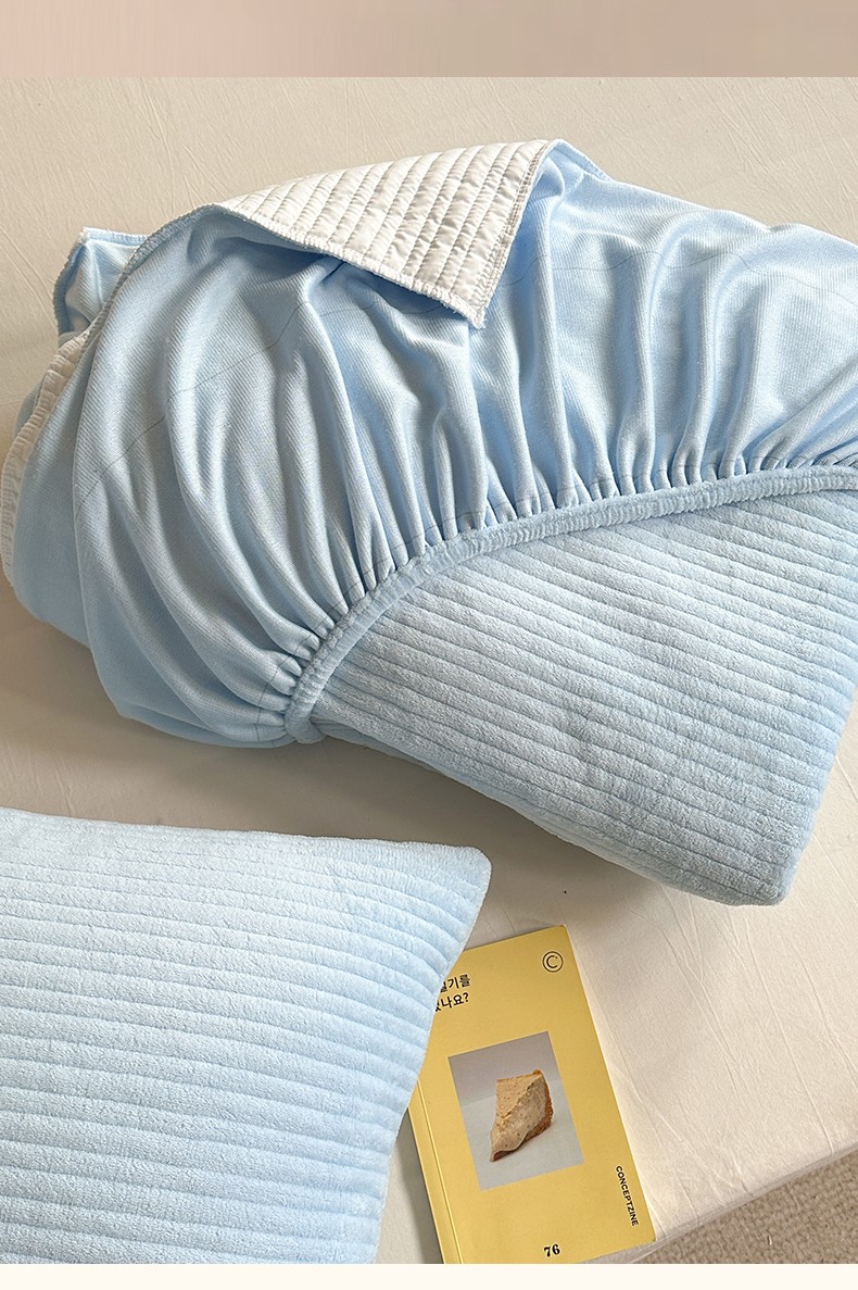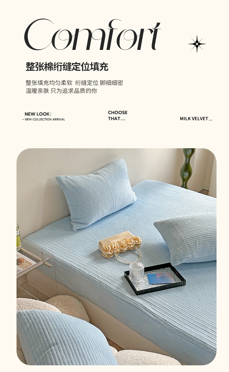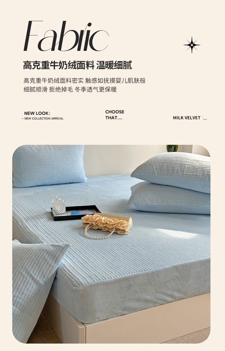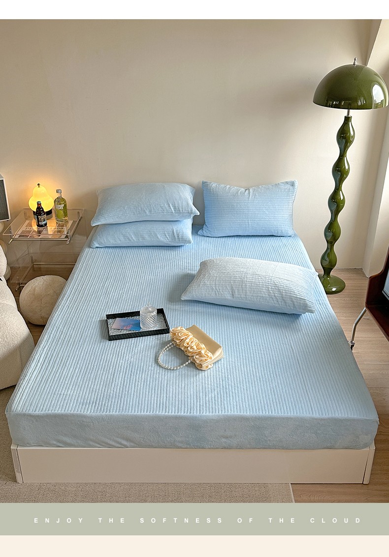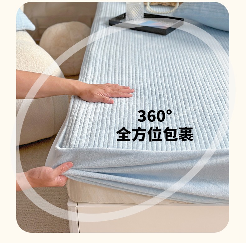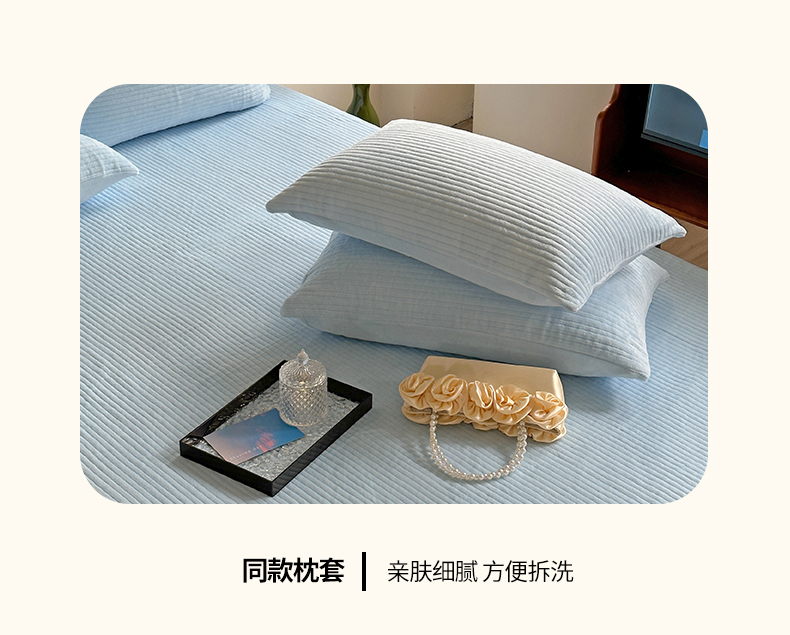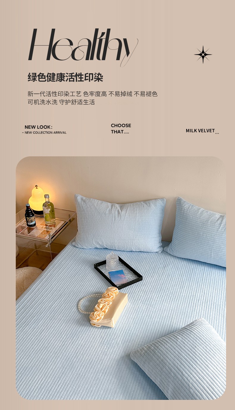 商品名称:漫调 2023新款直条绗缝牛奶绒纯色夹棉床笠 海盐蓝