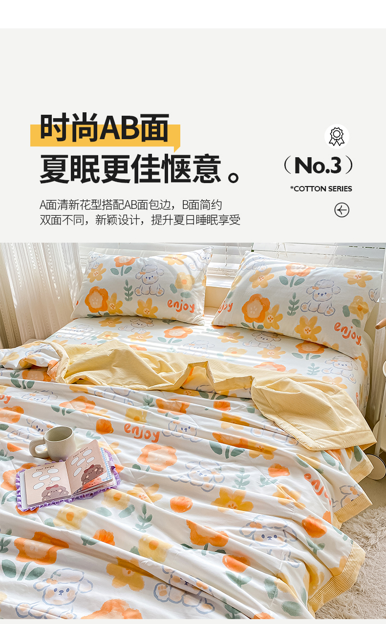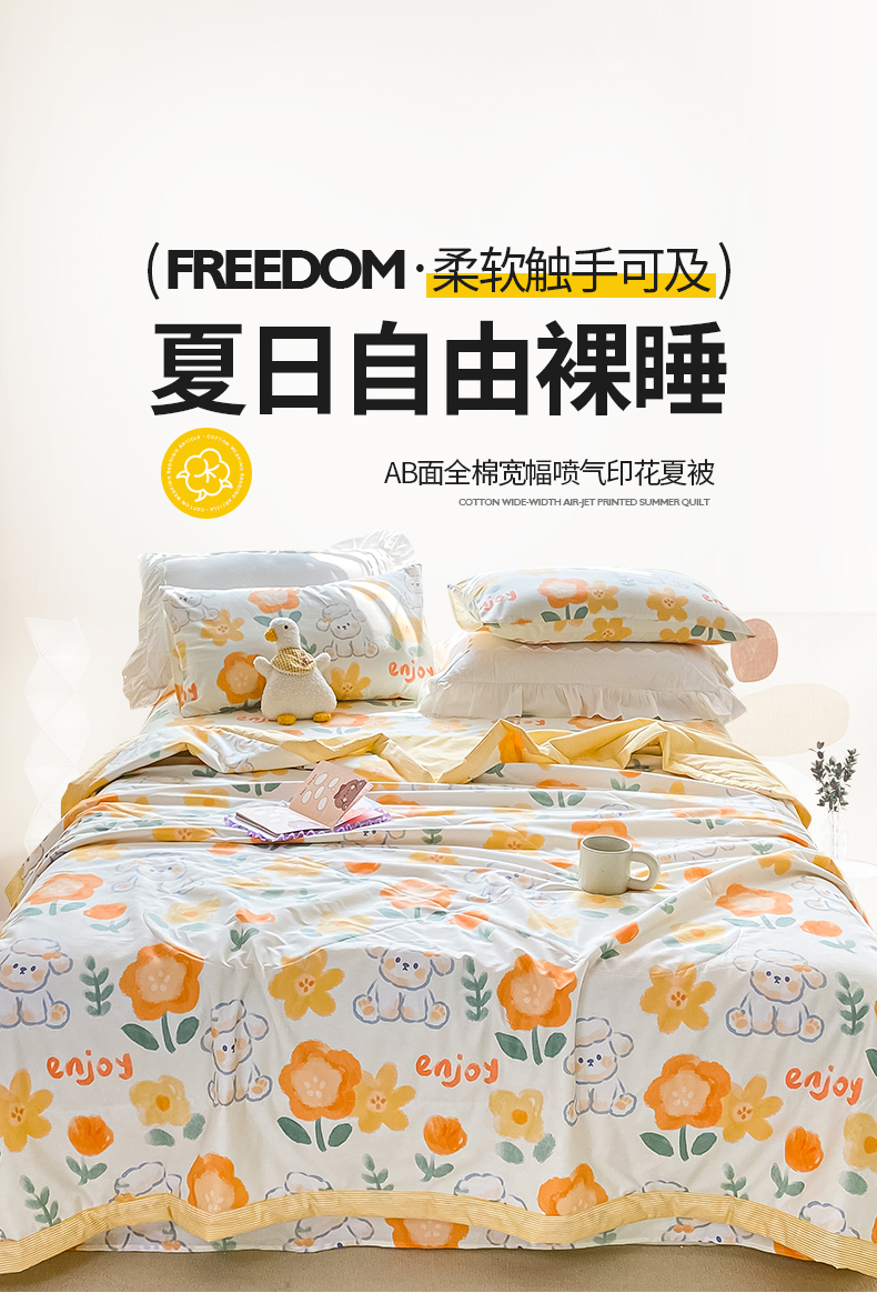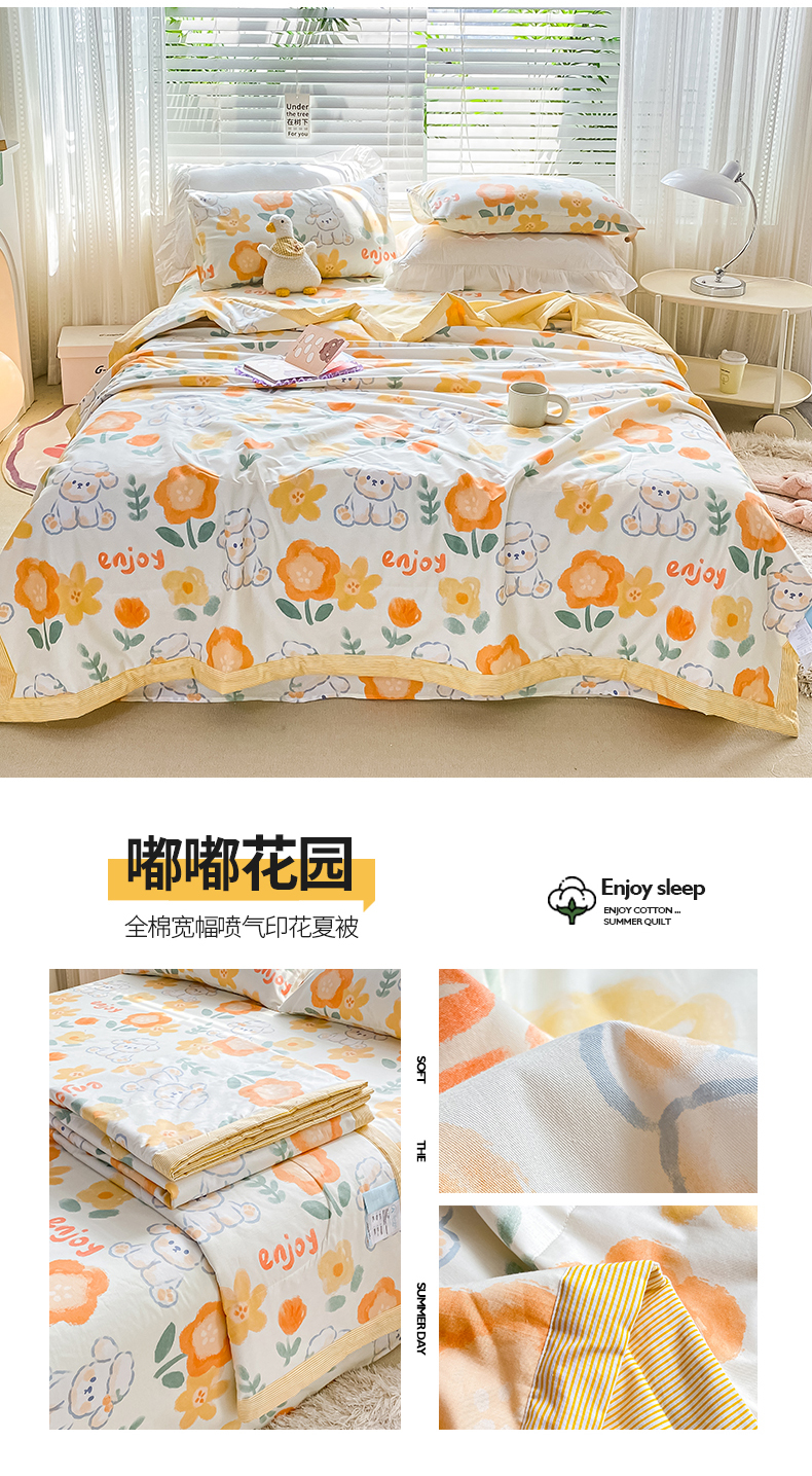 • 91家纺网 家纺一手货源 找家纺 莱宁被业 2024新款喷气全棉正反纯棉印花夏凉被全棉夏被四件套 嘟嘟花园