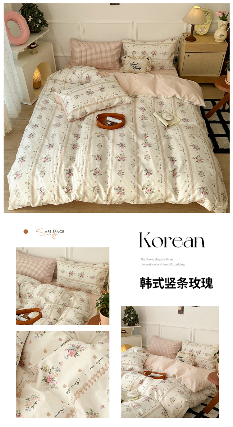 昔可家纺 2024韩式碎花四件套 韩式竖条玫瑰