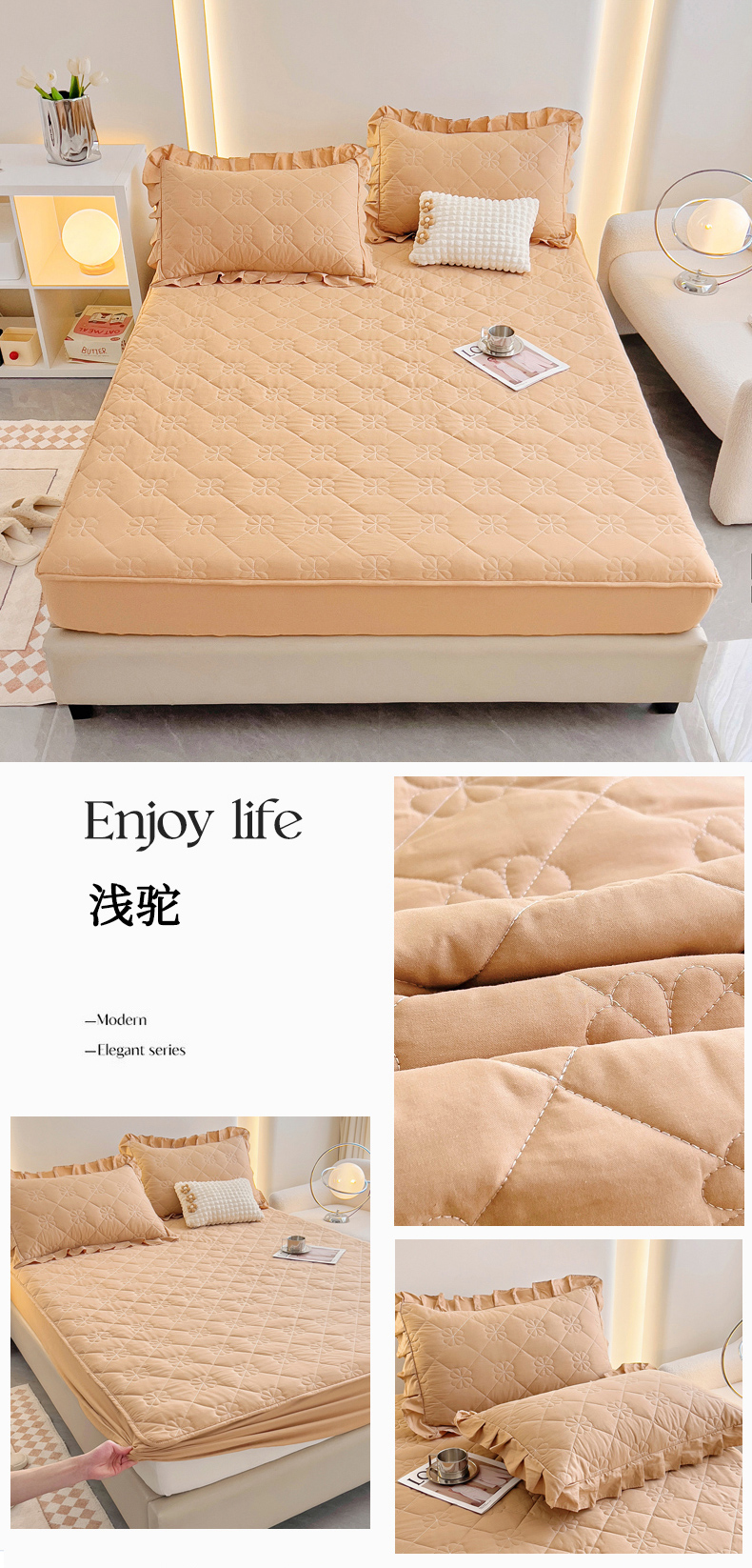 • 91家纺网 家纺一手货源 找家纺 情煊家纺 2024新款全棉亲肤夹棉纯色床笠 浅驼