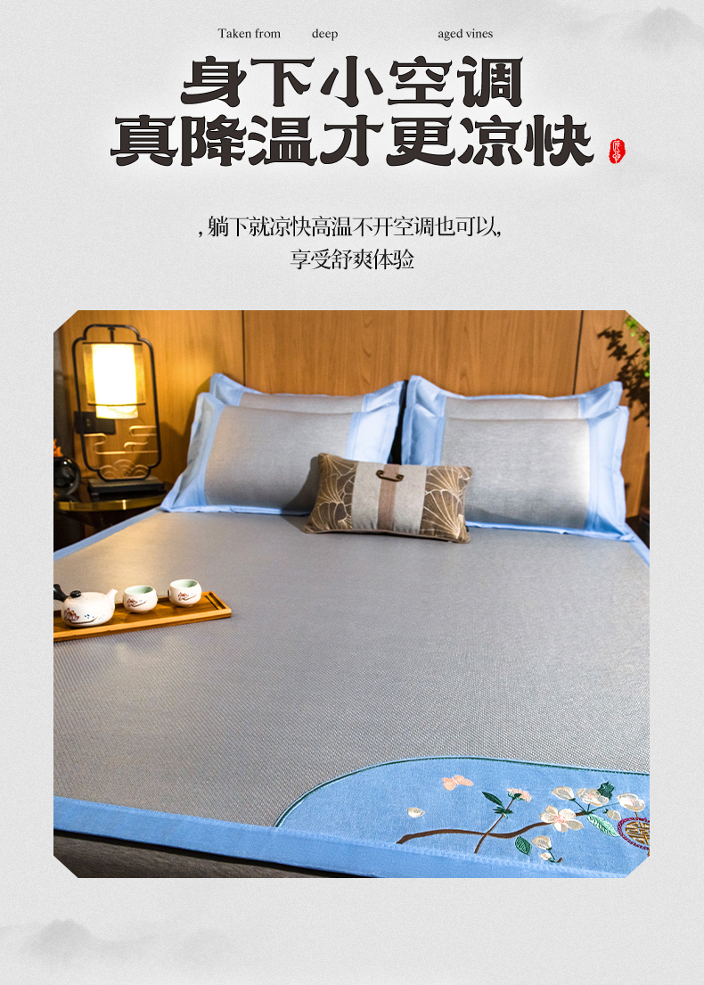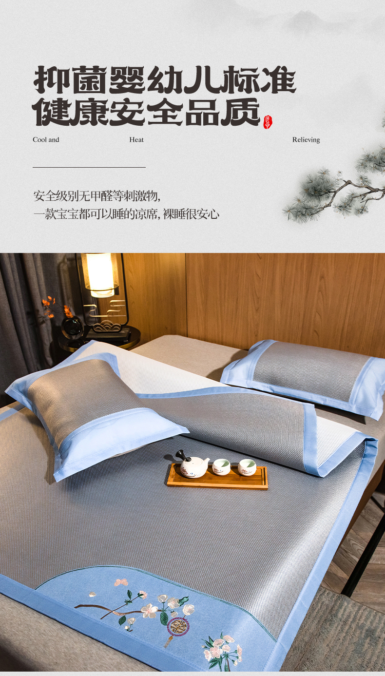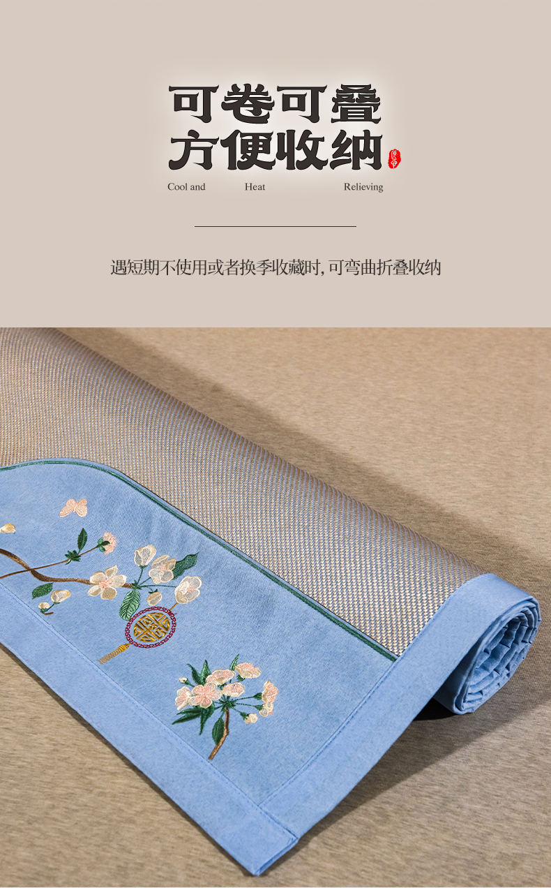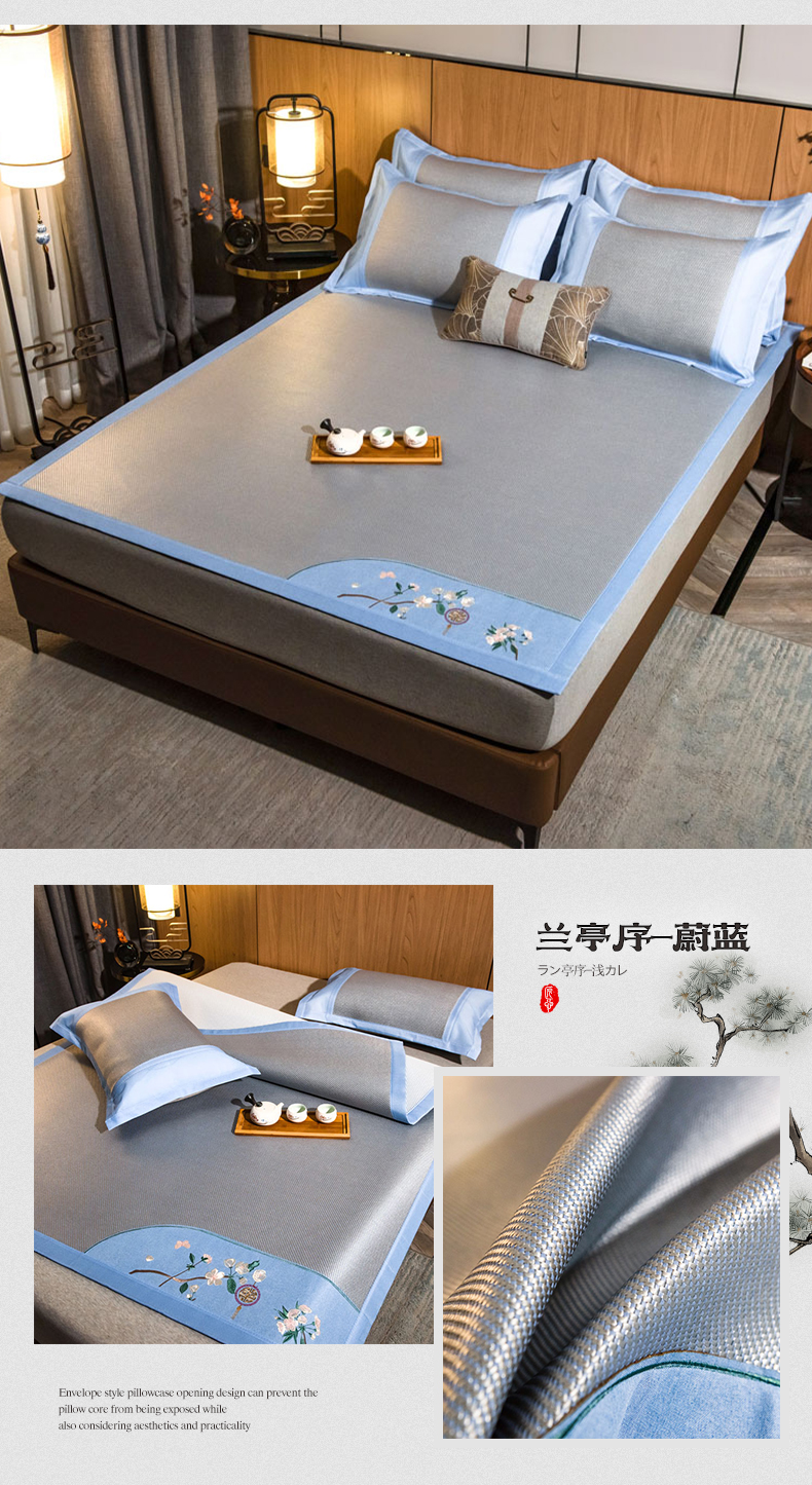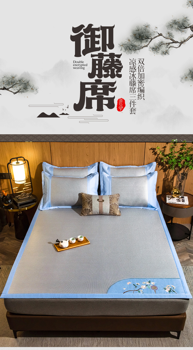 商品名称:全季家居 2024新款加厚5A抗菌绣花古风系列冰藤席 兰亭序-蔚蓝