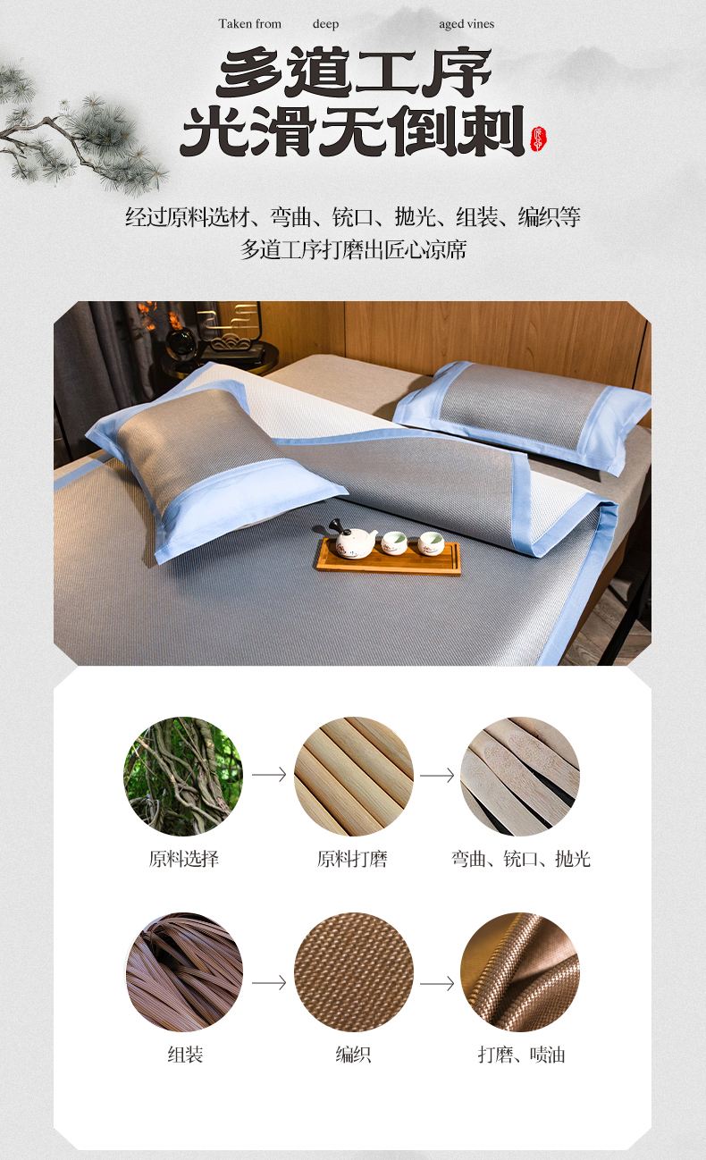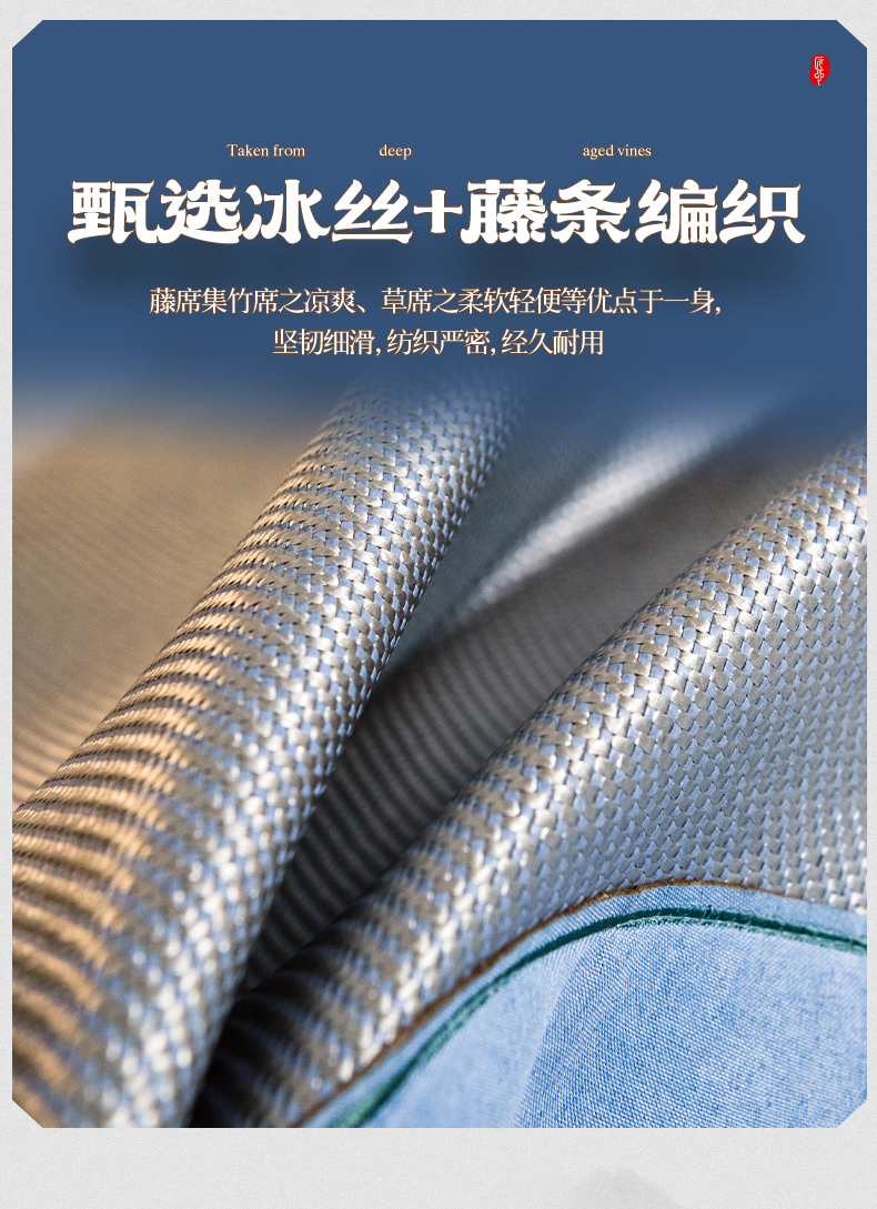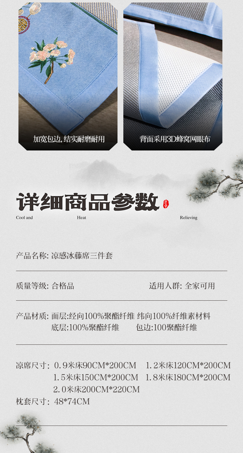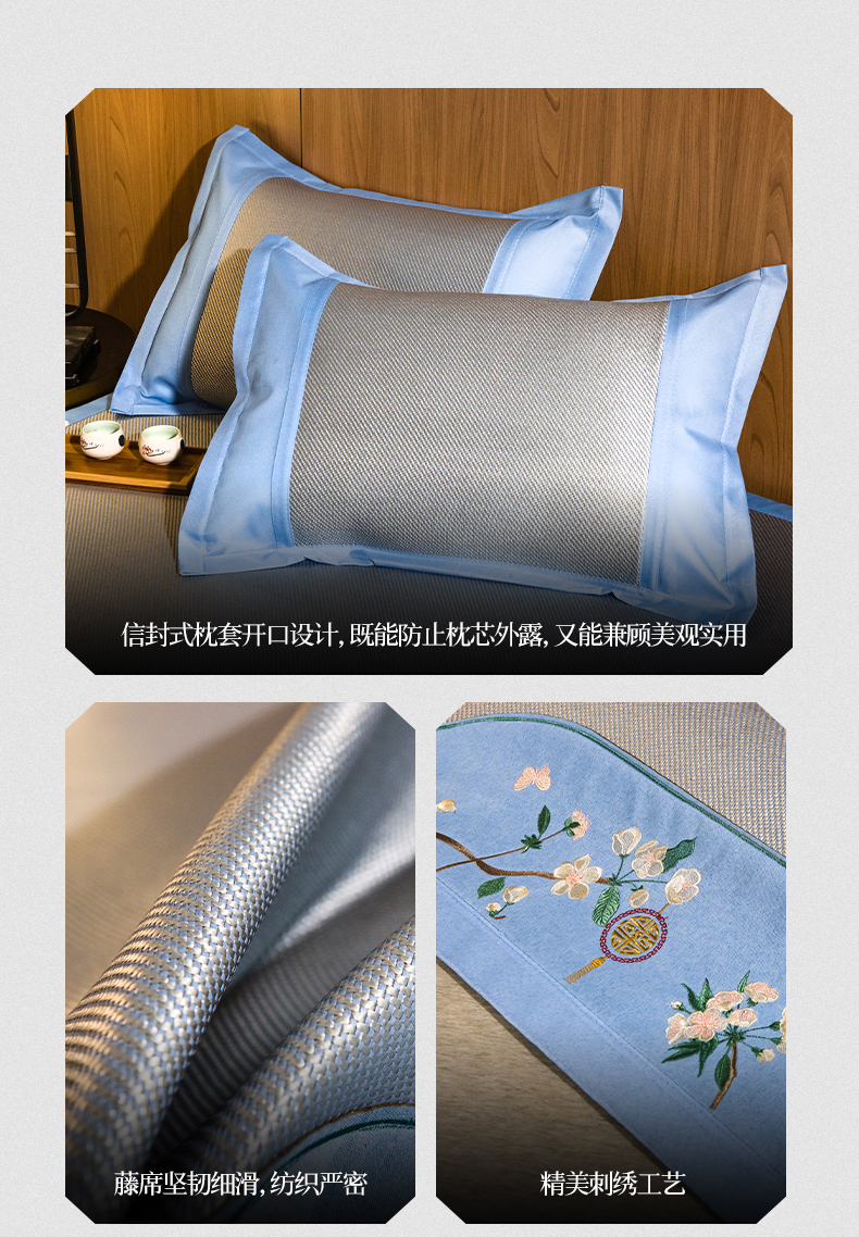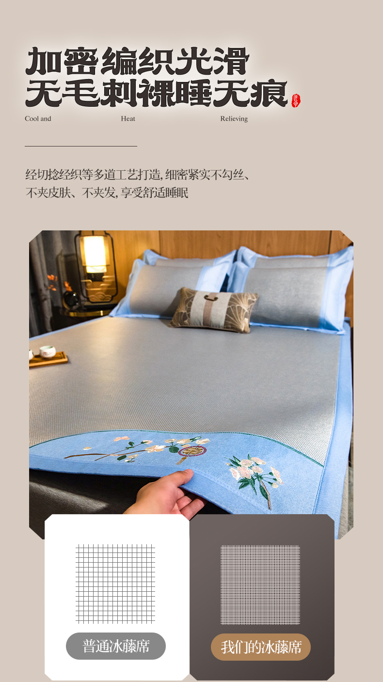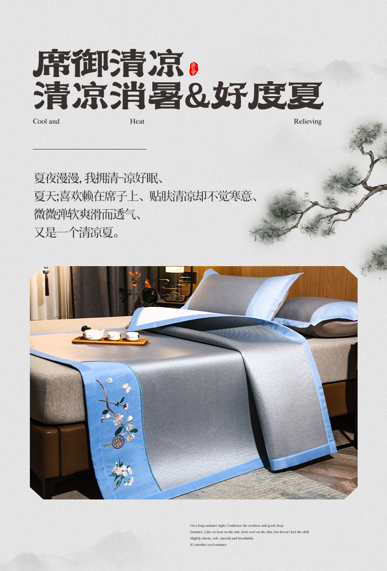 商品名称:全季家居 2024新款加厚5A抗菌绣花古风系列冰藤席 兰亭序-蔚蓝