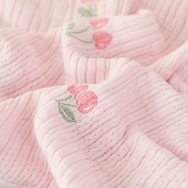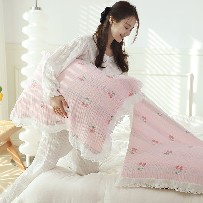 • 91家纺网 家纺一手货源 找家纺 朴尔毛巾被2024年新款韩式花边四层纱枕巾纯棉竹纤维加大成人纱布巾 樱桃日记-粉52*78cm