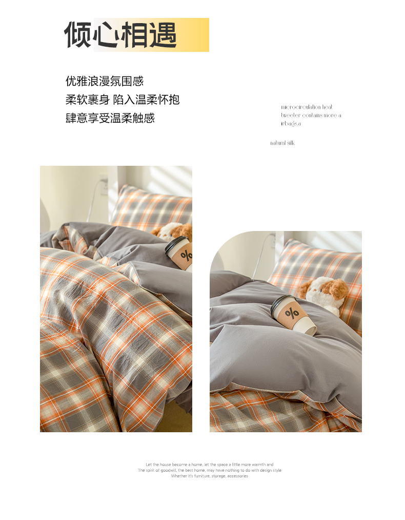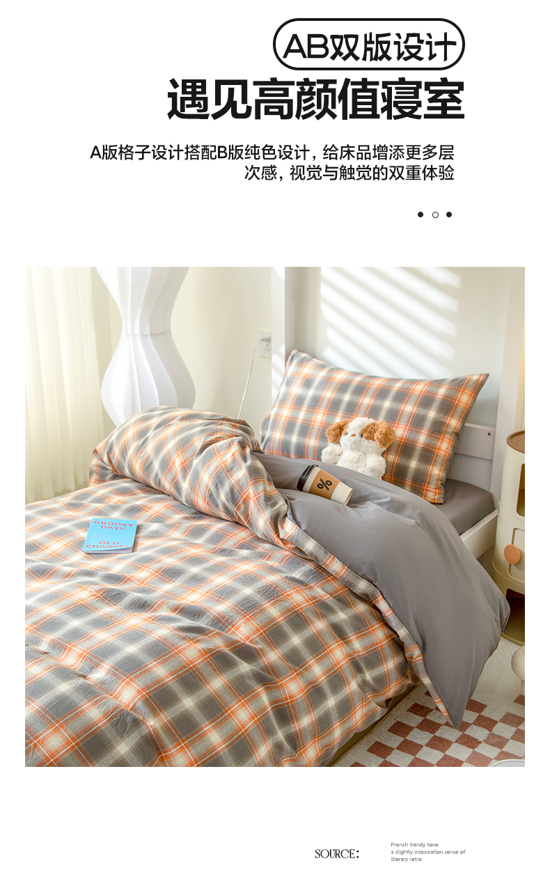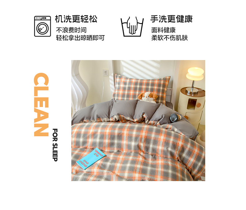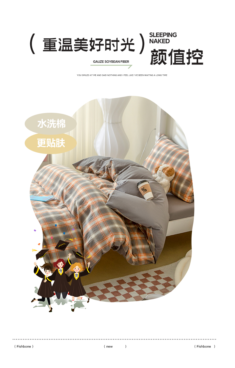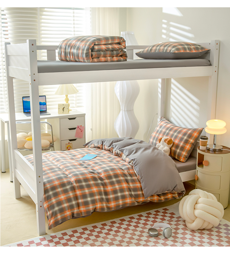 商品名称:2024新款水洗棉无印格子学生三件套(床笠床套款) G-米卡+中灰