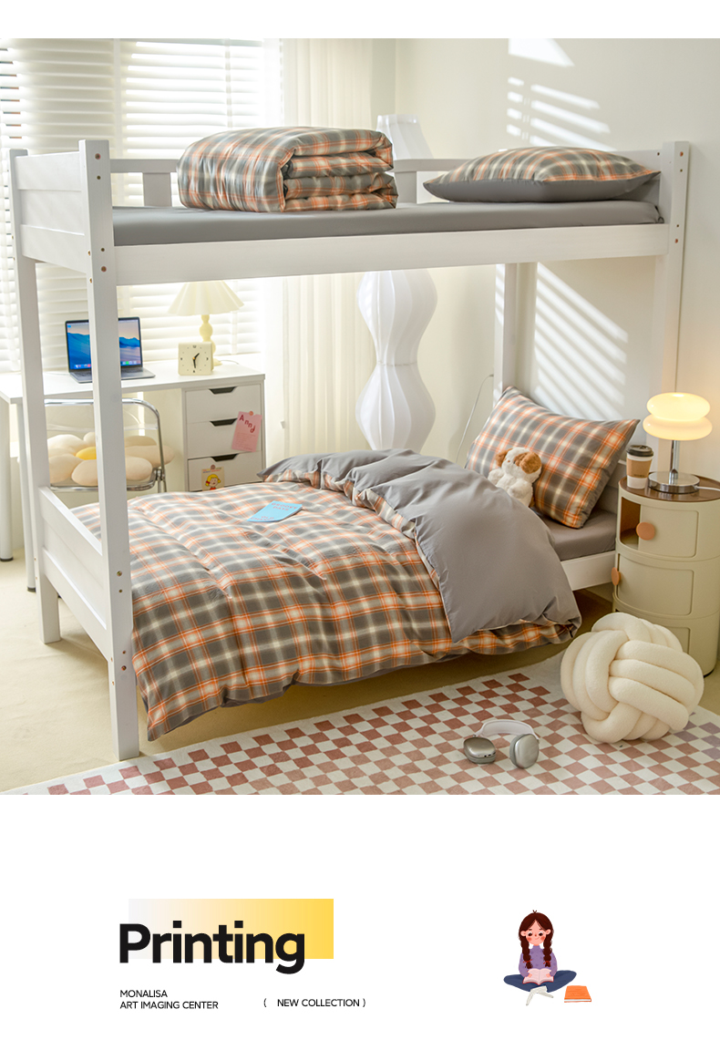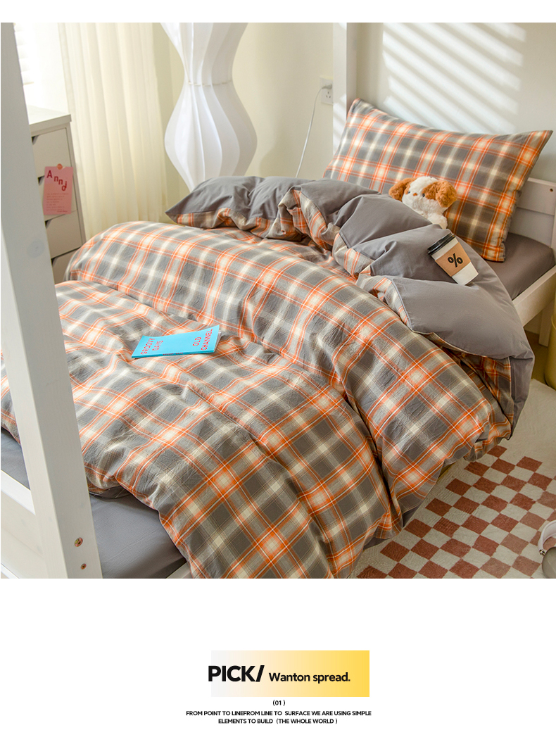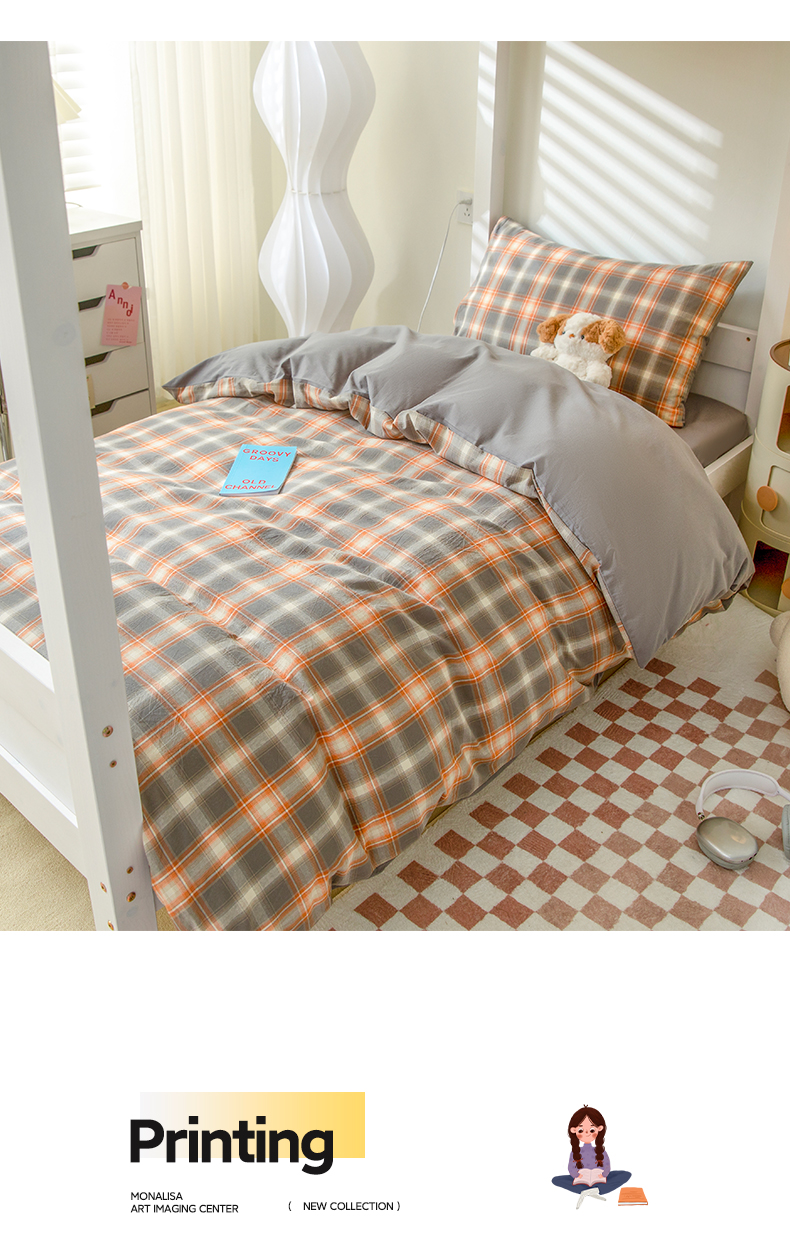 2024新款水洗棉无印格子学生三件套(床笠床套款) G-米卡+中灰