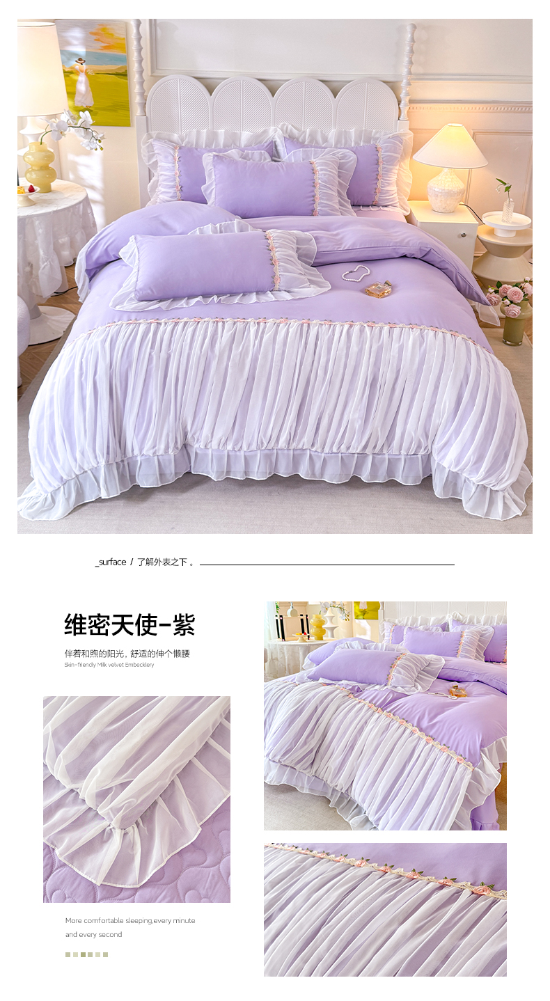 当前位置: 91家纺网 > 商品网购 > 床品套件 > 四件套 > 其它四件套 > 逸尚阁 2024新款水洗磨毛蕾丝拼接四件套--维密天使系列 维密天使-紫