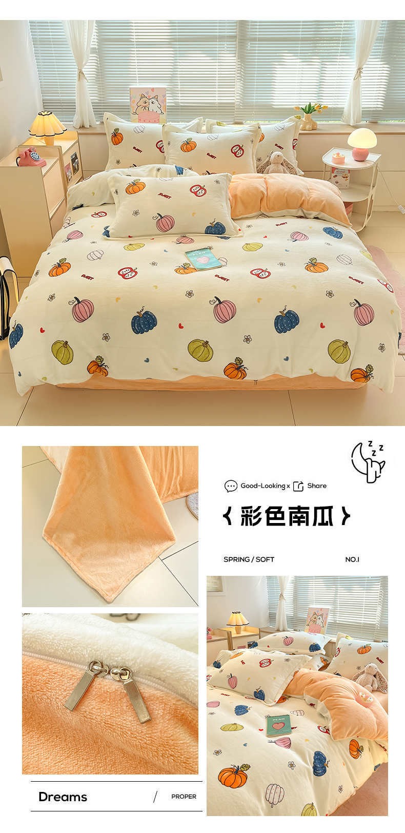 商品名称:2024新款A类AB版加厚保暖双面牛奶绒印花四件套--小清新系列 彩色南瓜