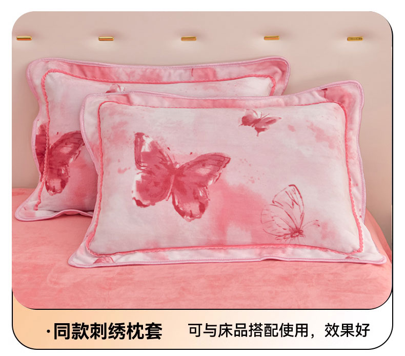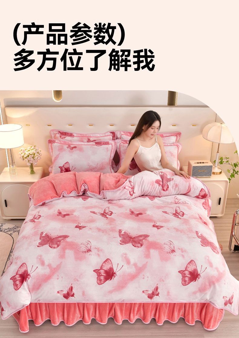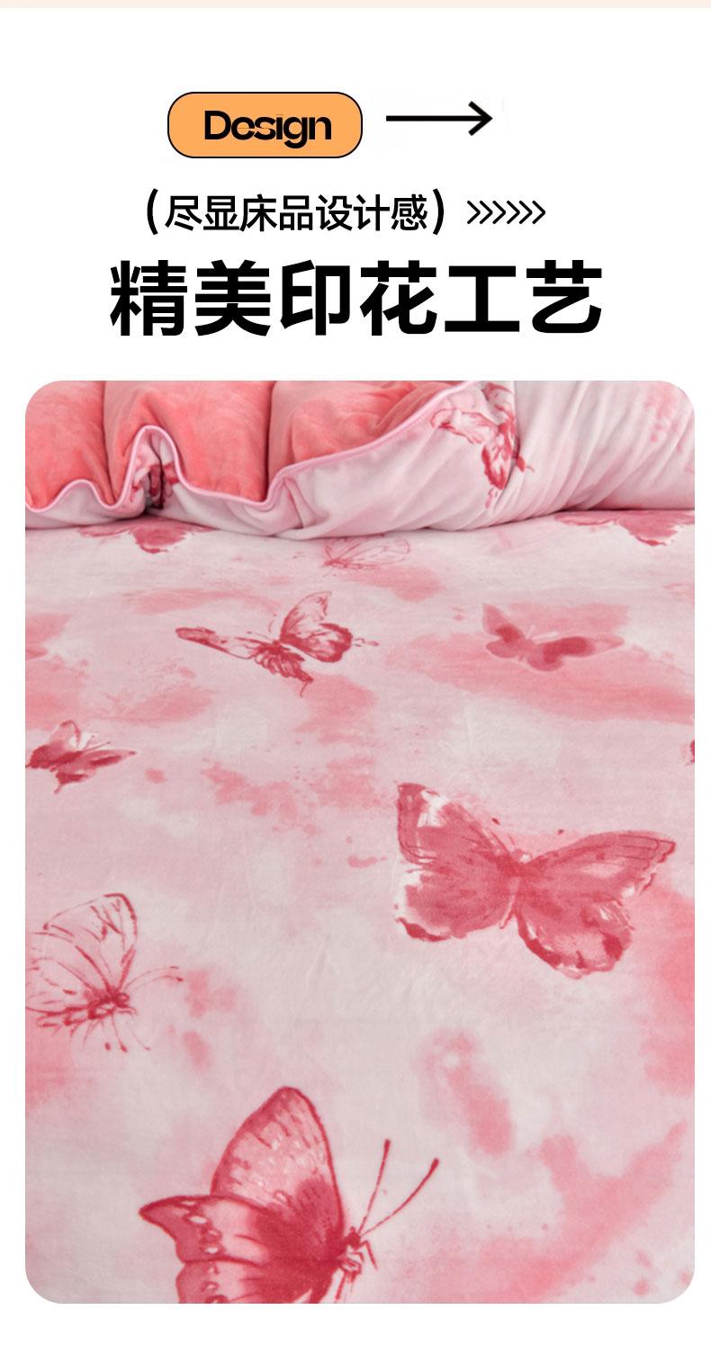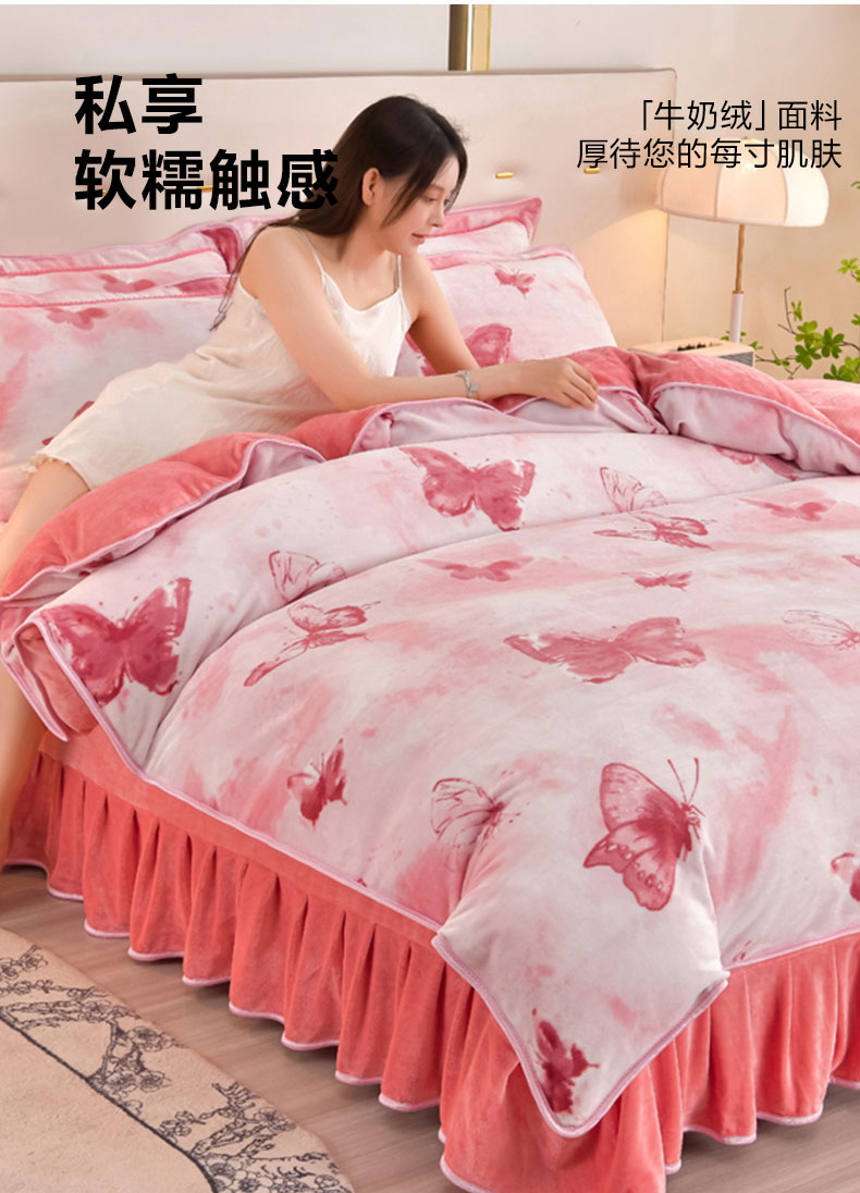 新8.5-9.5斤法莱绒四件套珊瑚牛奶金貂绒四件套床裙 梦蝶粉