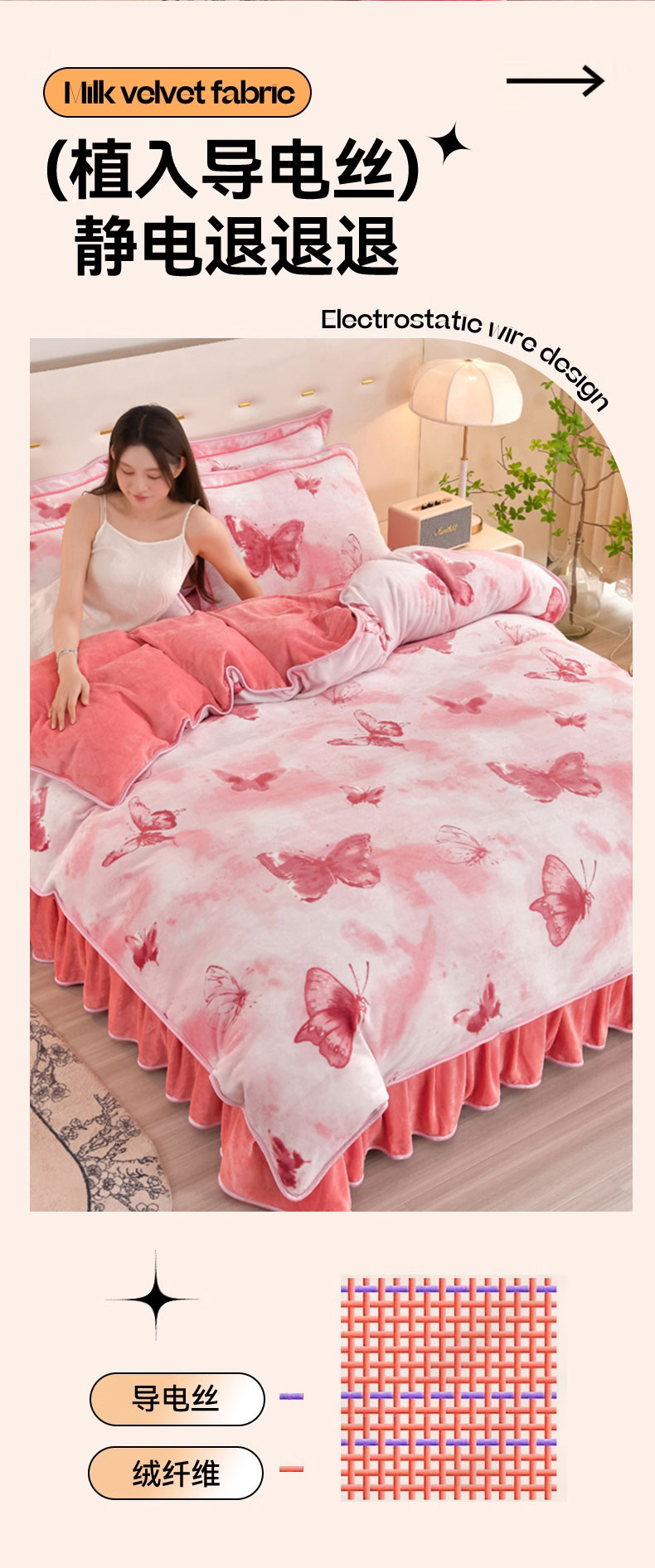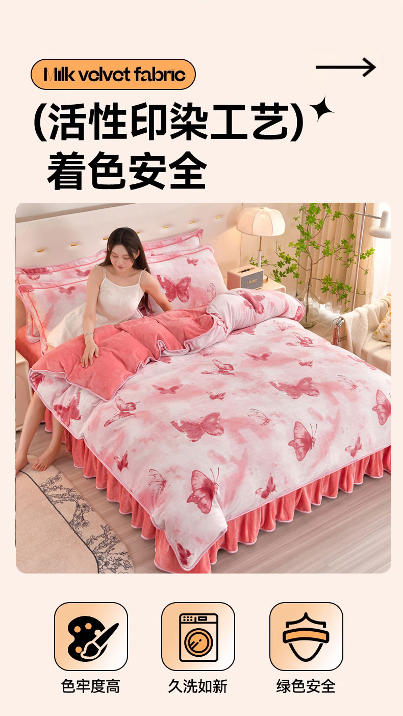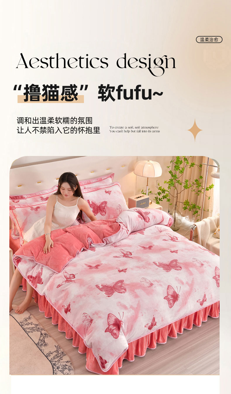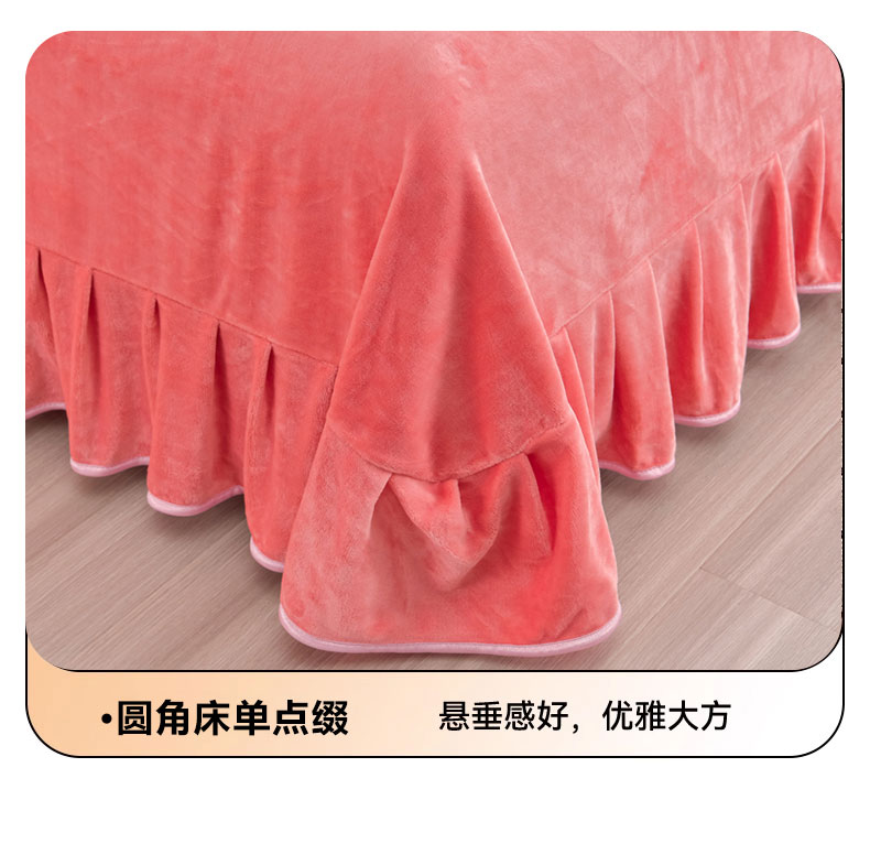 新8.5-9.5斤法莱绒四件套珊瑚牛奶金貂绒四件套床裙 梦蝶粉