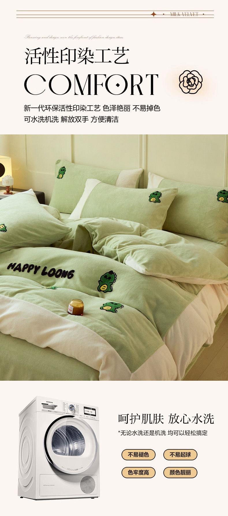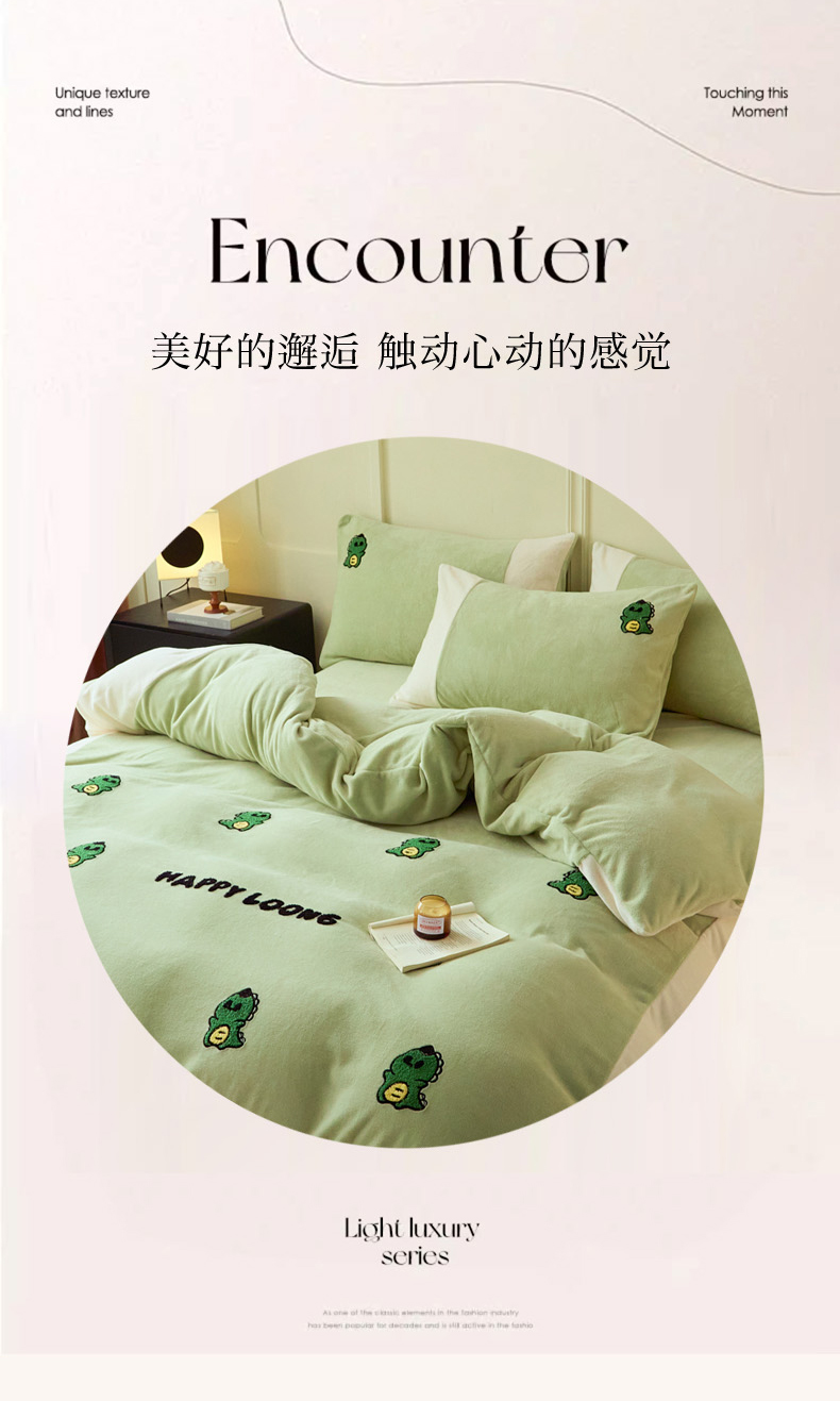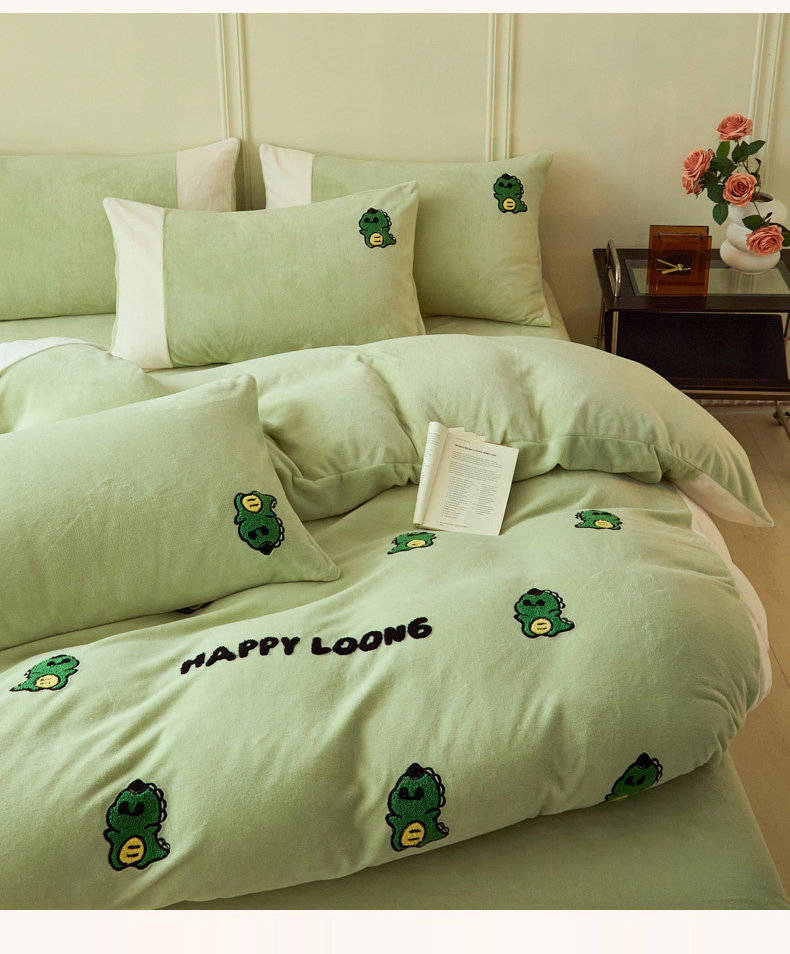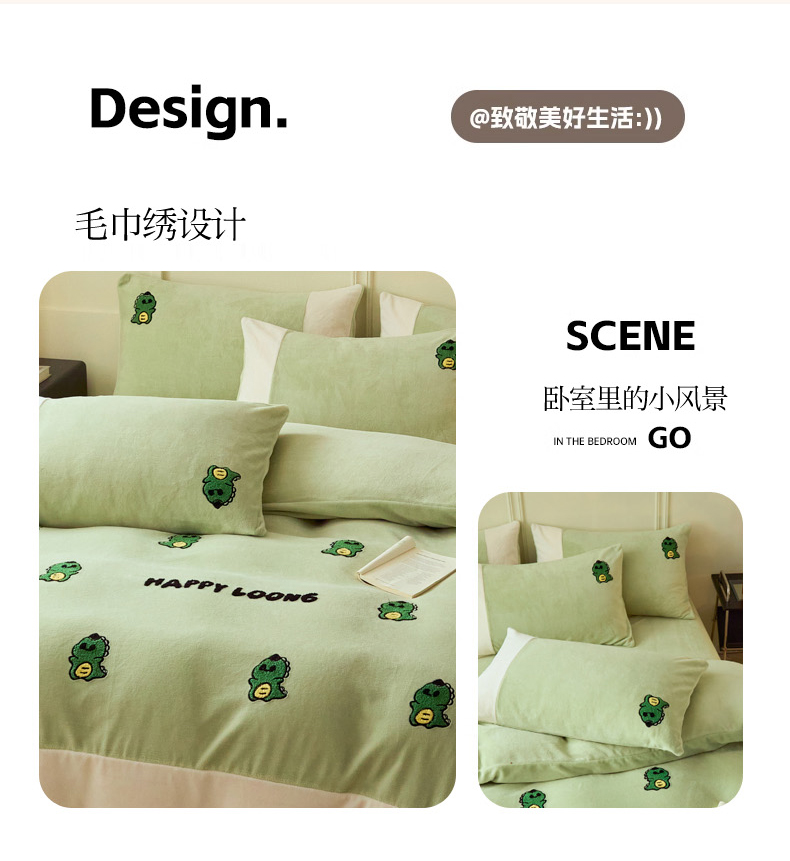 商品名称:恋佳居 2025新款高克重全工艺牛奶绒毛巾绣四件套 恐龙绿色