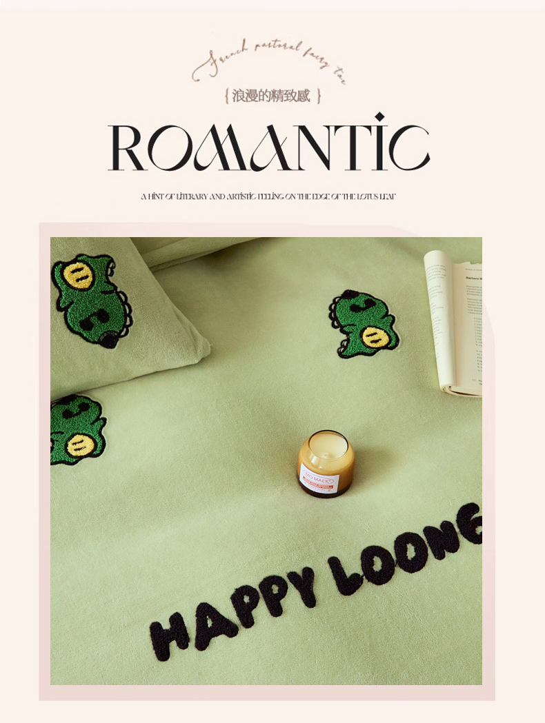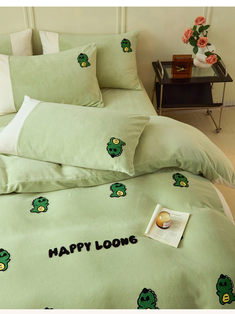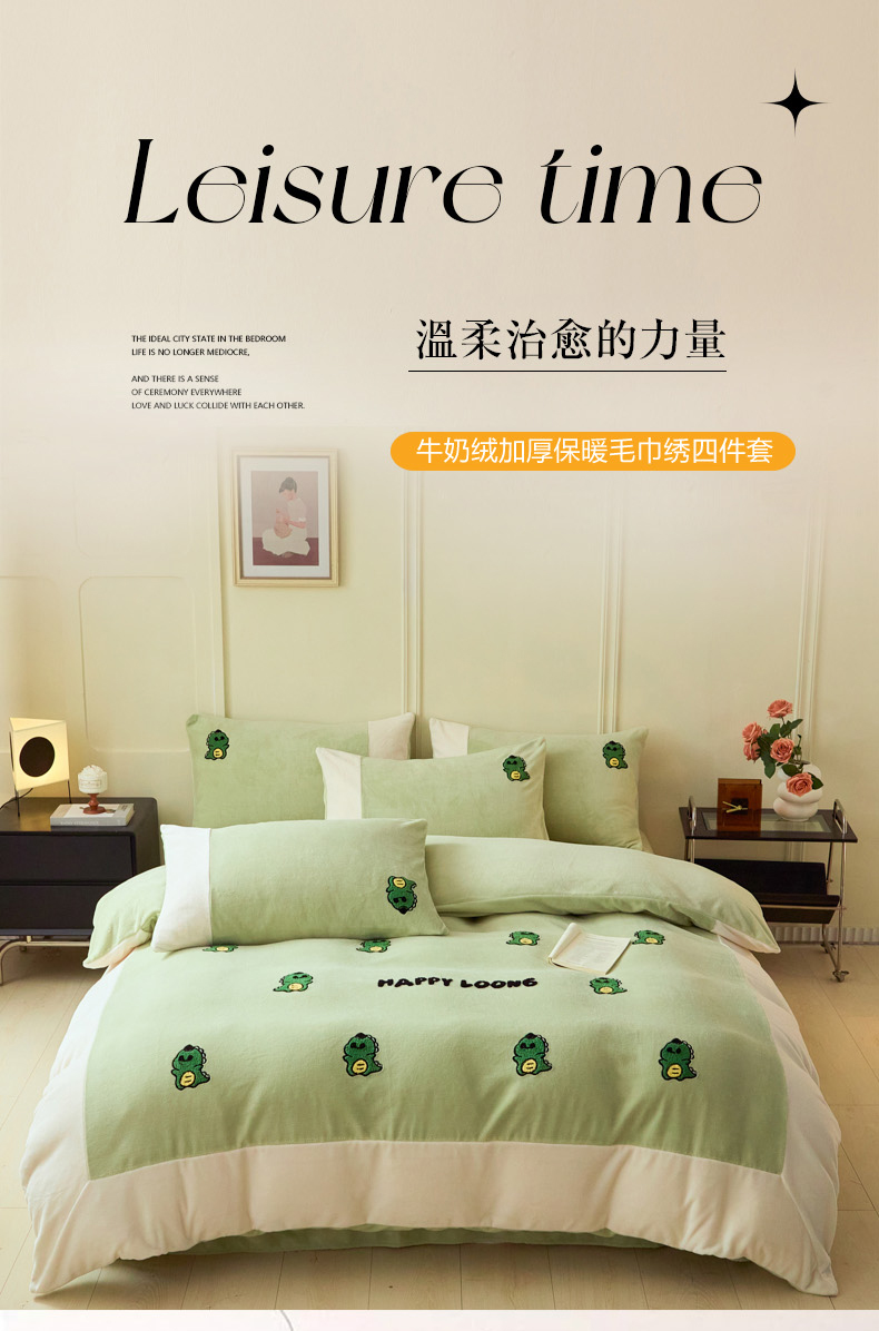 恋佳居 2025新款高克重全工艺牛奶绒毛巾绣四件套 恐龙绿色