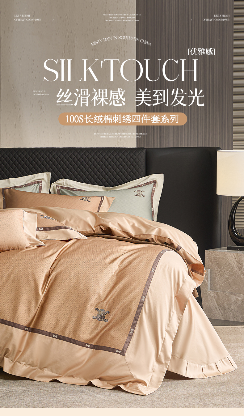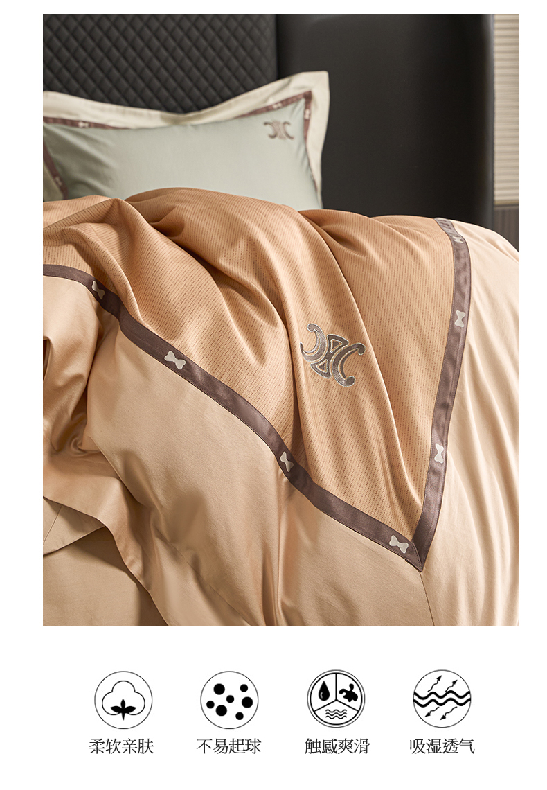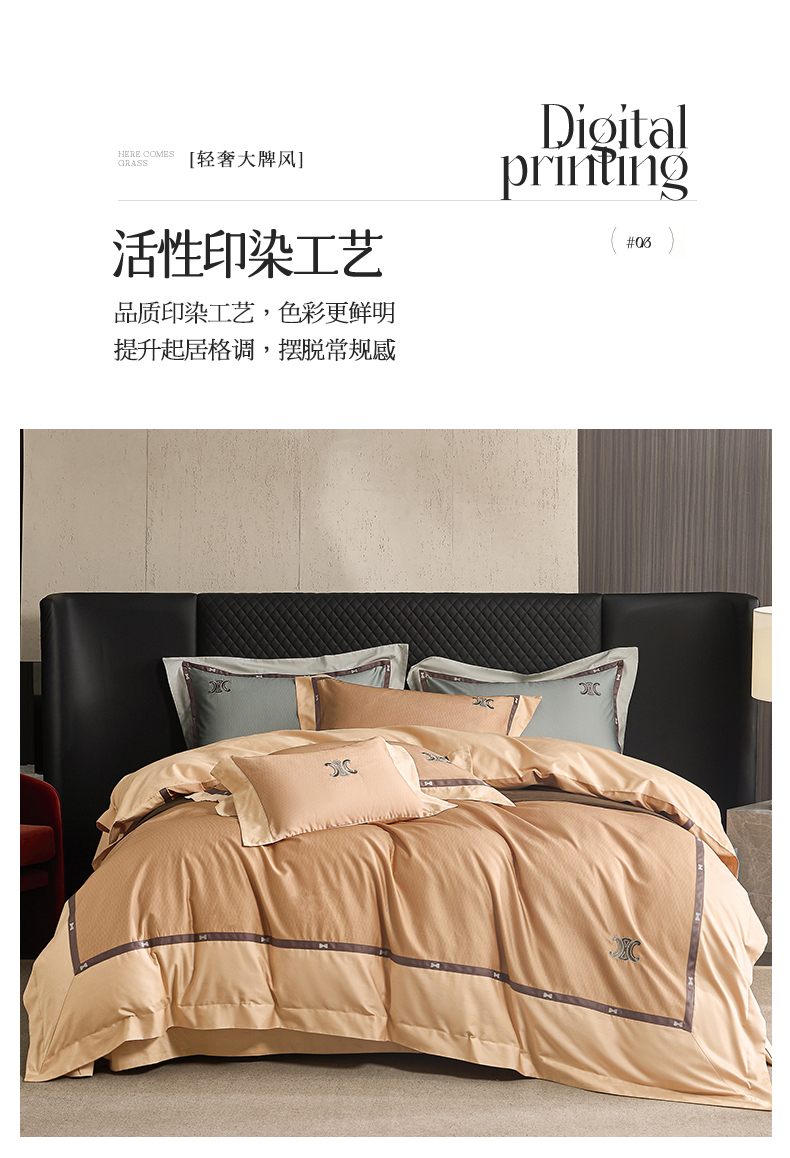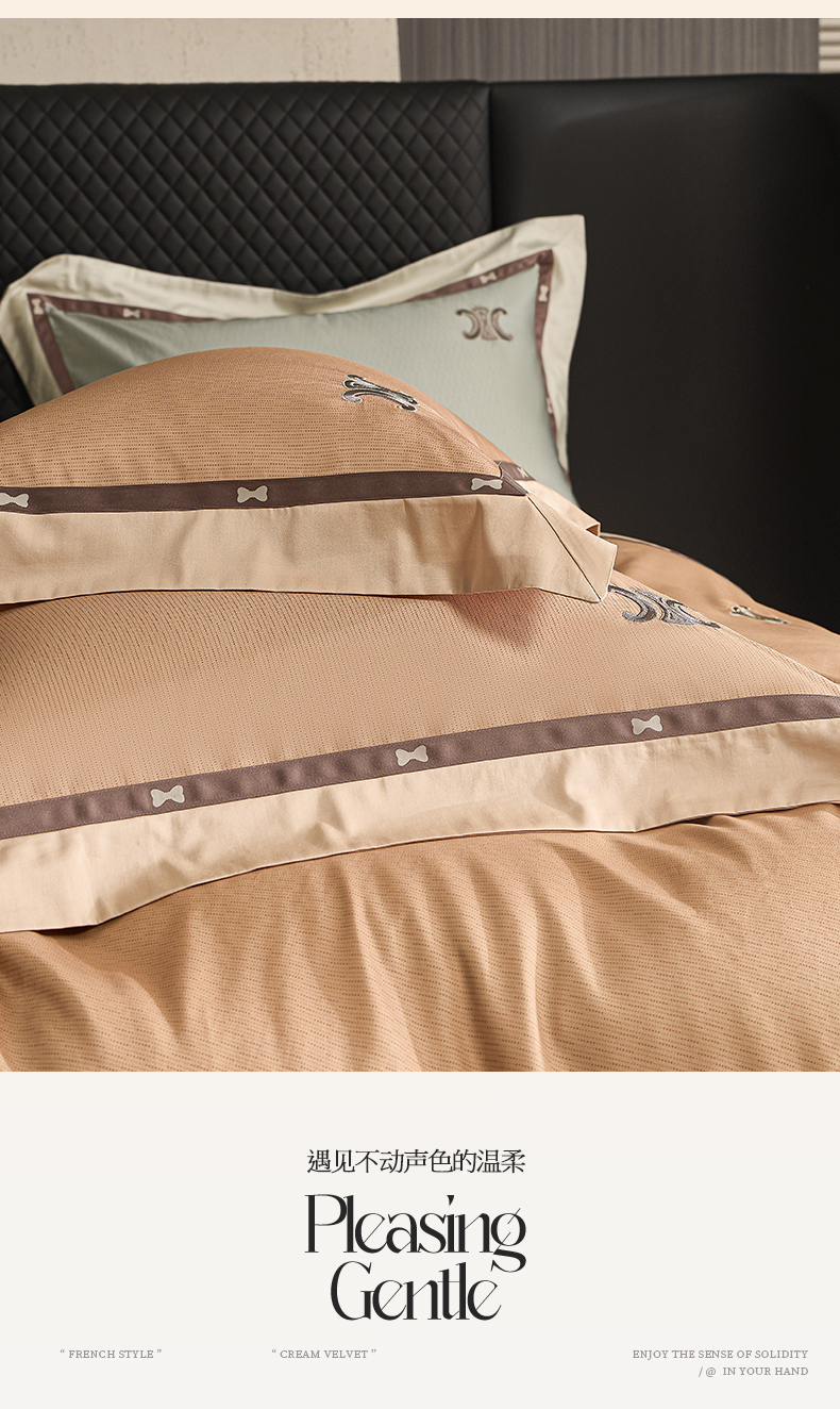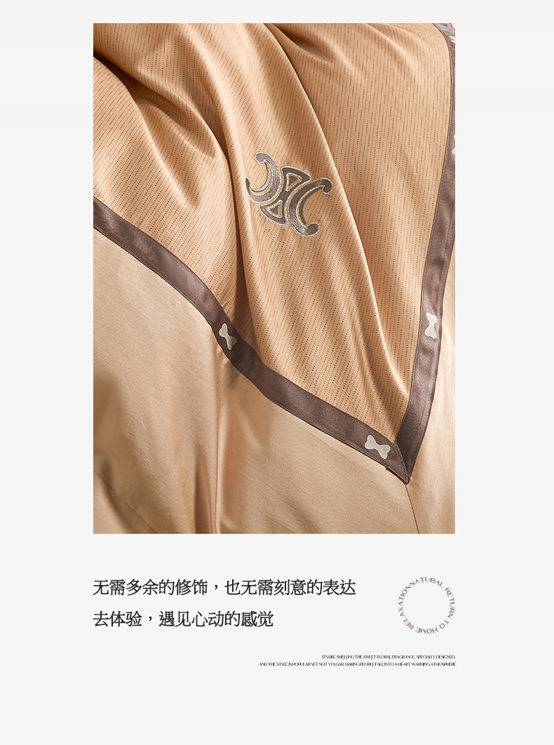 商品名称:名品优仓 2024新款高支高密长绒棉数码印花加织带刺绣拼角款四件套-斯琳娜 斯琳娜-奶茶色