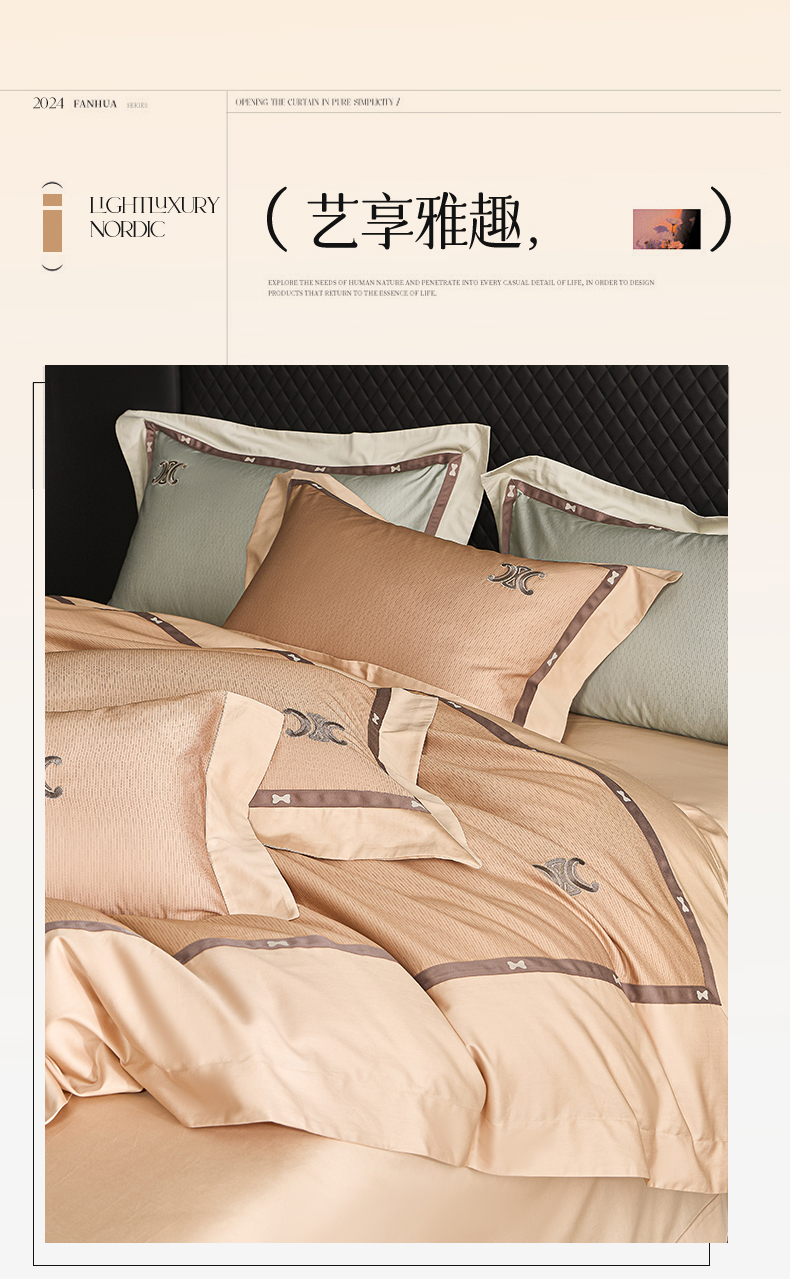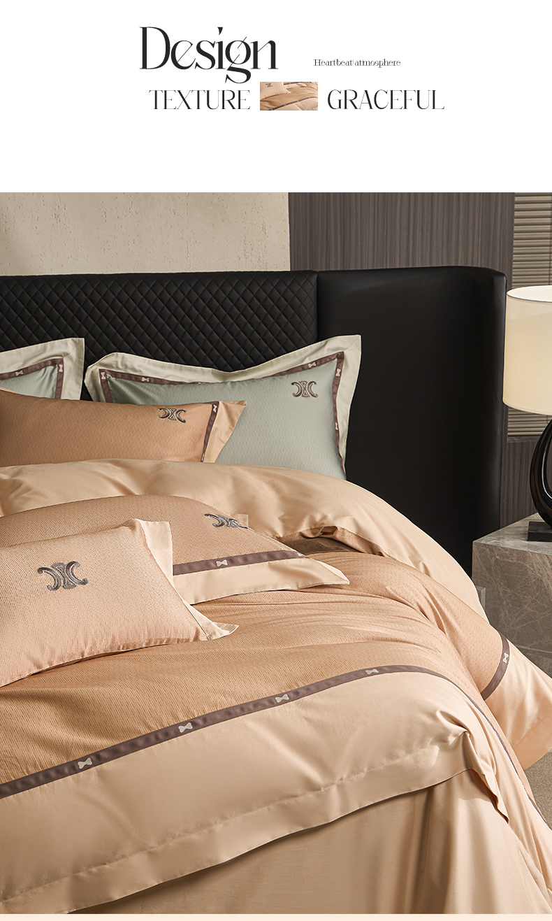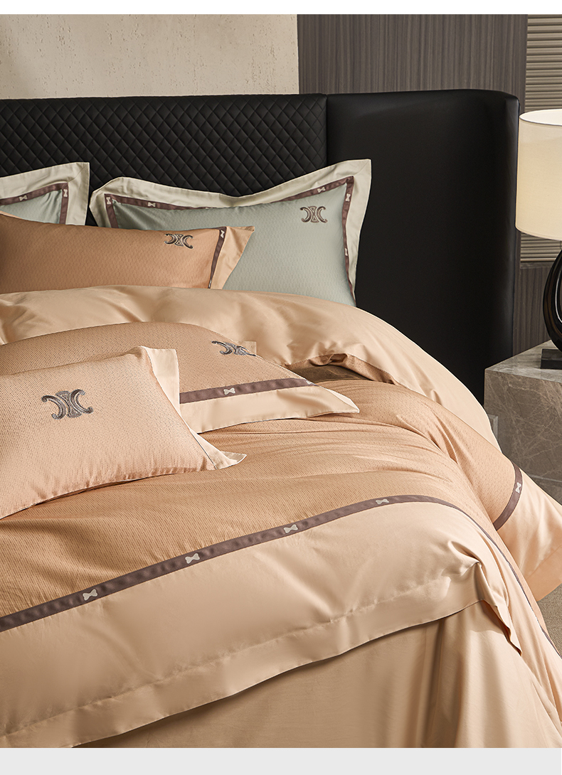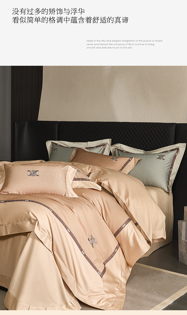 商品名称:名品优仓 2024新款高支高密长绒棉数码印花加织带刺绣拼角款四件套-斯琳娜 斯琳娜-奶茶色