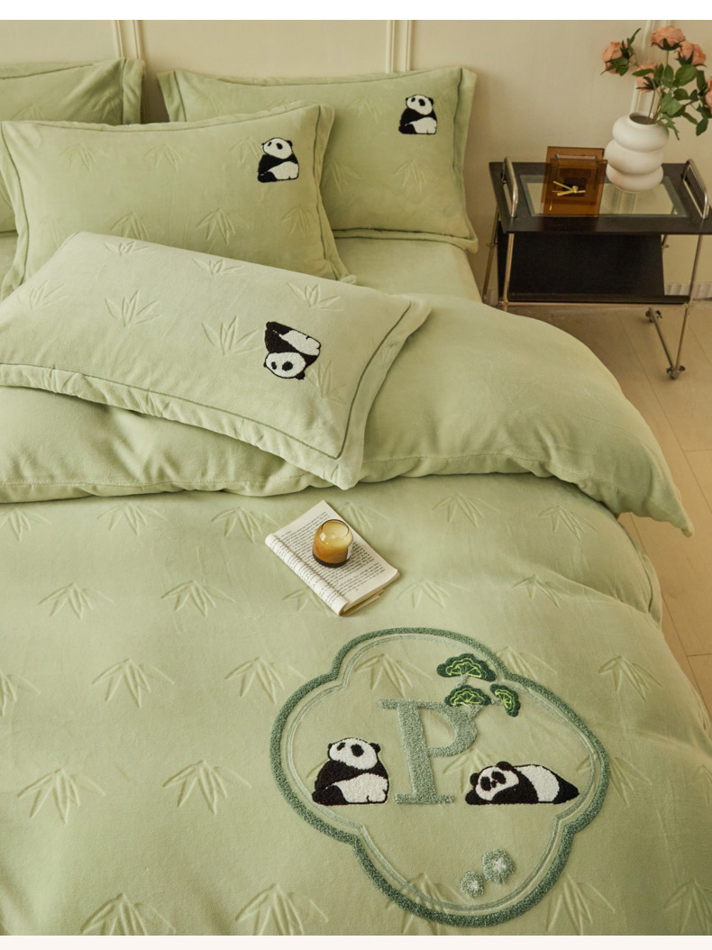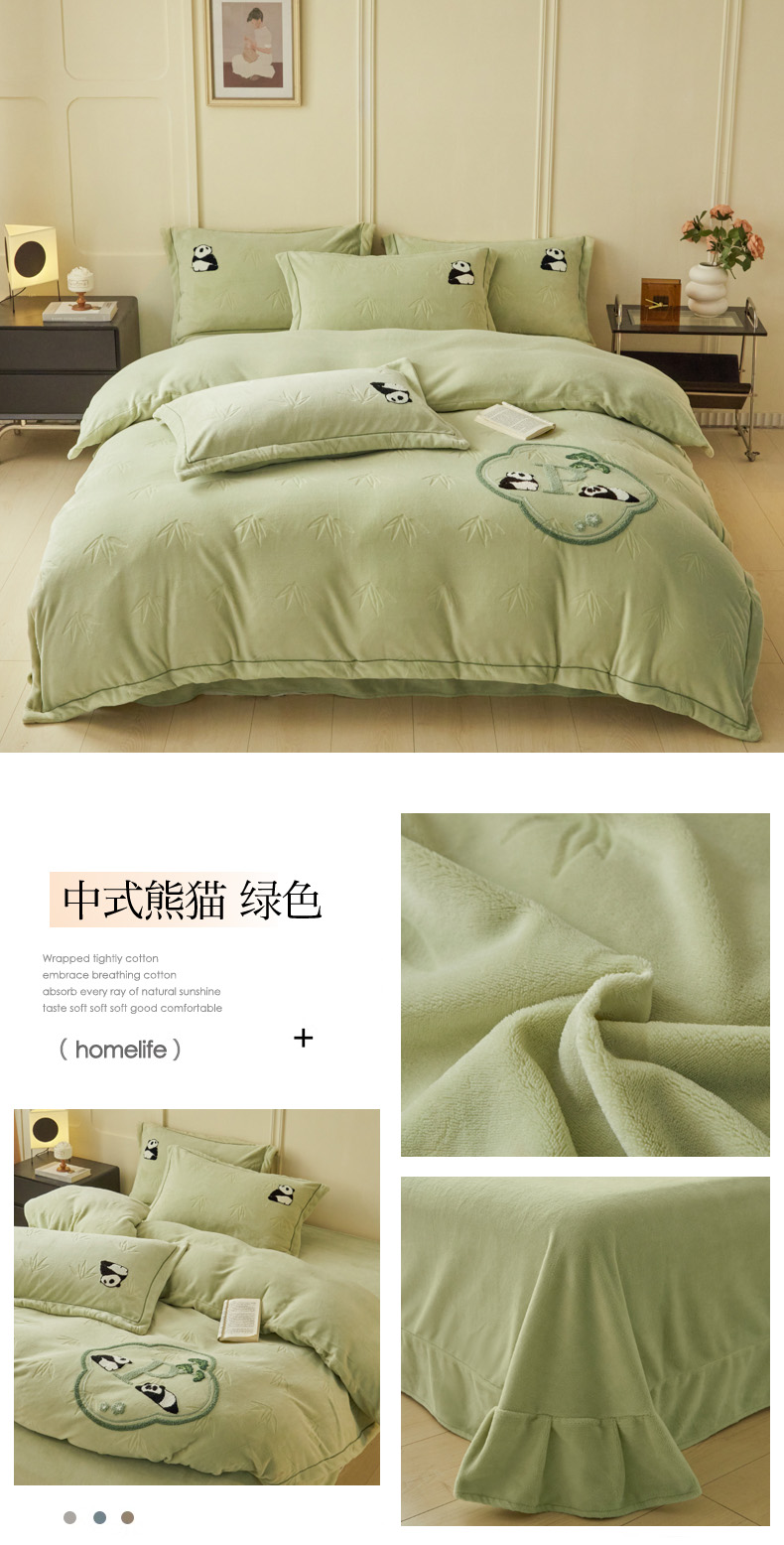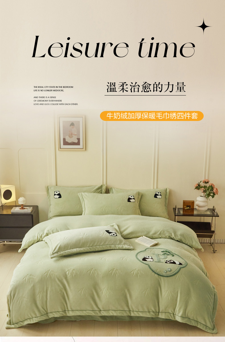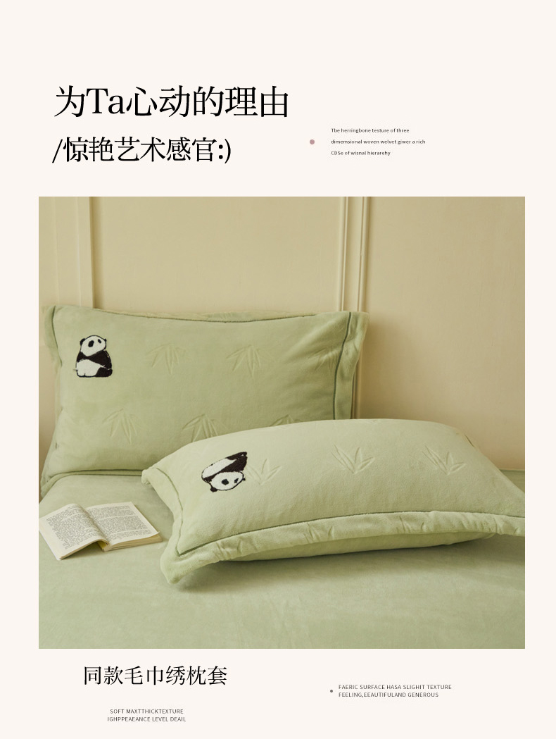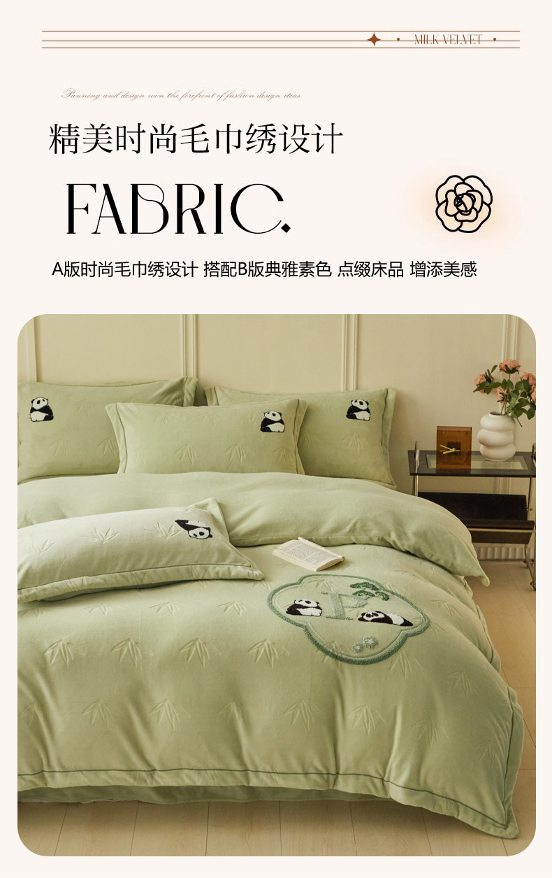 商品名称:恋佳居 2025新款高克重全工艺牛奶绒毛巾绣四件套 中式熊猫绿色