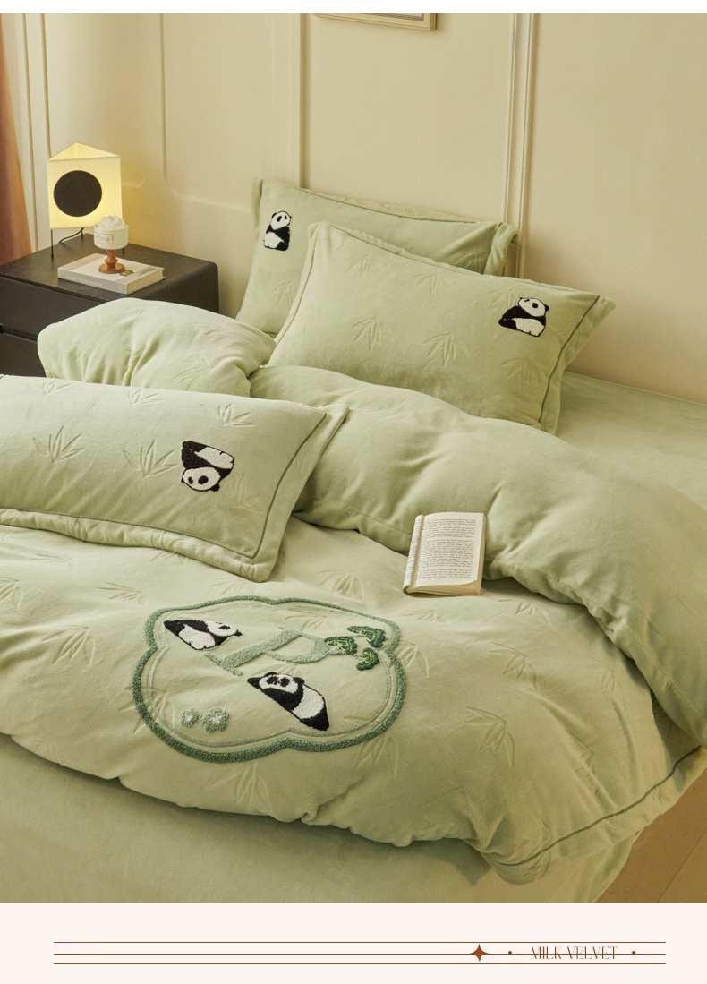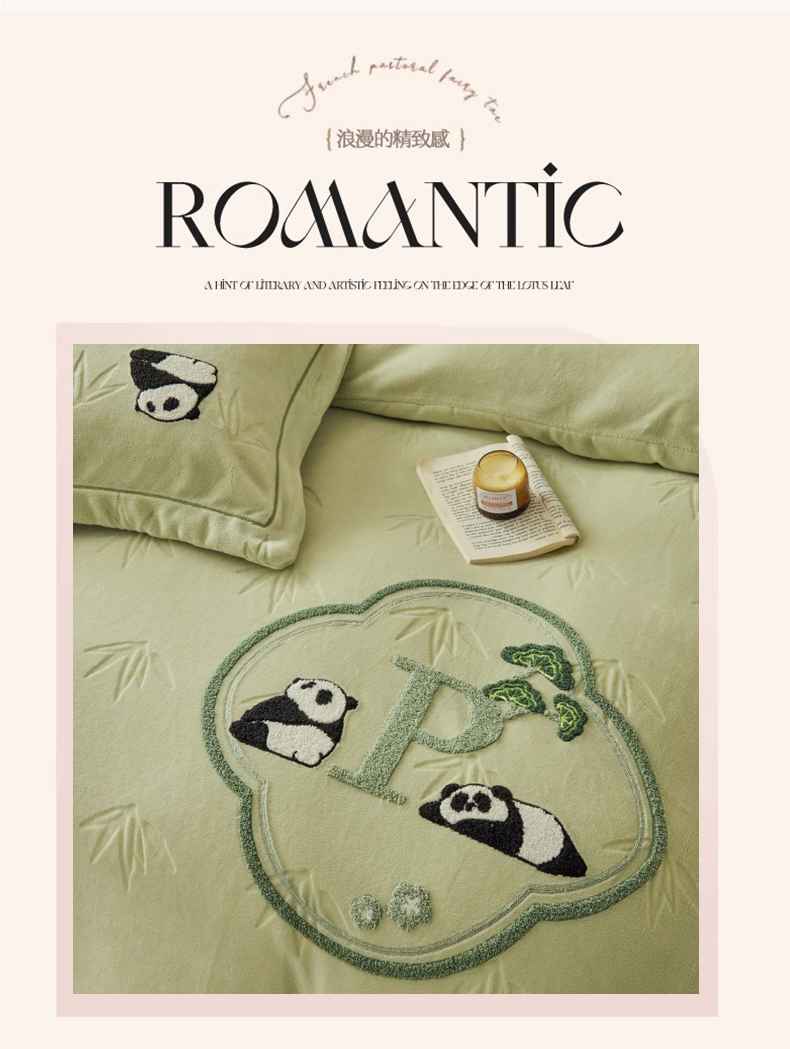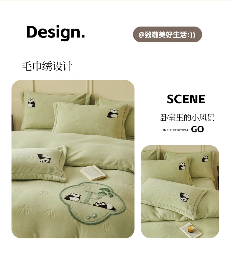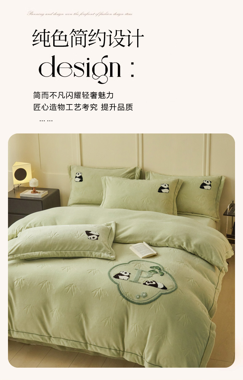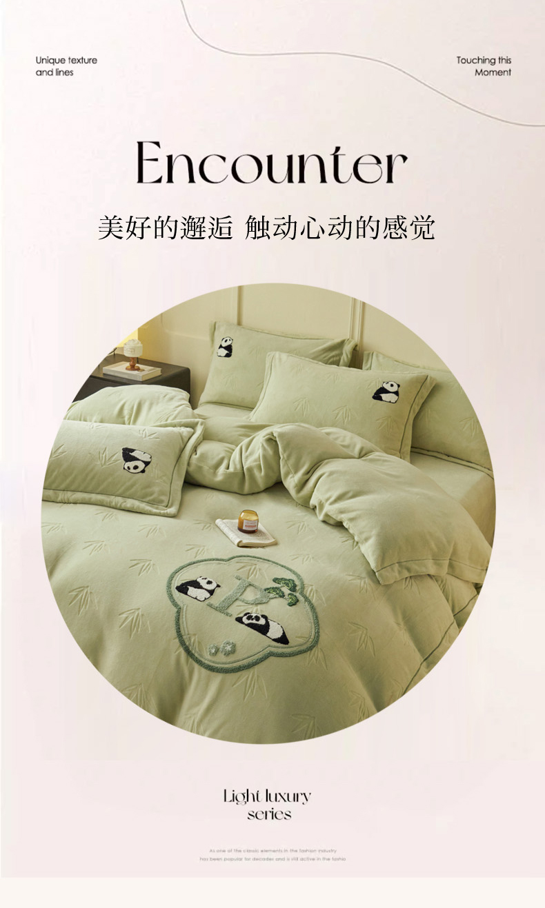 商品名称:恋佳居 2025新款高克重全工艺牛奶绒毛巾绣四件套 中式熊猫绿色