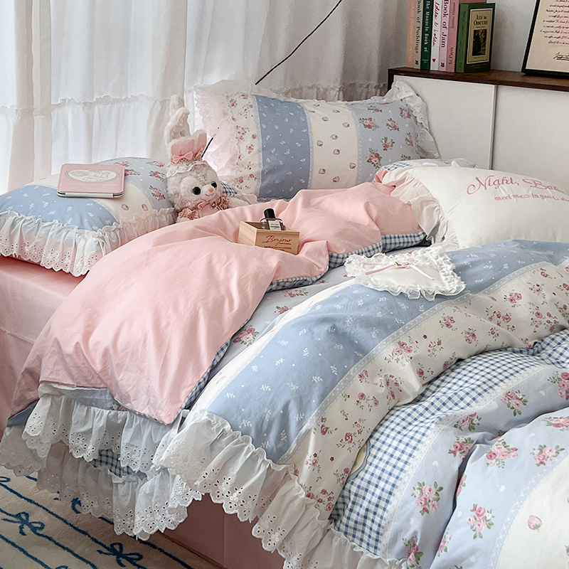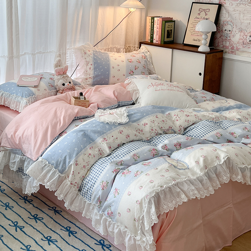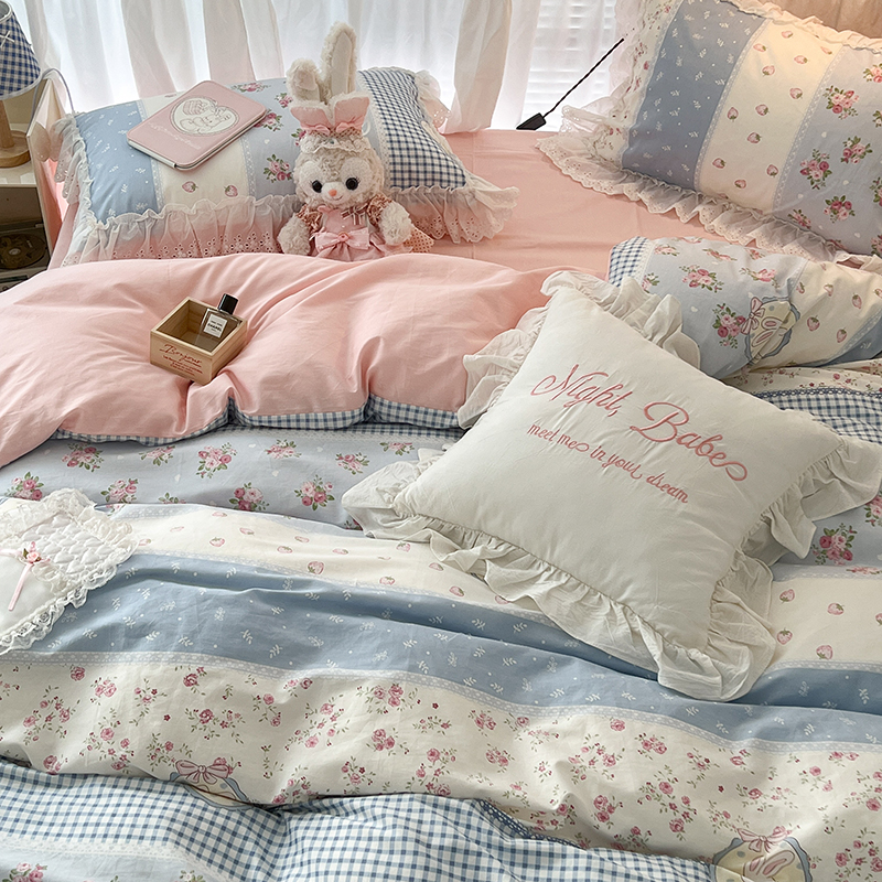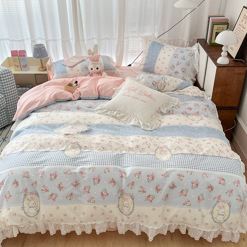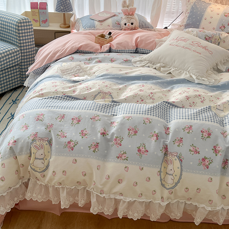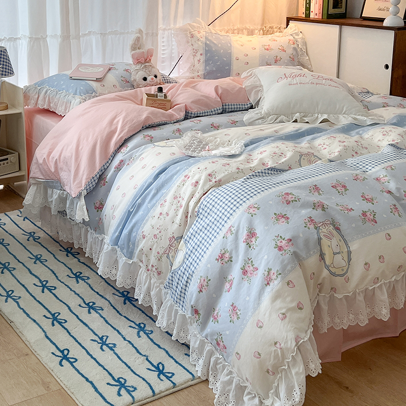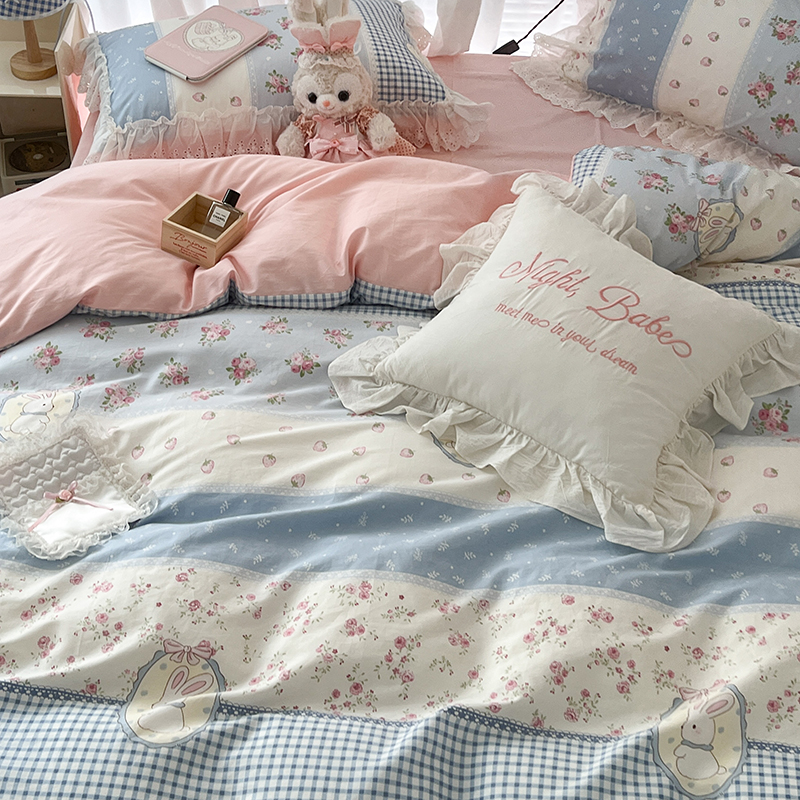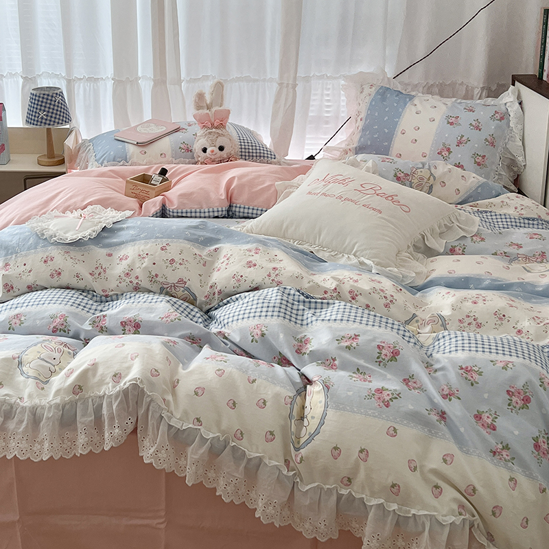 商品名称:昔可家纺 2024新款仙仙蕾丝贴边全棉花边款四件套 仙仙草莓兔