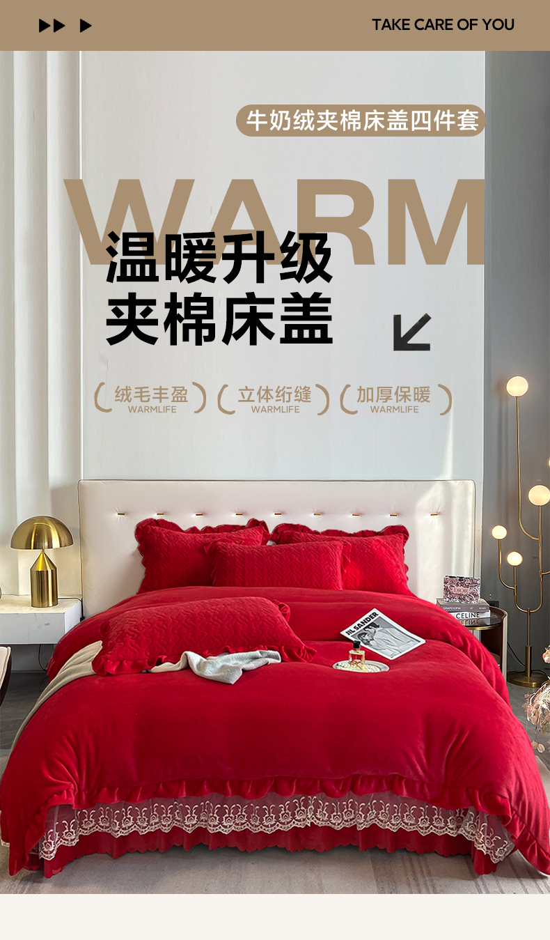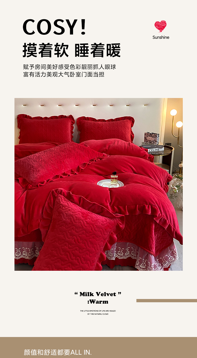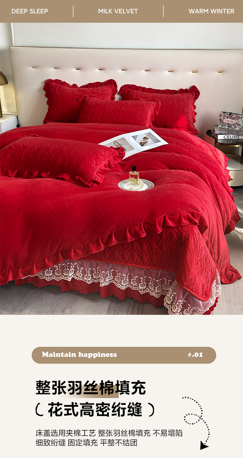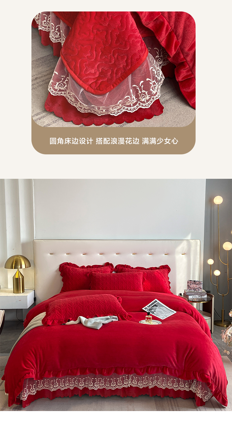 商品名称:畅畅家纺 2024新款冬季韩版花边蕾丝牛奶绒床盖四件套 大红