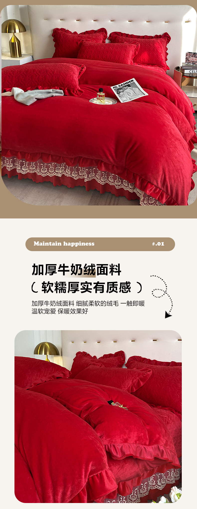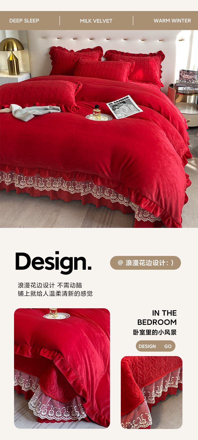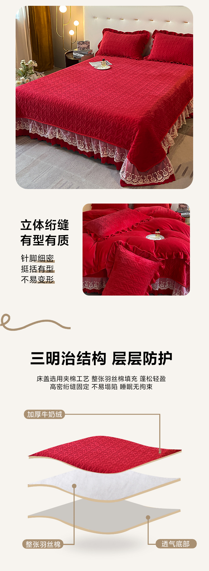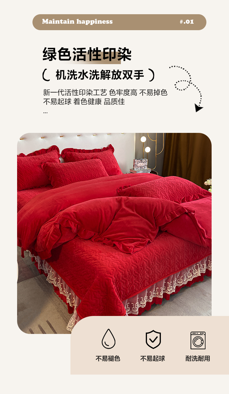 商品名称:畅畅家纺 2024新款冬季韩版花边蕾丝牛奶绒床盖四件套 大红