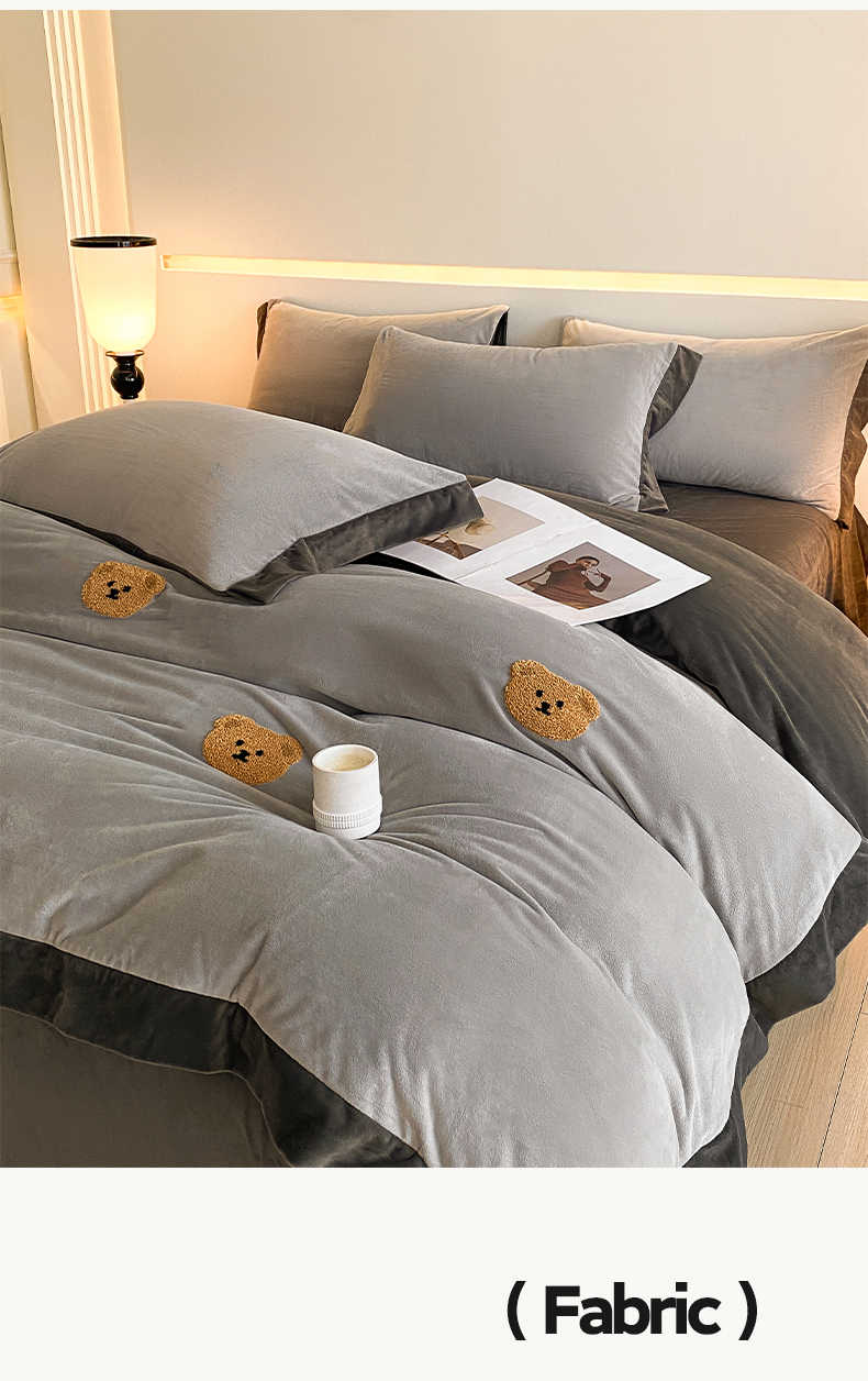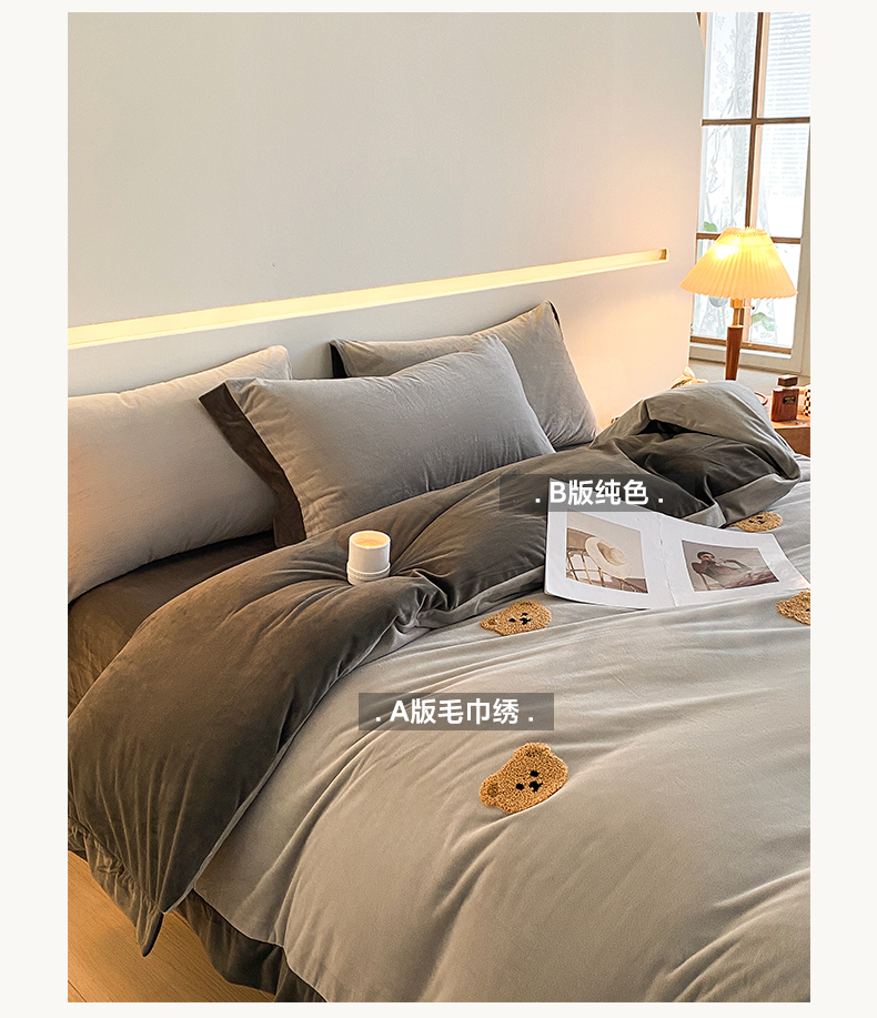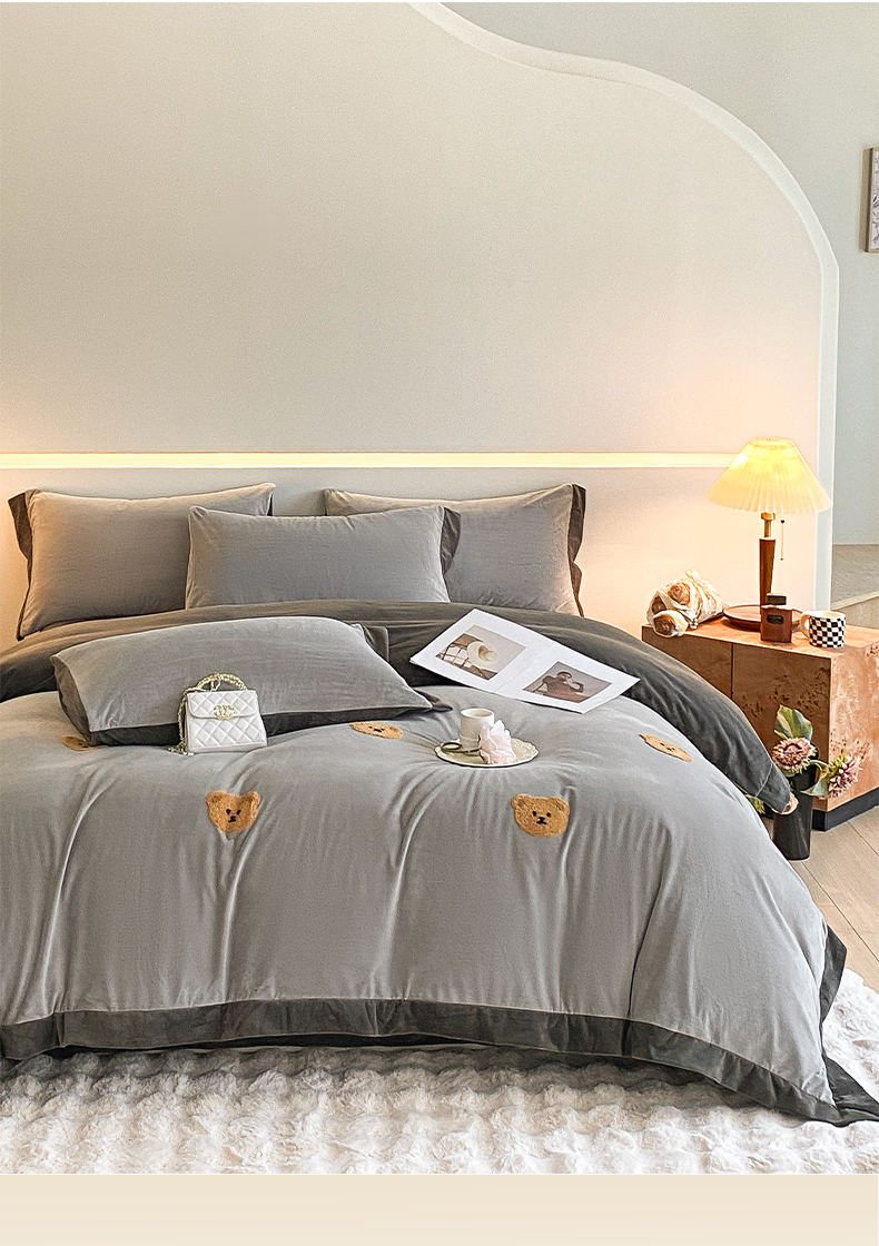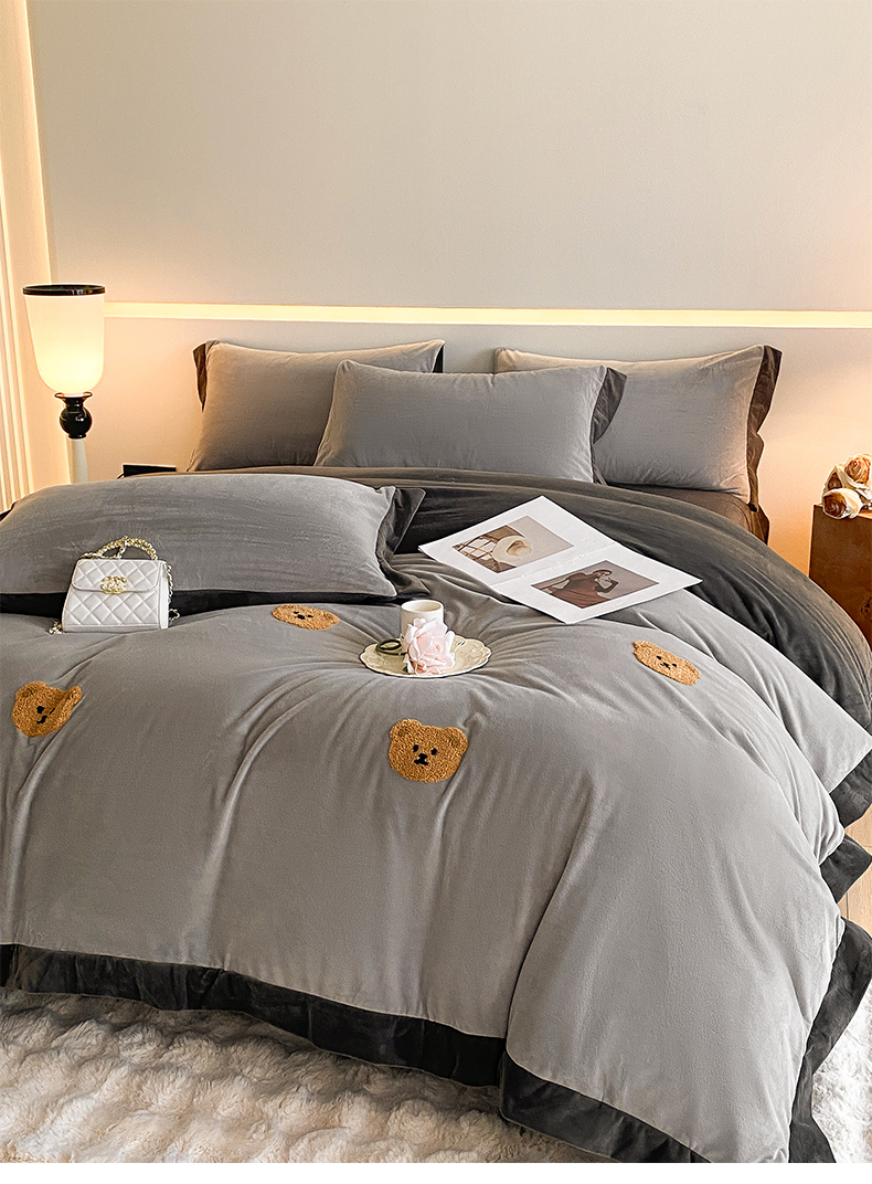 2024新款水晶绒拼角满版毛巾绣四件套 小熊-星辰银