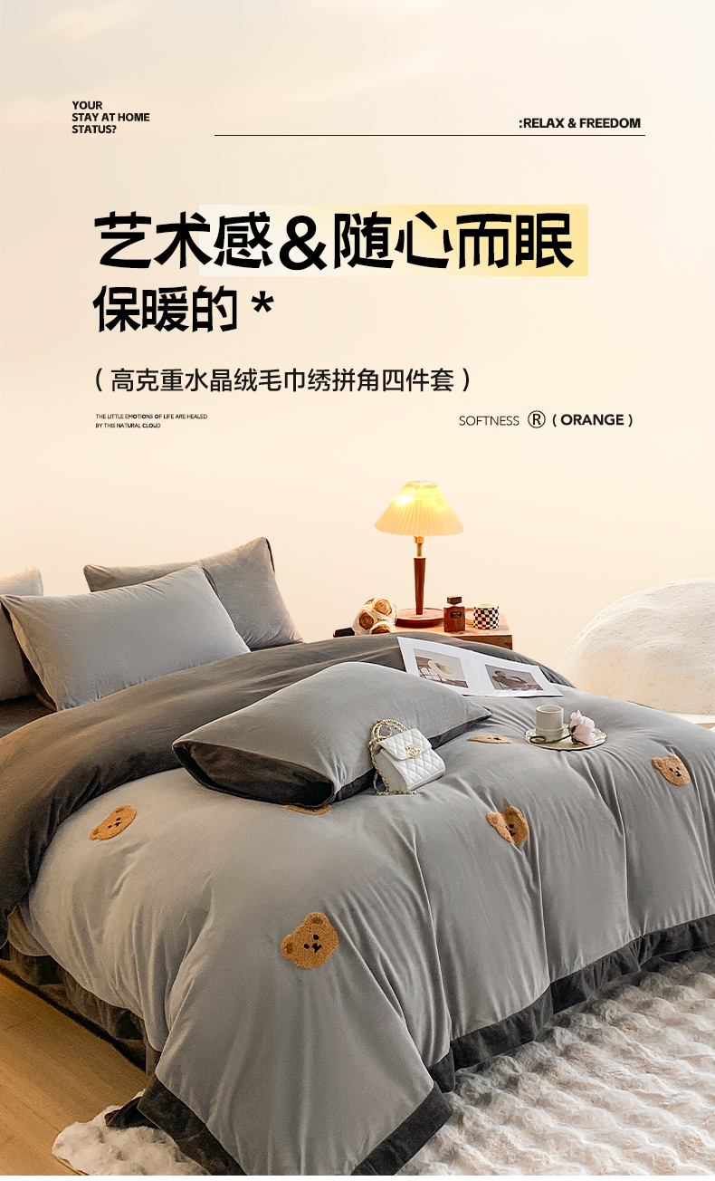 (总)如一 2025新款水晶绒双拼刺绣四件套轻羽系列-系列二,轻羽-典雅灰,轻羽-落日橙,轻羽-奶白咖,轻羽-深灰银,轻羽-雾蓝灰,轻羽-豆沙灰
