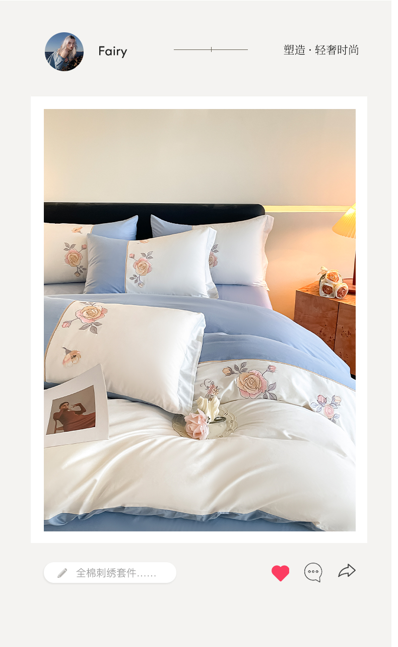 (总)理想家家纺 2025新款纯棉轻奢刺绣四件套--心愿系列场景二,心愿粉,心愿红,心愿黄,心愿蓝