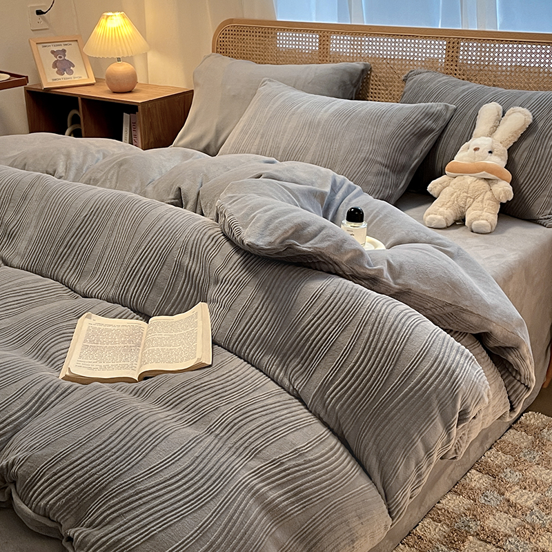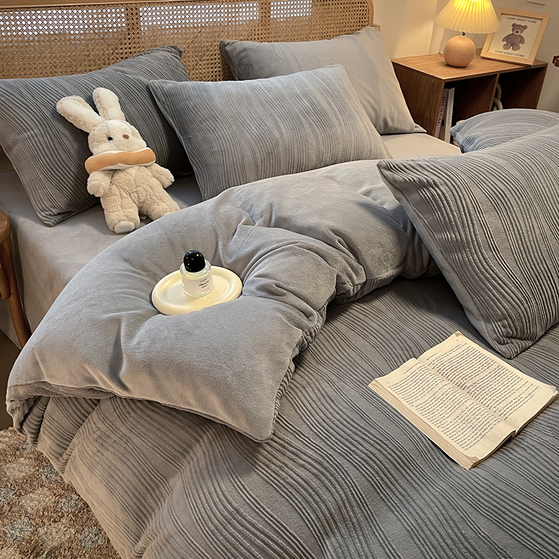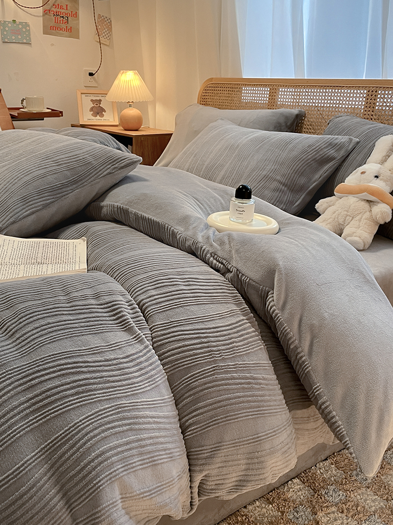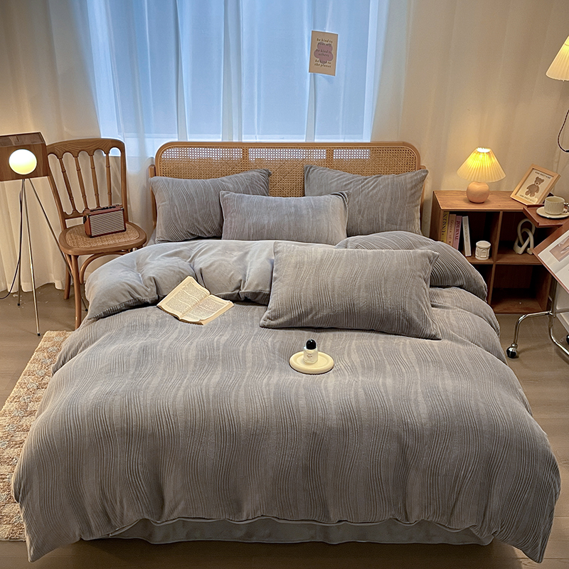 莱茵 2024新款高克重牛奶绒雕花烂花简单款四件套巴克曼-浅灰