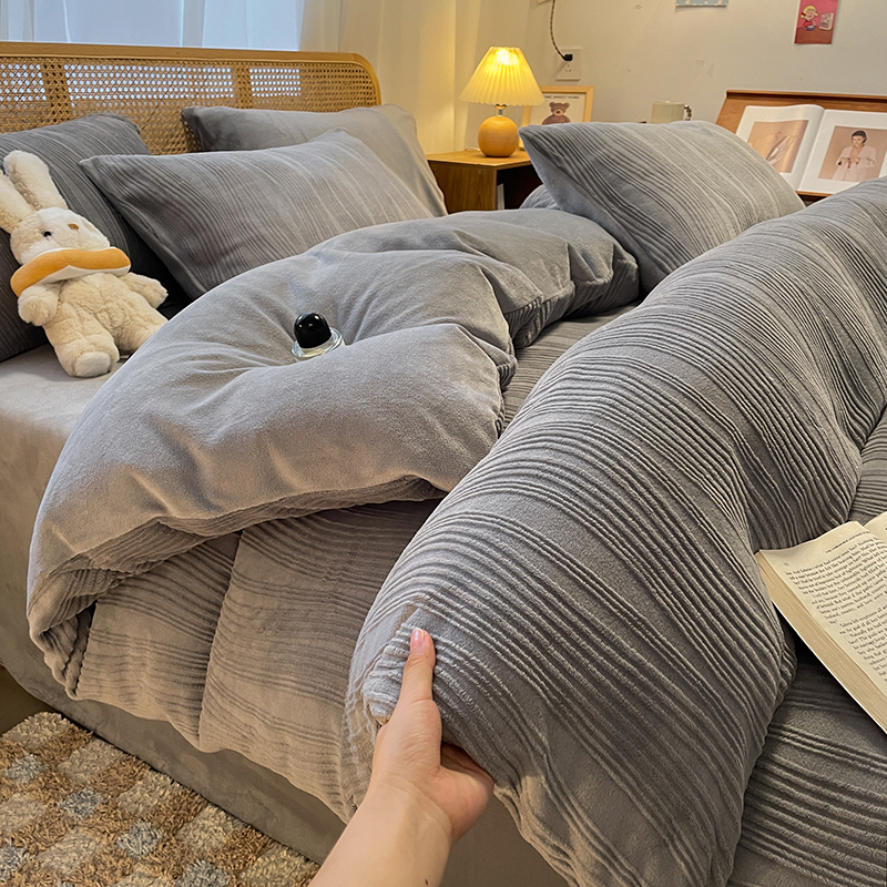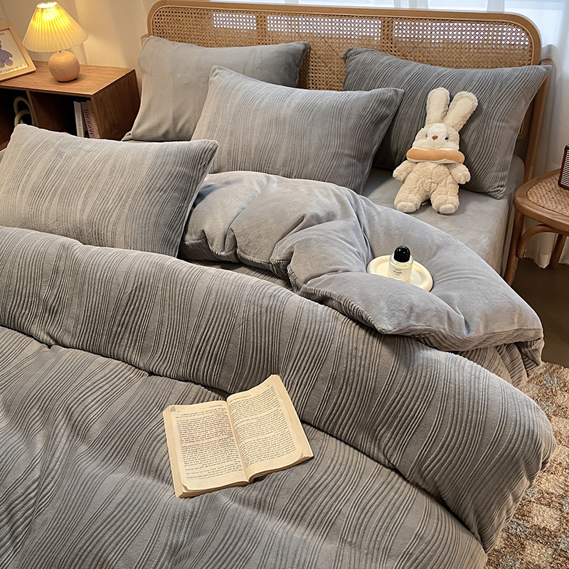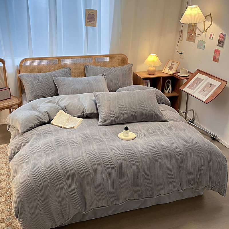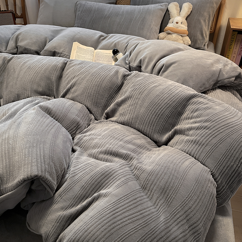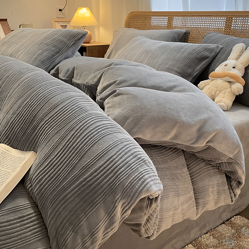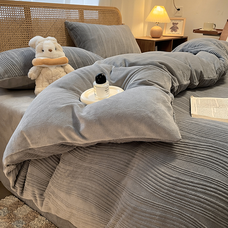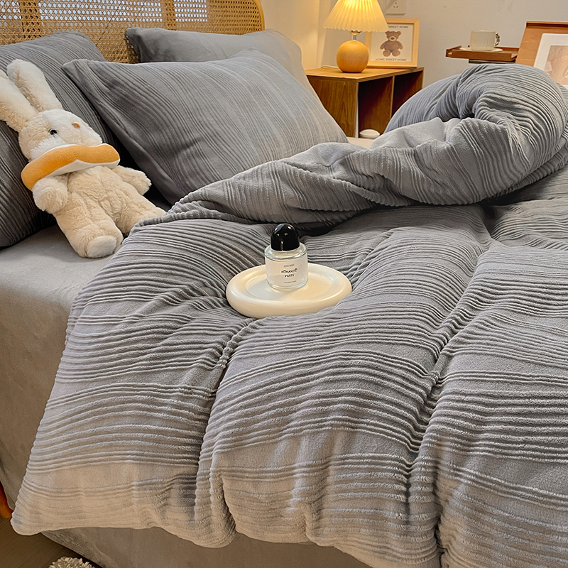 商品名称:莱茵 2024新款高克重牛奶绒雕花烂花简单款四件套巴克曼-浅灰
