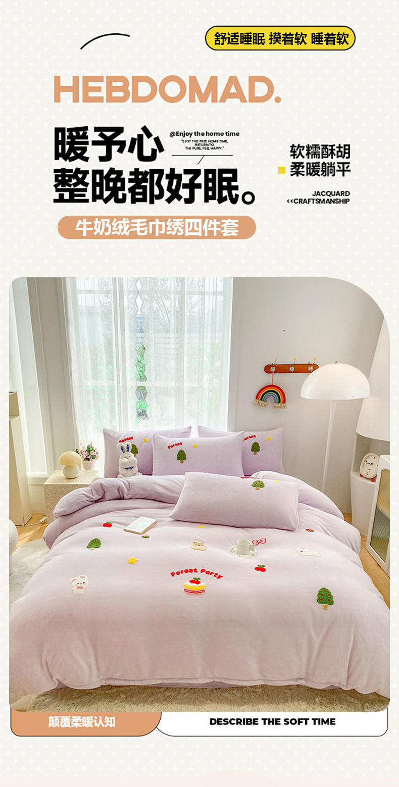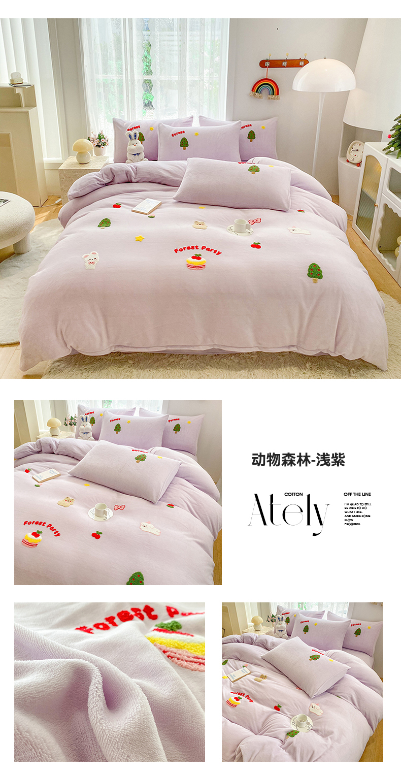 当前位置: 91家纺网 > 商品网购 > 床品套件 > 四件套 > 牛奶绒四件套 > 眷恋家纺 2025新款牛奶绒毛巾绣四件套 动物森林-浅紫