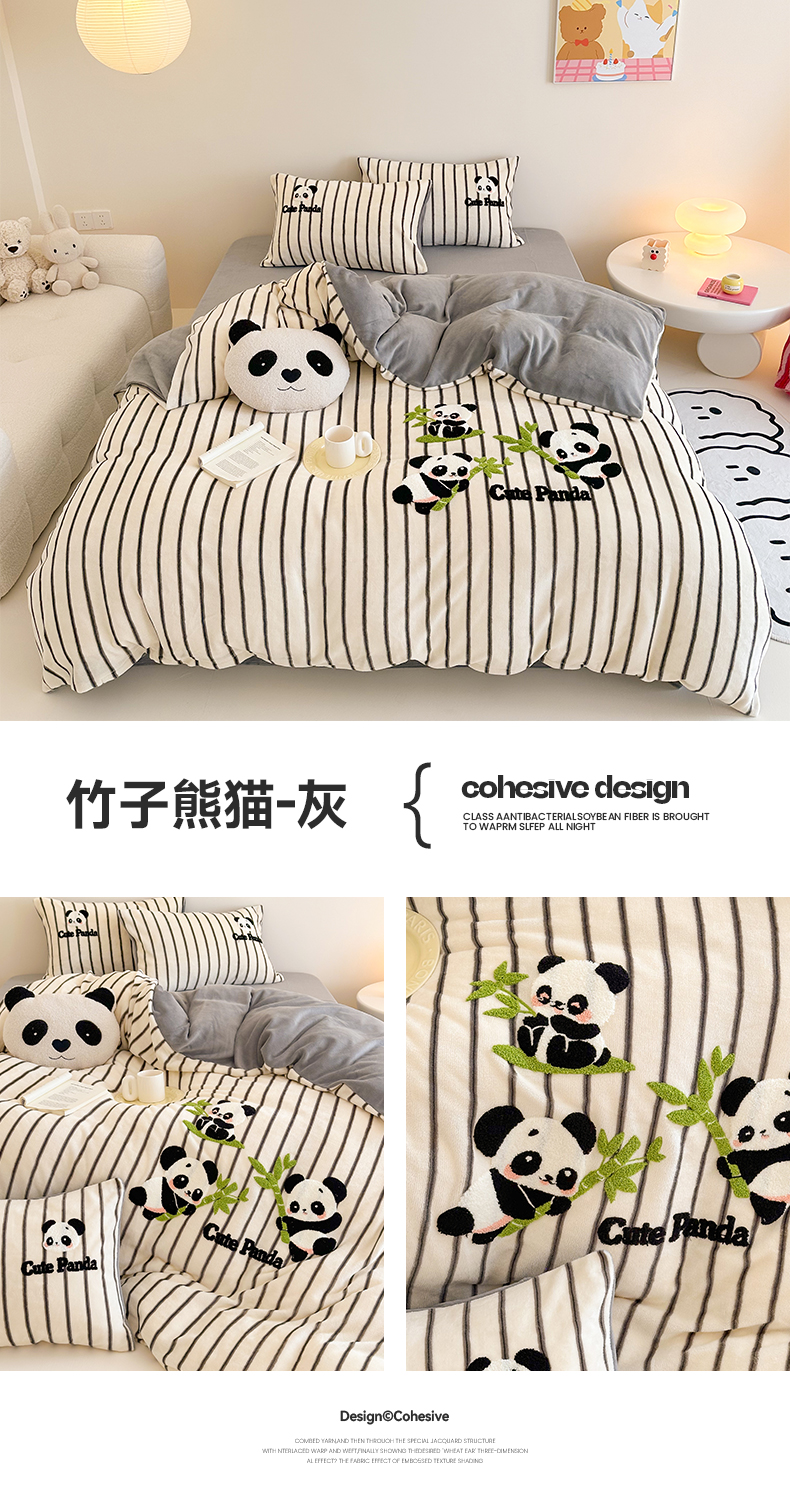 商品名称:沐棉家居 2024新款高克重条纹牛奶绒毛巾绣四件套 竹子熊猫-灰