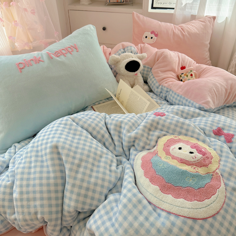 顾里家纺 2024新款印花牛奶绒毛巾绣四件套 蛋糕花猫