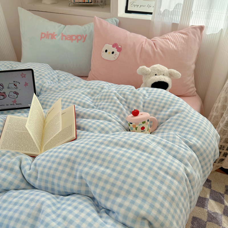 (总)顾里家纺 2024秋冬新款格子猫咪毛巾绣牛奶绒四件套,粉格猫咪,黄格猫咪,咖格猫咪,蓝格猫咪,绿格猫咪